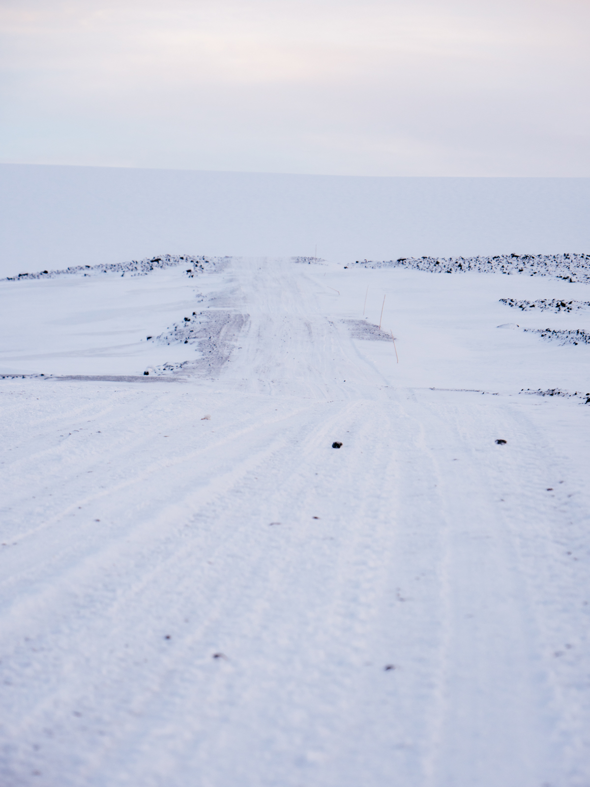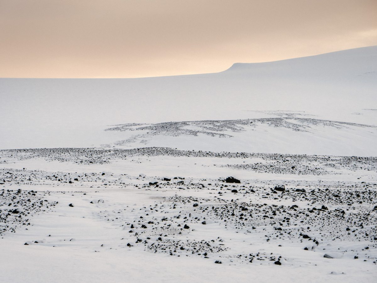 After a while, the sunlit expanse of Langjökull appears, filling the horizon like a frozen tsunami. Villi’s jeep powers through the snow to the base of the glacier, and we step out into a majestic pink-hued icescape. Some locals are returning in a train of 4x4s from a GPS-guided drive over the ice, and a row of snowmobilers soon follows. It’s the most traffic we’ll see all day.