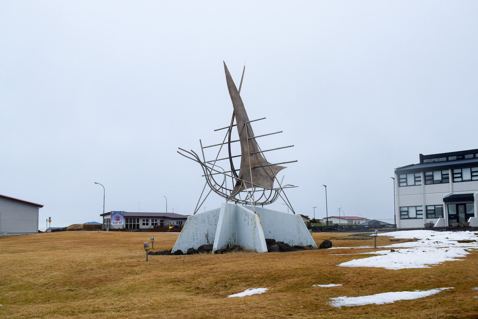 Hellissandur is home to a Maritime Museum, but it was closed when we visited, and the distinctive statue of a fisherman teaching a child how to gut a fish was gone from its plinth. A garden full of whale bones and two turf houses, however, were visible. Behind the museum, however, a wooden stairway leads over a ridge into a lava field, where you can take an engaging short hike through the rugged rocks along some easy trails.