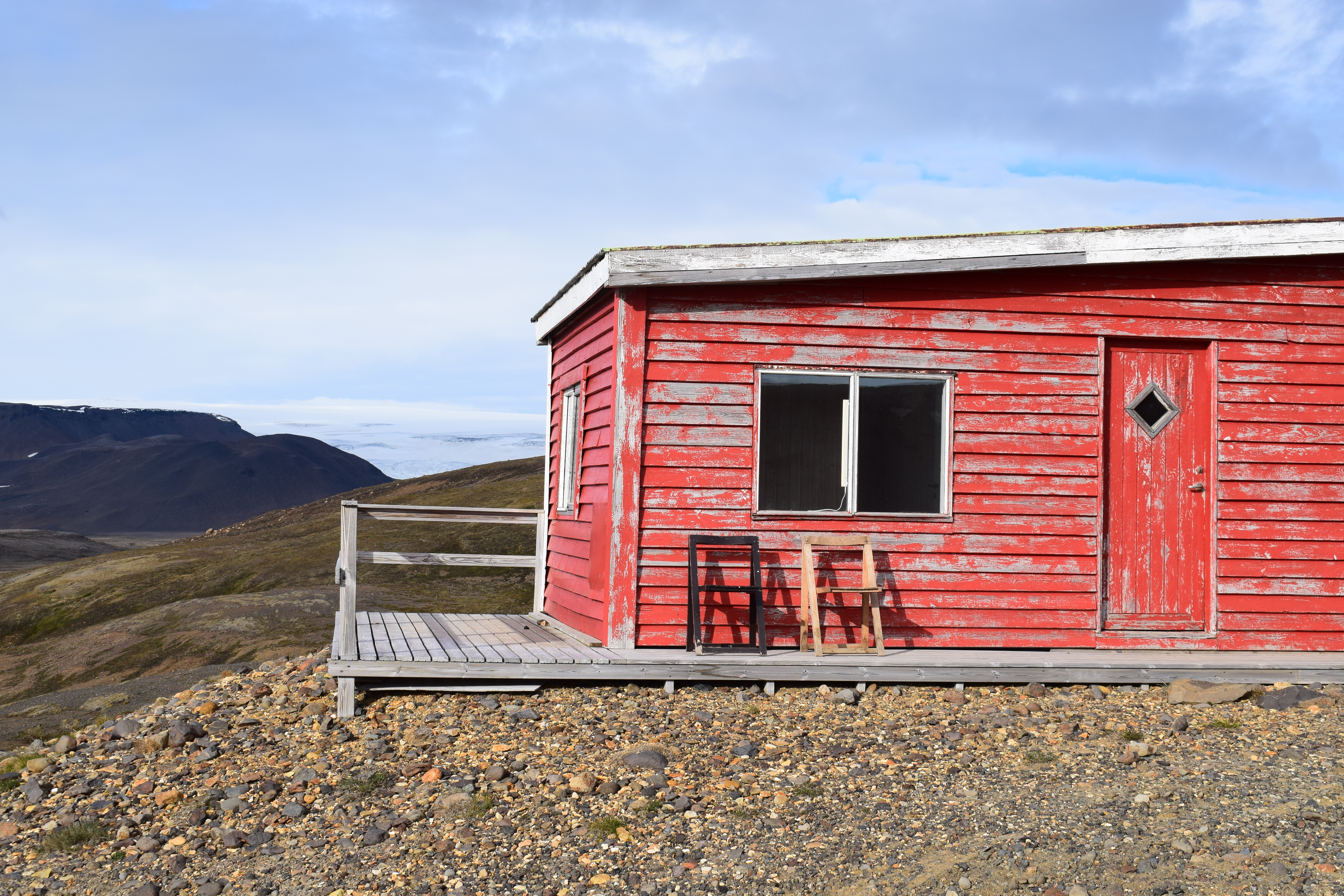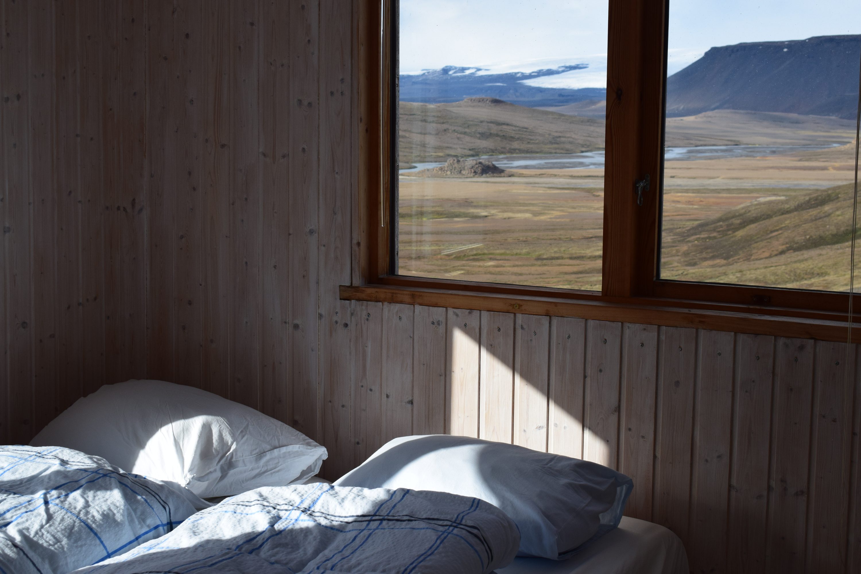 We receive keys to La Plata, a charming and basic cabin overlooking the valley, its red paint weather-worn by rough seasons. What it lacks in facilities, it makes up for with views; from our bedroom windows, we see the glaciers Langjökull to the northwest and Hofsjökull to the northeast.
