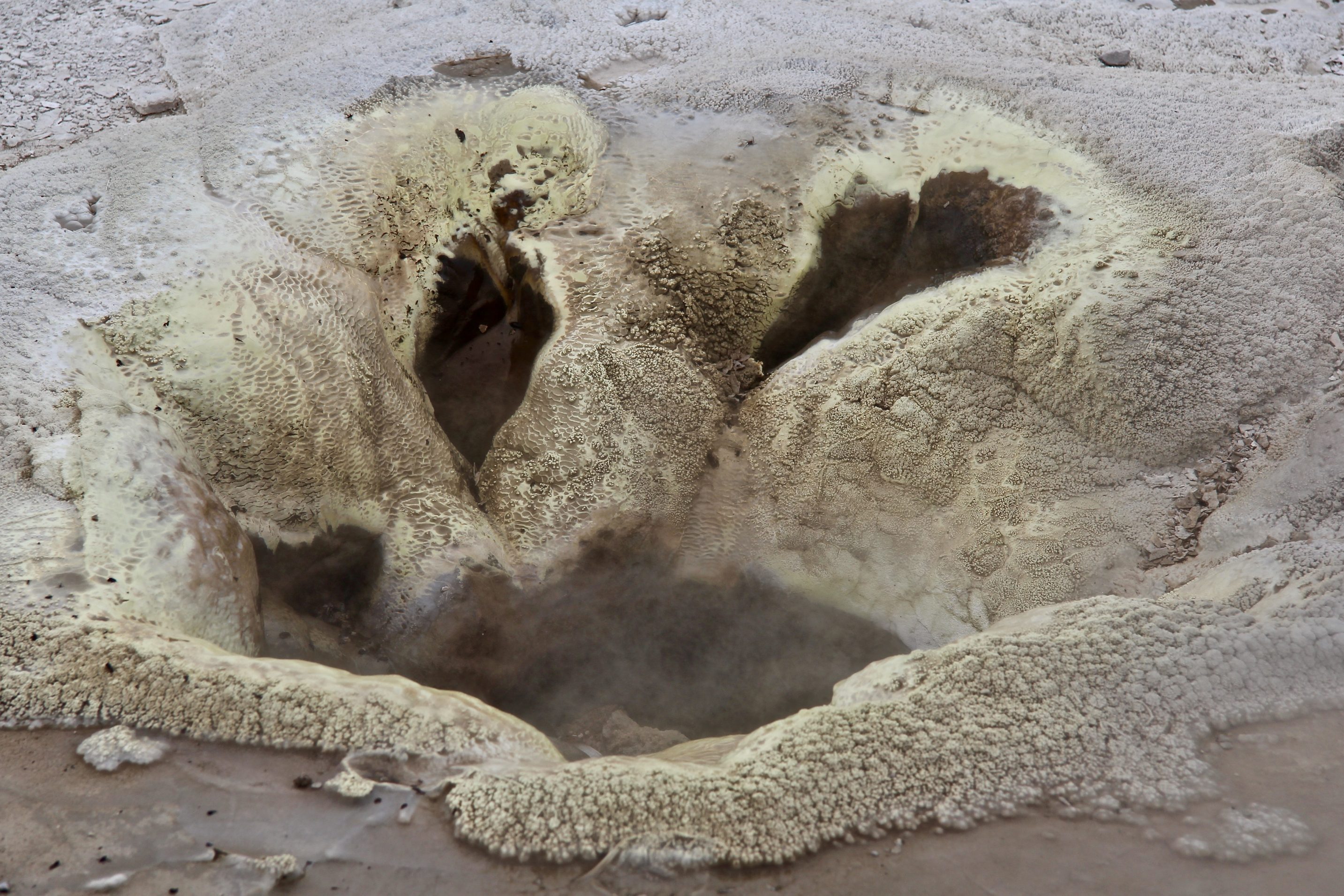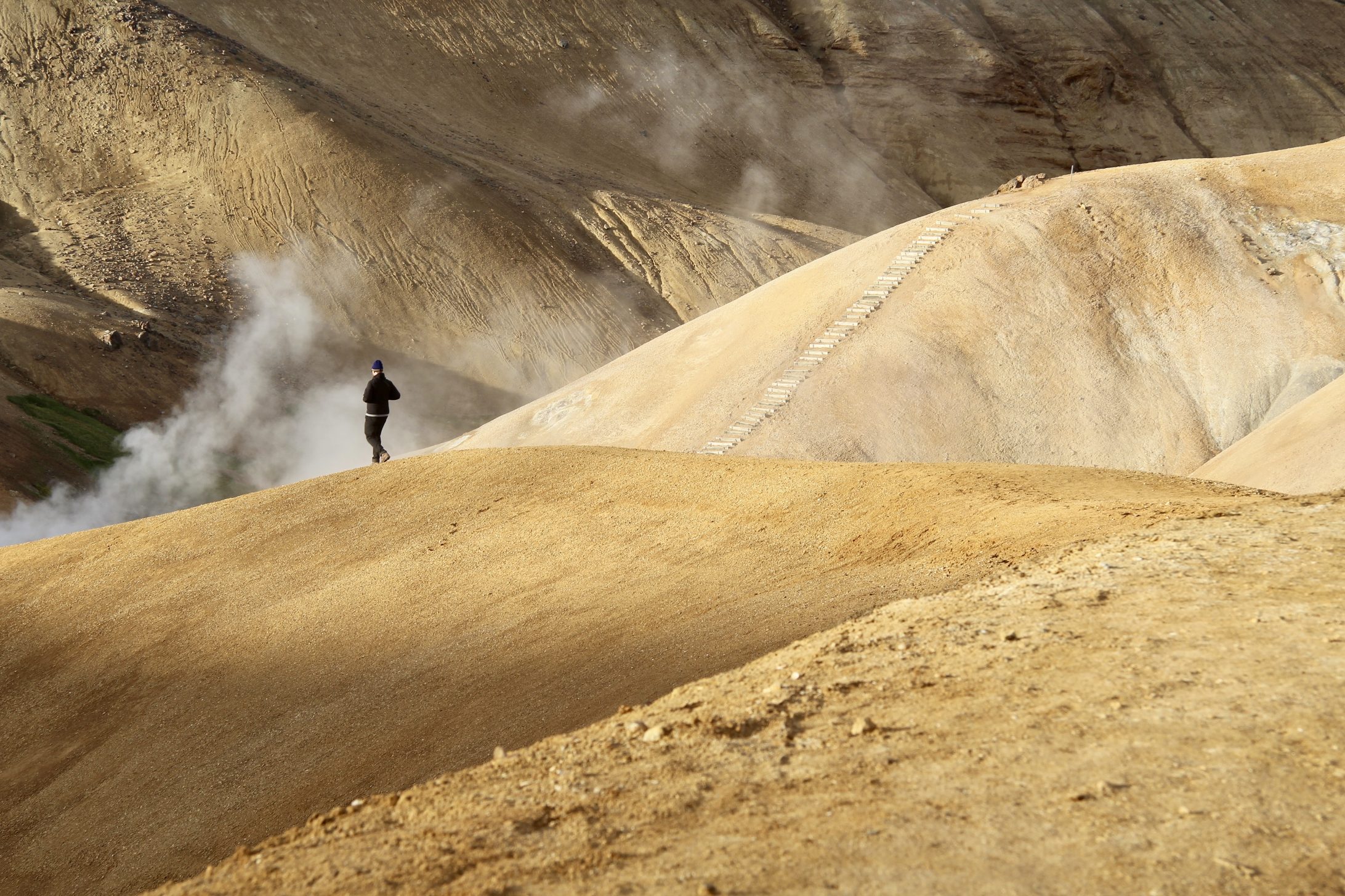 We pick our way carefully, hurriedly down wood planks to the first sulphuric fumarole. Steam hisses from a vent, and water boils beneath the earth’s surface. We lay down by the phenomenon to angle our ears closer to the geothermal soundscape.
