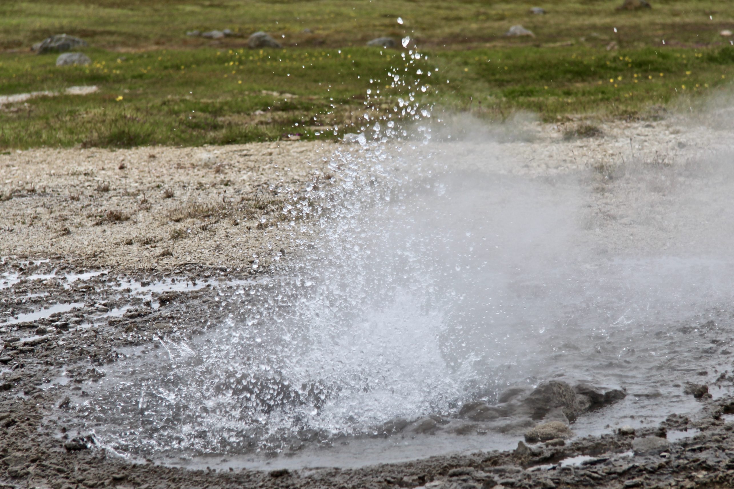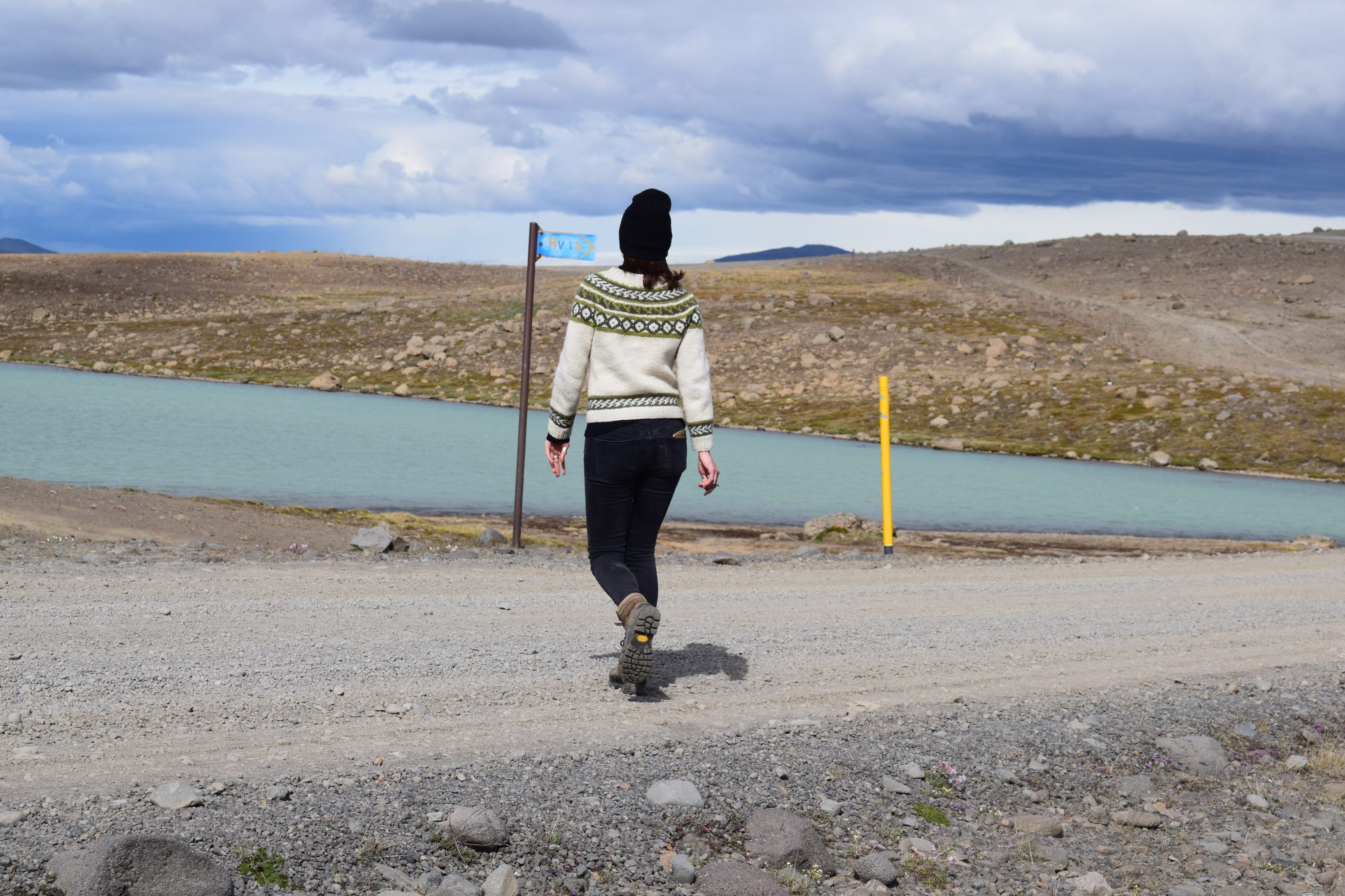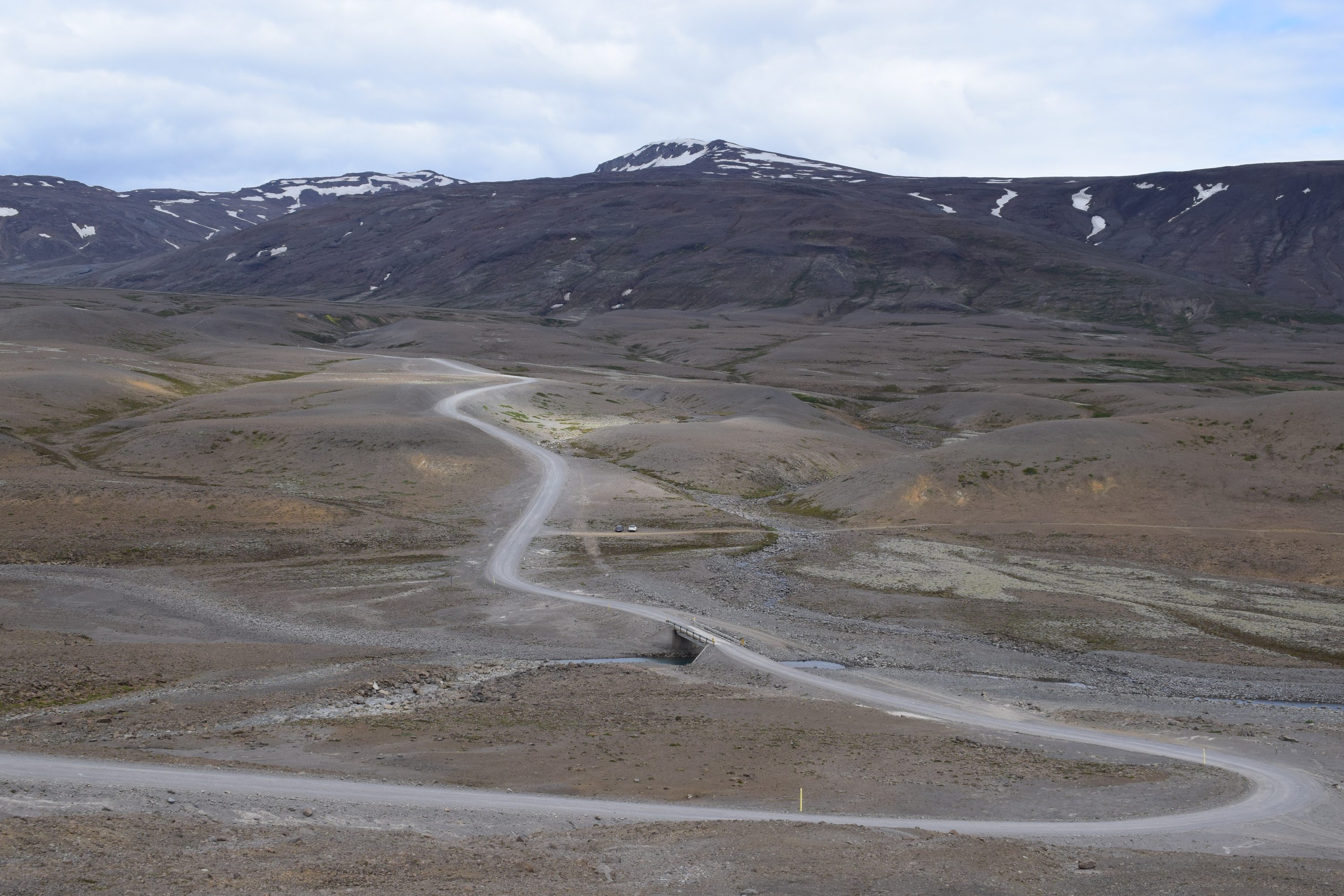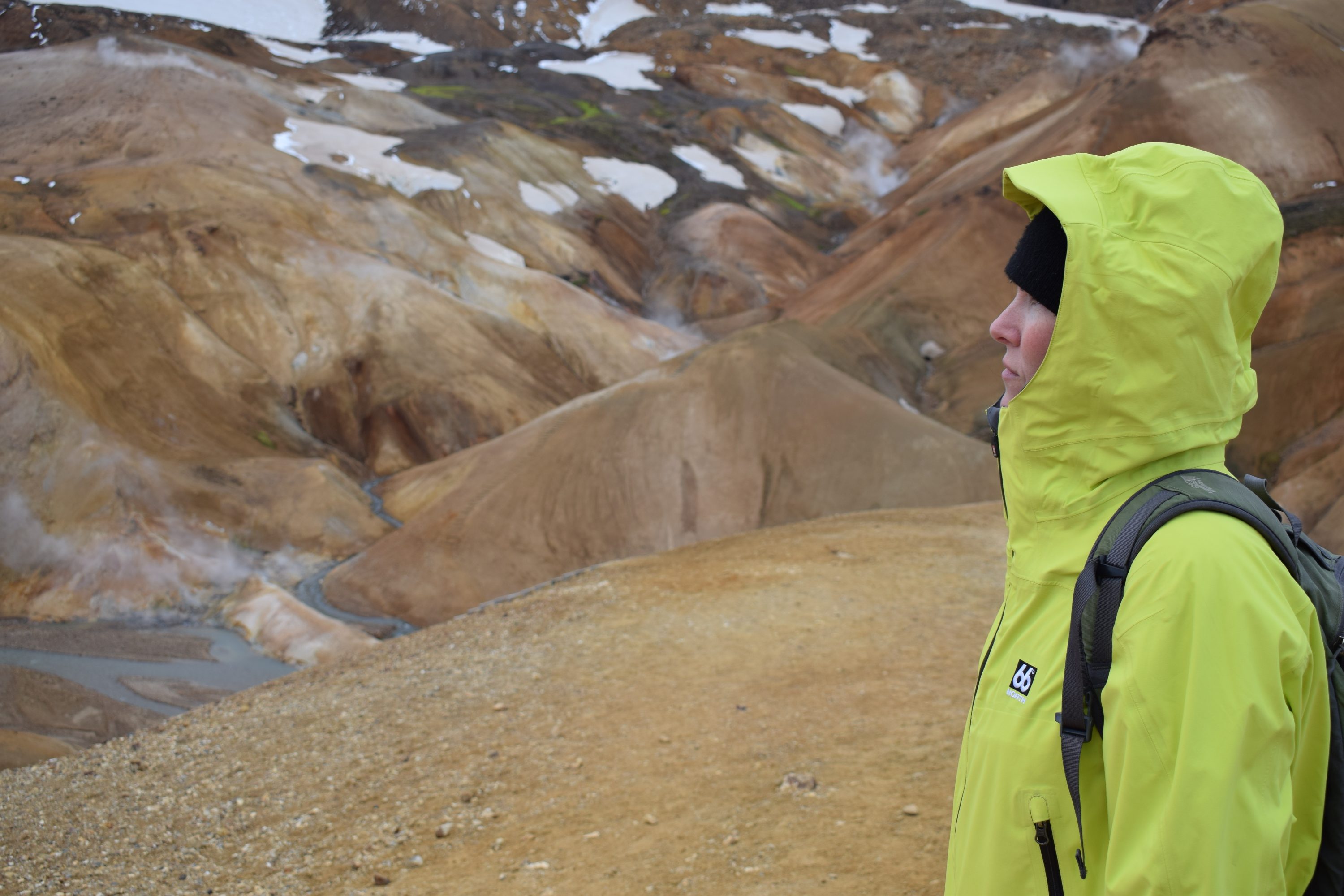 After a sumptuous sleep in La Plata, we awake to full sun and two glaciers. Our trusty steed gallops again over the rocky F-road of Kjölur as we wind our way north to the geothermal oasis of Hveravellir. This valley is marked by multiple small geysers and calcified rock formed from hot water flowing in thin bursts over years. Peculiar mounds of sulphur belch fumarole steam into the air. We’ve found yet another hot spot in Iceland’s vast inland desert. Each geyser boils a different rhythm, and we delight at the tiny eruptions spitting water from underground.