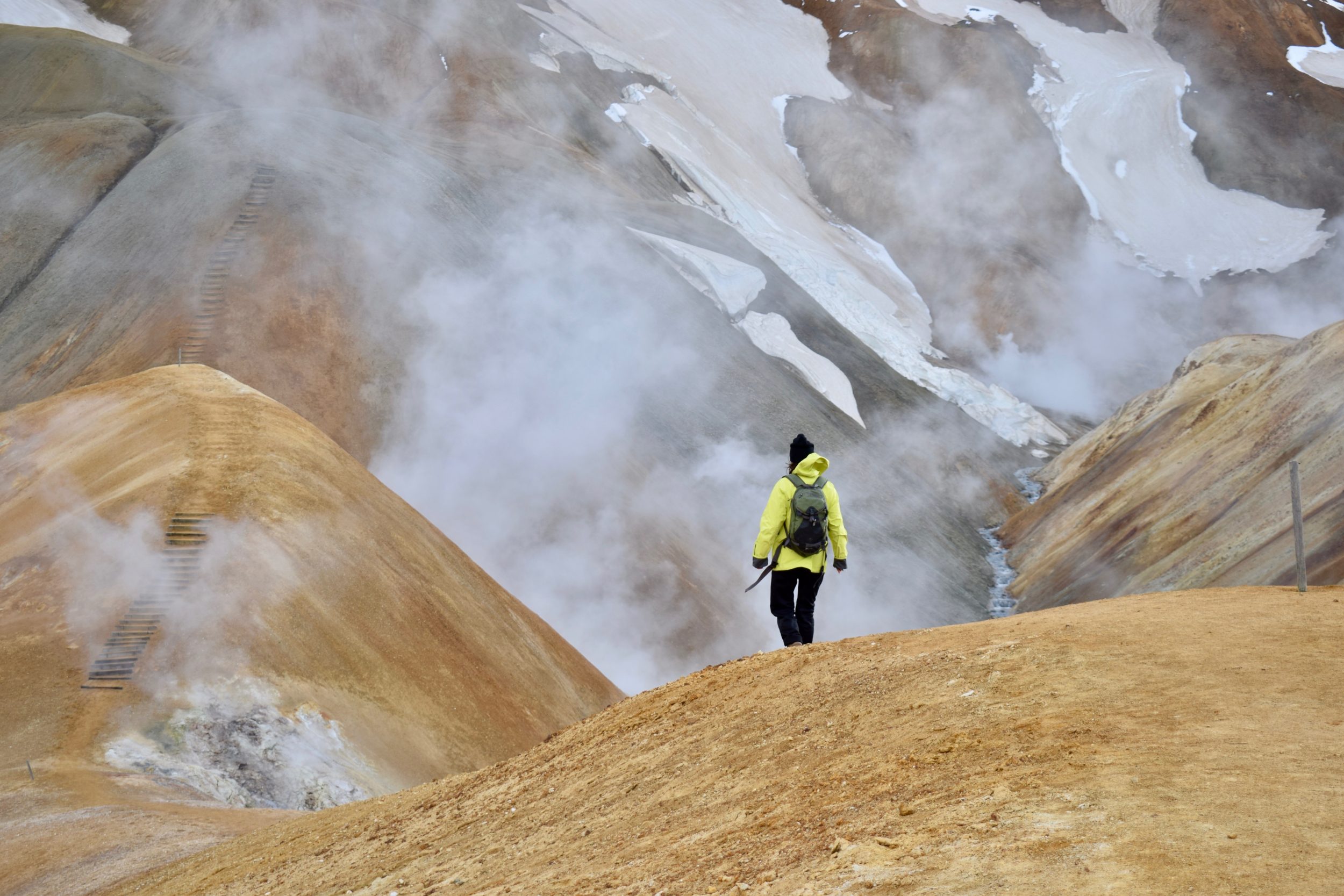 After dinner, with the sun beaming as though mid-day, we set out for the geothermal wonders of Kerlingarfjöll. One of the largest geothermal areas in Europe, its hot springs and mud pools are magic incarnate. Rhyolite scree paints the rolling hills in orange and yellow hues. It is the ultimate solstice destination, and we arrive to find its carefully appointed boardwalks and hill hikes empty of other humans. The air fills with the acrid scent of sulphur, and we gulp in the odd smell—for we know it means geothermal is nearby.