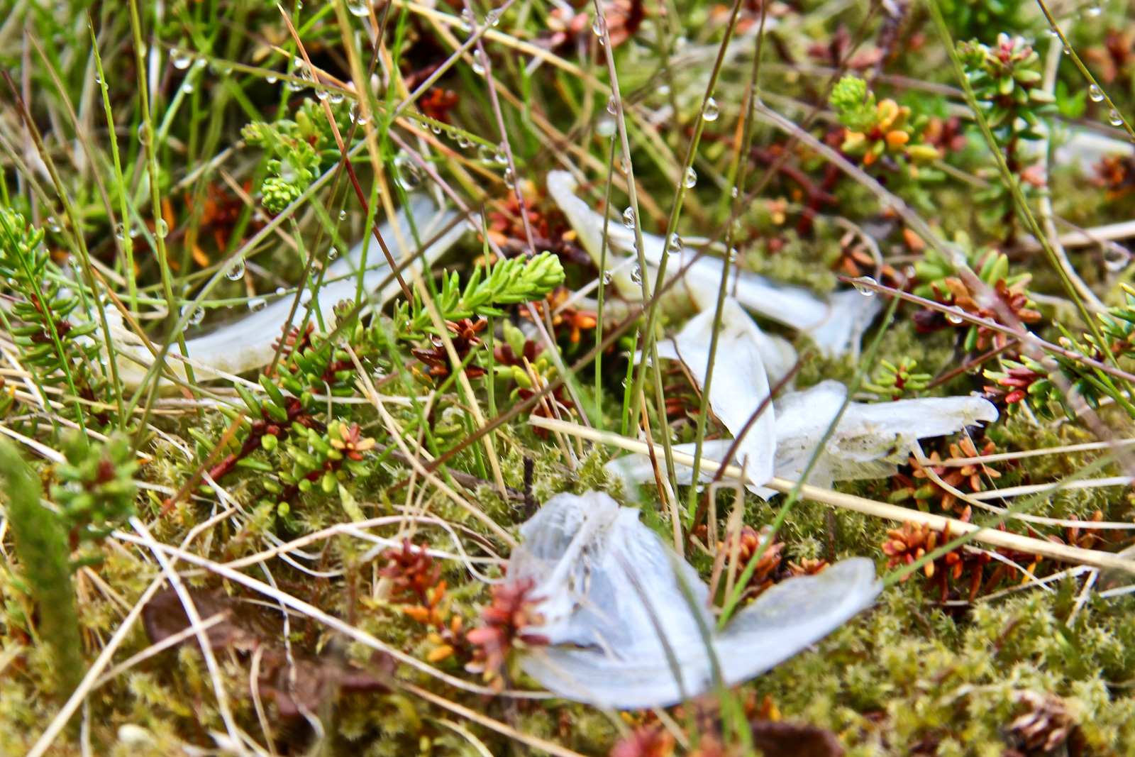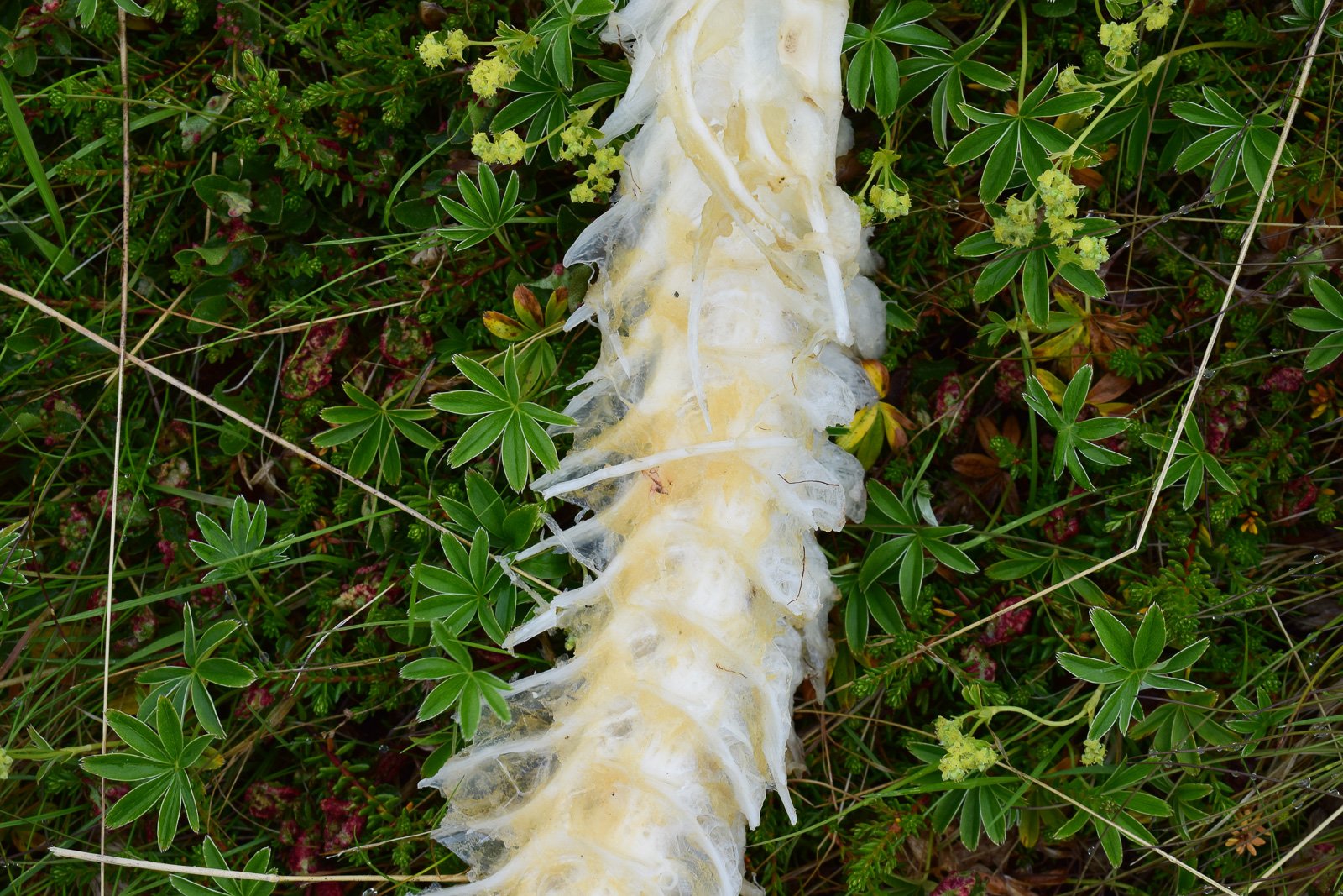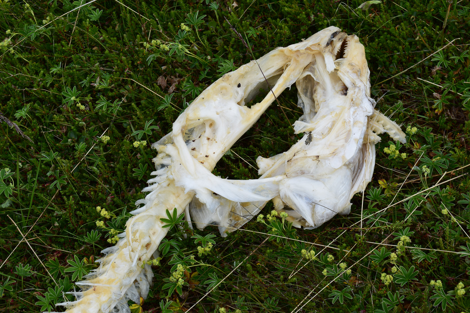 We clamber out of the dinghy, finally setting foot in Hornstrandir. The beach is littered with finds: bird bones and feathers, neatly splayed purple mussel shells bearing giant barnacles, and mangled fish skeletons. All of this, says Eyjó, is evidence of foxes. Natural scavengers, they often come down to the shoreline to feed on the debris left by seals or birds. As we begin the hike, the trail passes plenty of bone piles and gnawed fish carcasses that suggest they may have had some recent success.