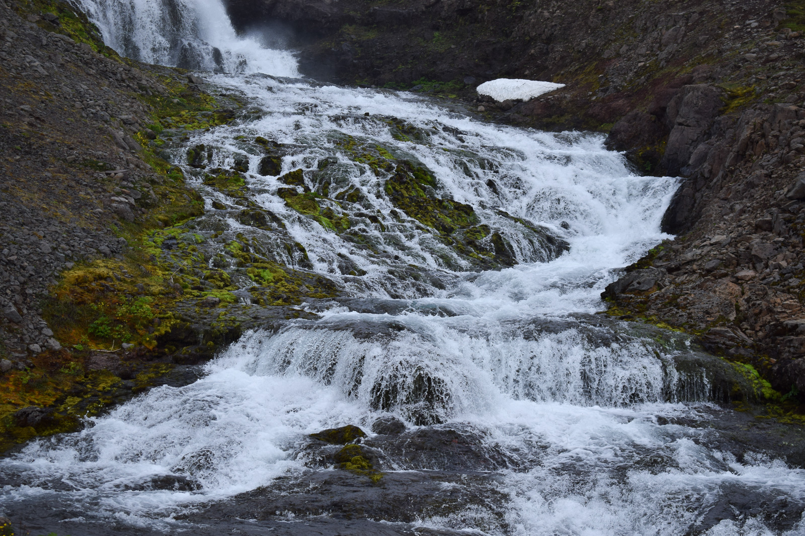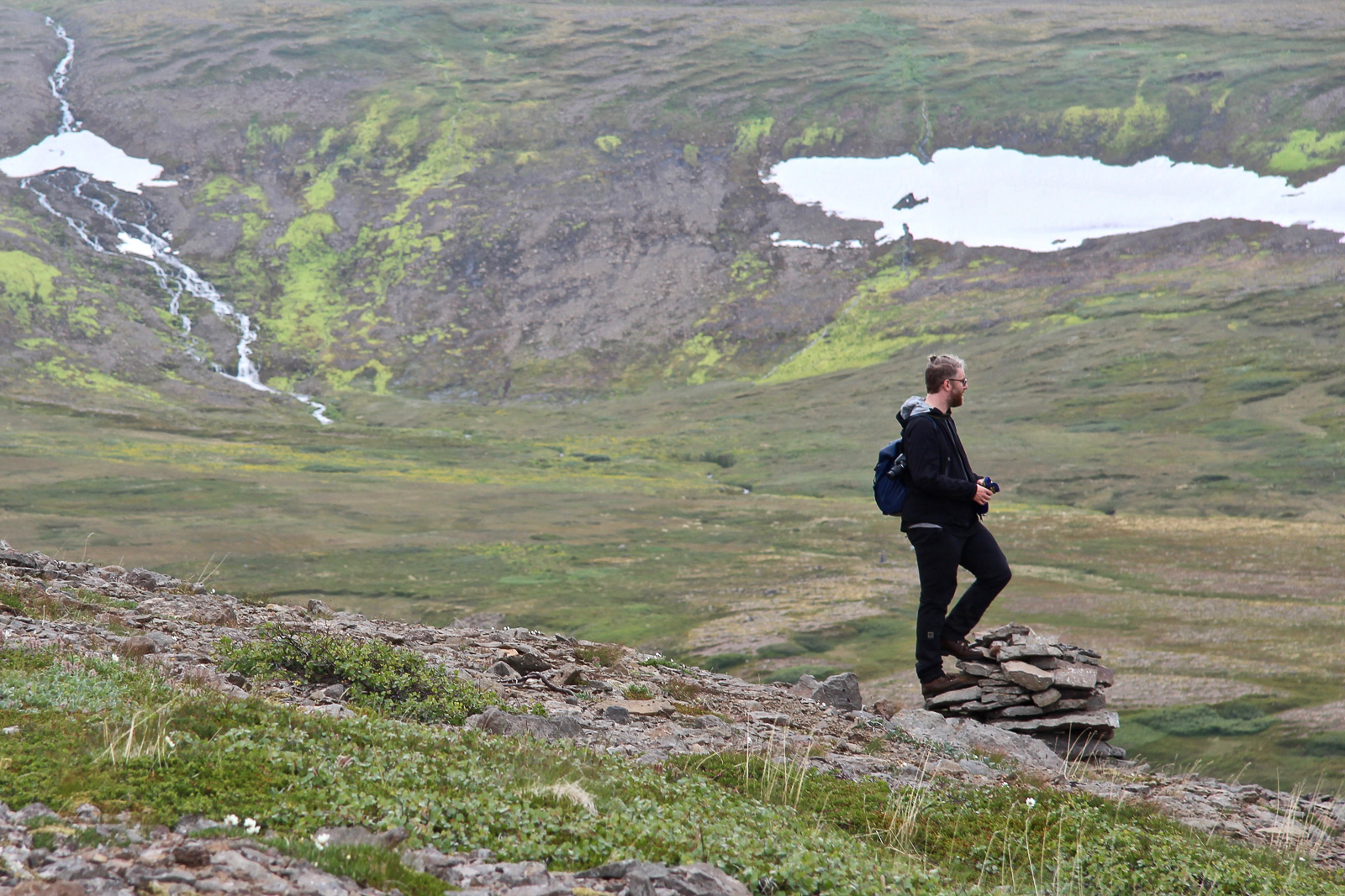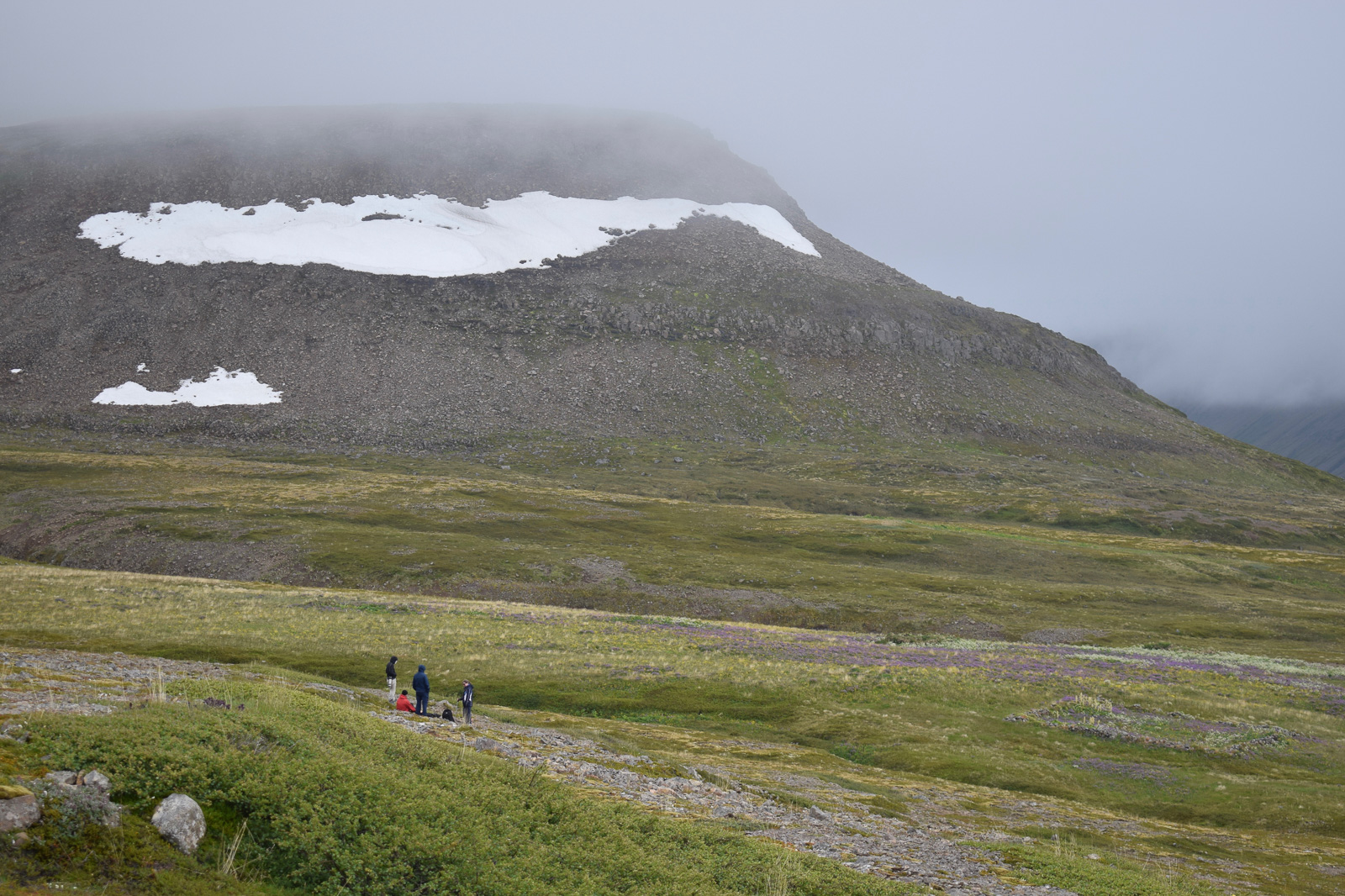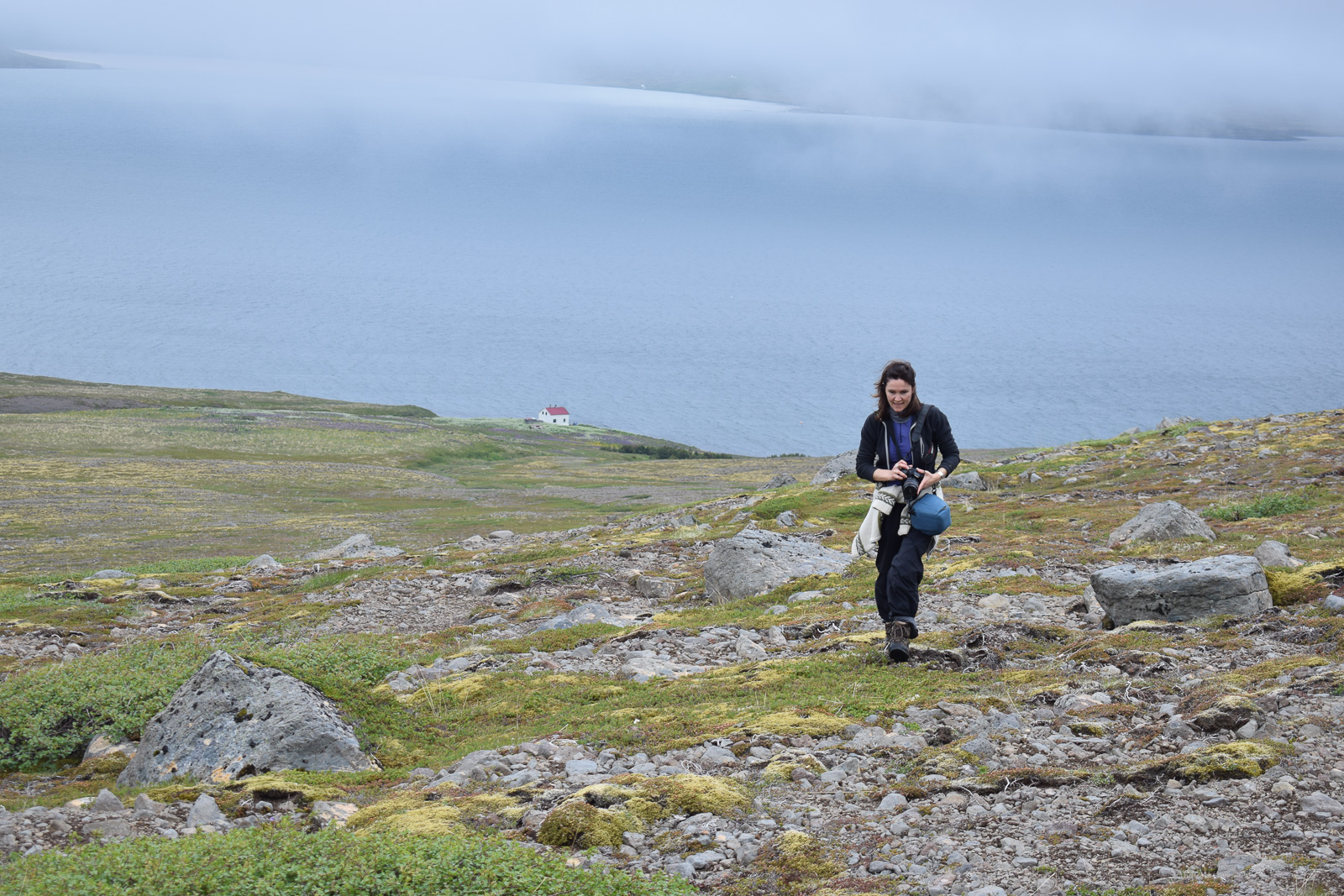 The afternoon draws on, and my companion and I decide to part from the group for a while and hike up the valley. We head towards a waterfall in the middle distance, and fox-signs peter out the farther we get from the den. Kvíar drops out of sight as we cross the lush wetlands, and we pass through meadows of cottongrass, wild angelica and purple creeping thyme, soaking in the sounds, smells and colours of the untouched countryside.