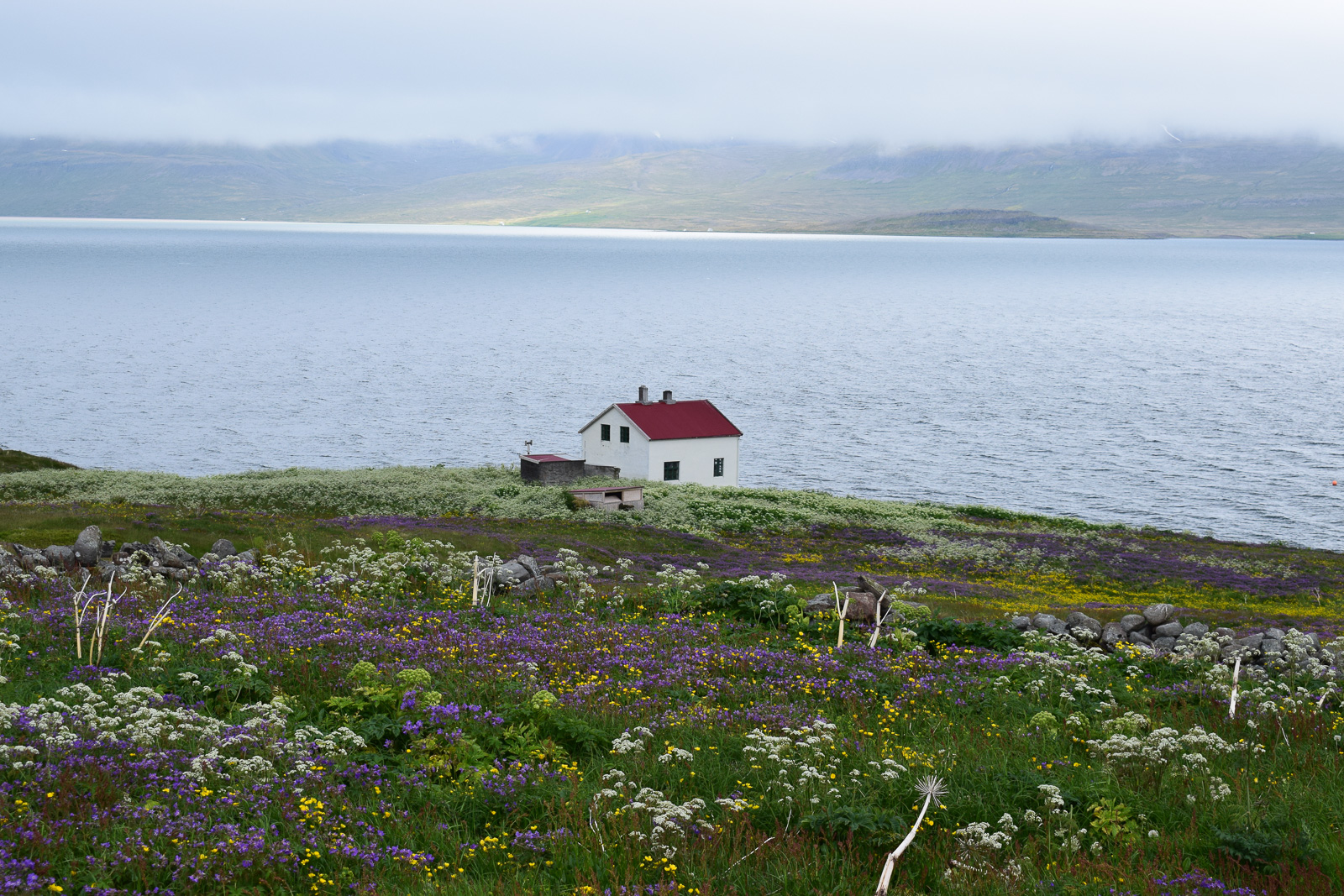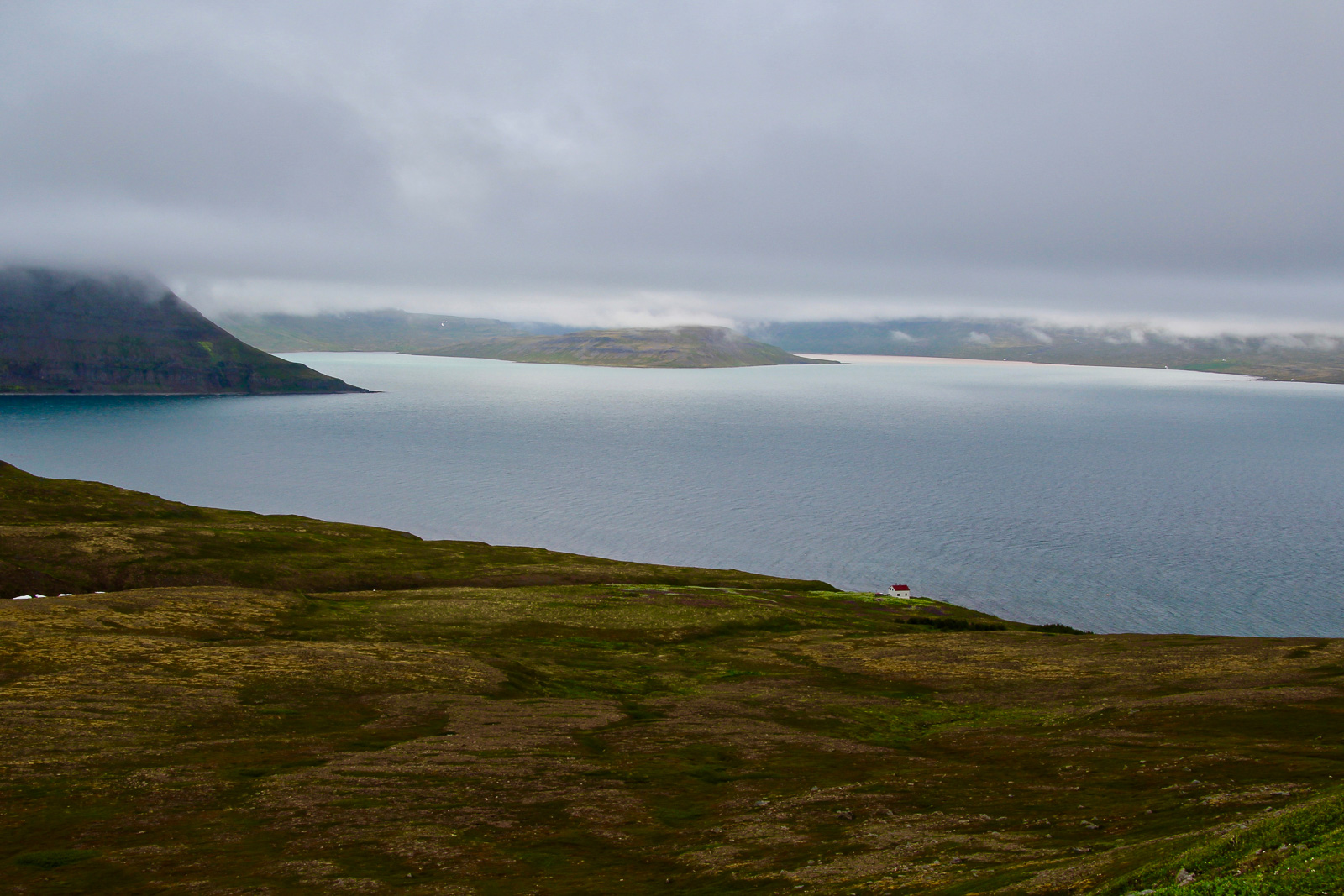 As we hop over streams and pick through patches of marsh, Kvíar finally comes into view. It’s a lonely house that crowns a verdant hill set against a backdrop of steep coastal mountains receding into the mist.
