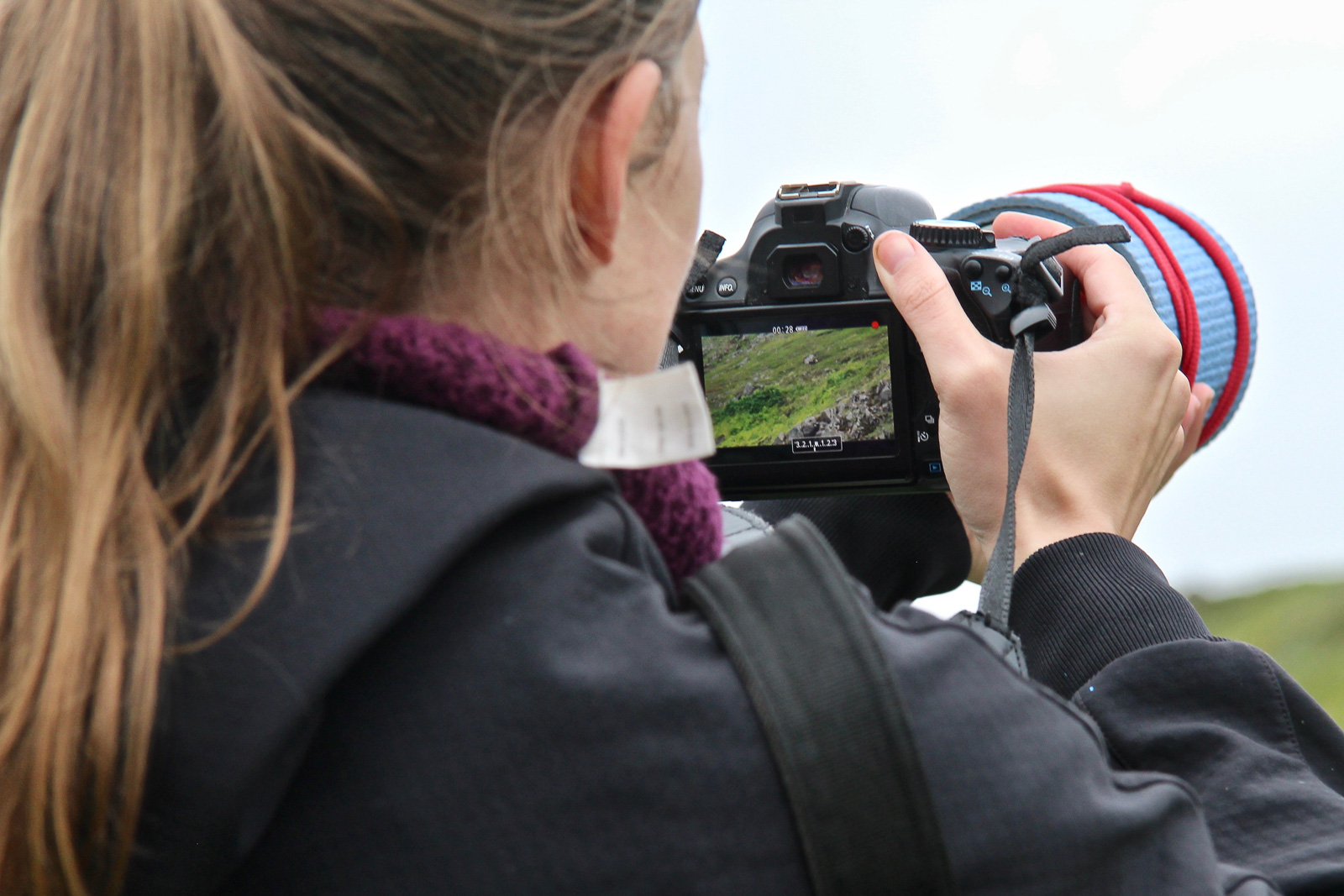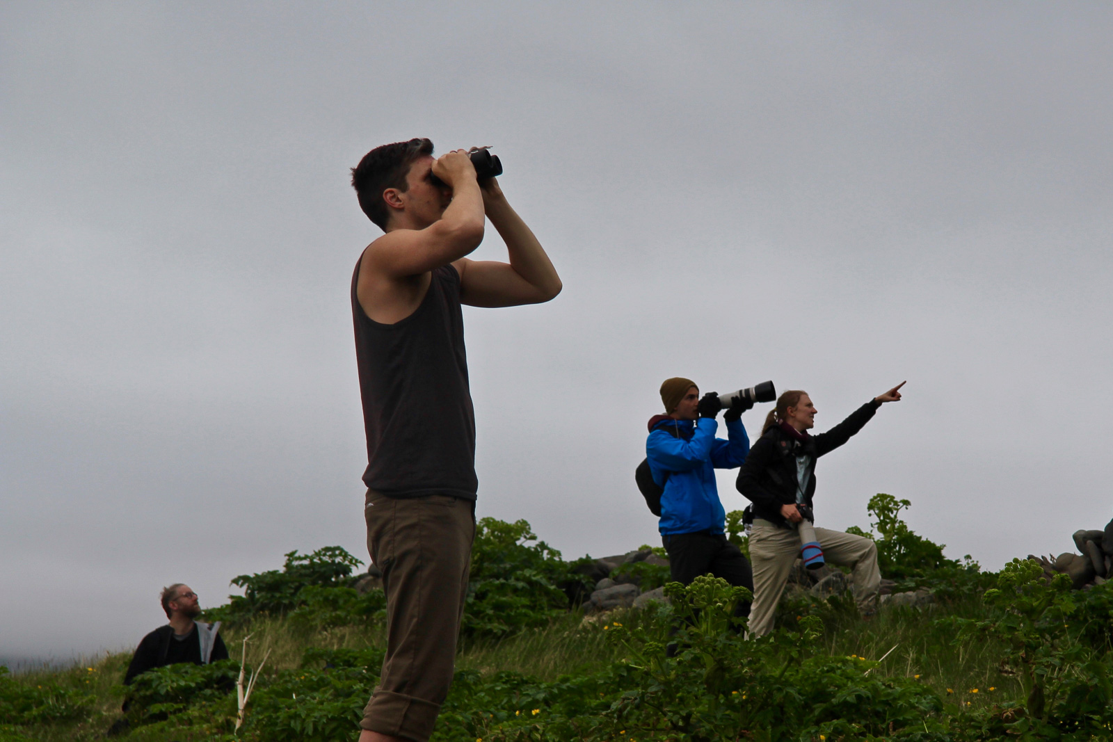 After warming up with some hot soup whipped up by Eyjó, we head out to look for foxes. There’s a den in the copse of trees by the house, and we carefully circle the woods to find higher ground and settle in to wait. Several of the group have come prepared with telescopic zoom lenses, and they trace the land patiently for signs of movement.