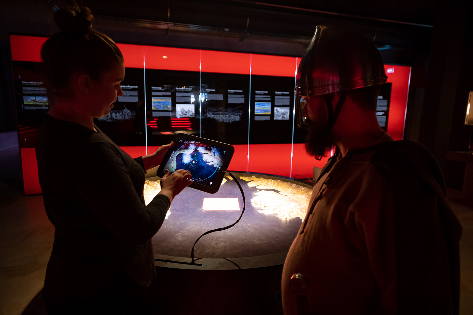 The AR station in the 1238 Museum is a massive round table with a raised relief map of the Bay of Húnaflói, where Steinunn says I can experience the last naval battle of Iceland, “Flóabardagi” through an iPad Pro. This battle saw the people of the Westfjörds pitted against the people of the North. The primary weapons used in this battle were large, heavy stones. On the iPad, the viewer can take control of any ship and use it to hurl rocks at another ship. Since the results of the battle are inconclusive even to this day, any outcome is potentially accurate. I led the people of the Westfjörds to victory.