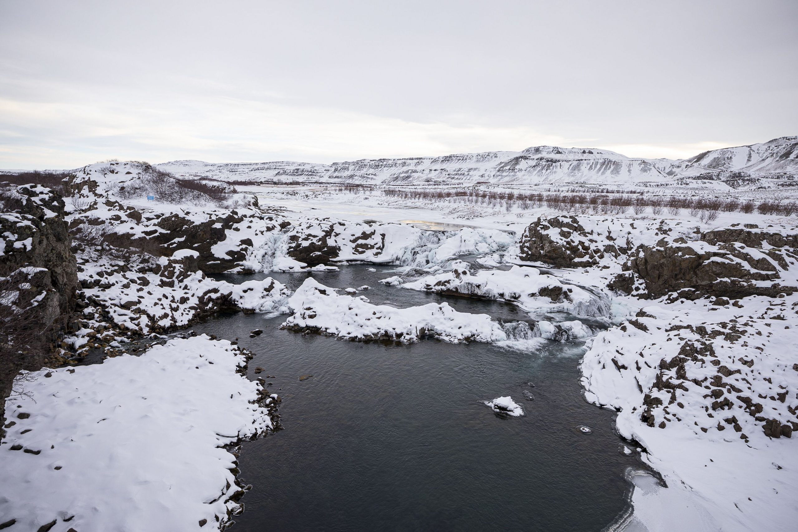 My final destination was the Glanni waterfall. In a word, it was impressive. From the observation deck, I could see cliffs covered in pale green moss and hard, icy snow. Far below, a waterfall spilled into a shallow lagoon where a steady stream of water fell over jagged rocks, and a frozen river snaked through the gorge. As I leaned against the railing, I reflected on everything that I had seen that day. Even though Bifröst is a little town, and there isn’t a lot to do nearby, there is a vast landscape with a lot to see, and plenty of beautiful trails by which to see them. Bifröst truly is the bridge between the realm of the gods and the realm of mortals. No wonder Jónas, Sigvaldi, and Svavar were so inspired.