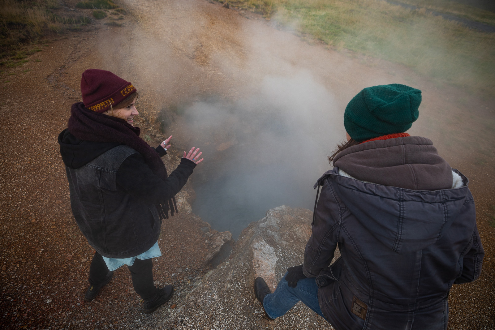 So, we hiked for a while longer, and after examining the area for about two hours, we finally found a suitable place just outside of town. The grey, steaming, bubbling sludge in a hole was the perfect place to prepare our snack. Gently loading our new stockings up with eggs, we crouched, like witches around a cauldron and tentatively lowered them into the hotpot. It’s sweaty work, cooking eggs like this, but we embraced the heat, figuring that the steam would definitely be beneficial for our skin, despite the condensation clinging to our eyelashes and woolly hats.