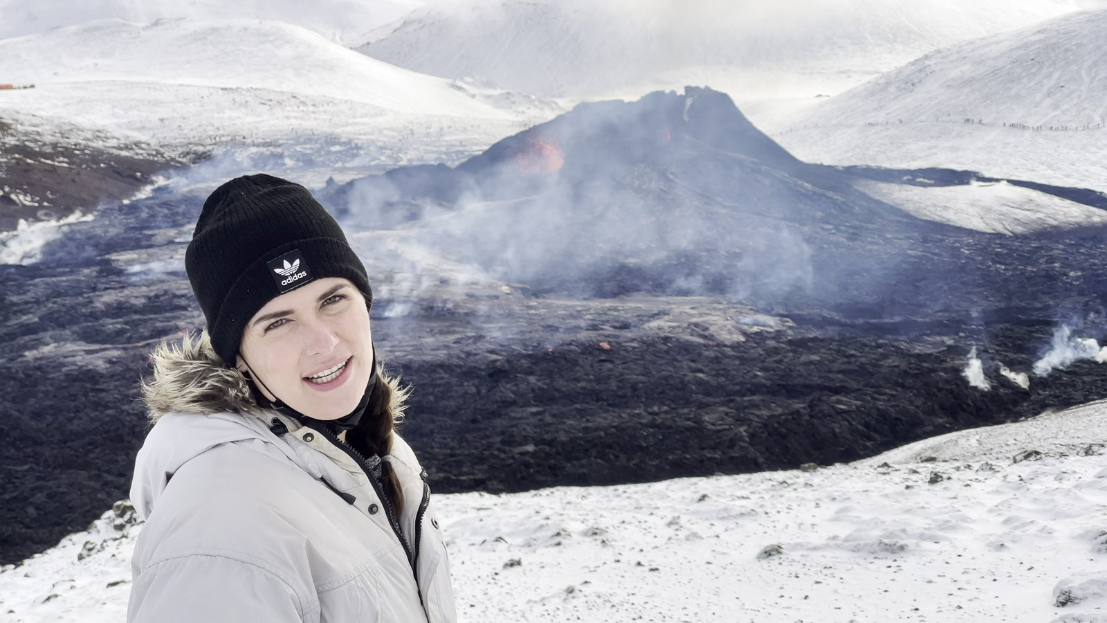 Because, as the helicopter slowly circumvented the volcano, Geldingadalur called out to me. In my head, I saw my foot reaching out to softly poke the pillowy lava or putting my hand into the cloud of ash just to see what it felt like. And so I watched, buckled comfortably into my seat, as the smoke poured out of the volcano, casting a shadow over the pristine snow. It was Plato’s cave realised—and like those poor inmates, I couldn’t look away.