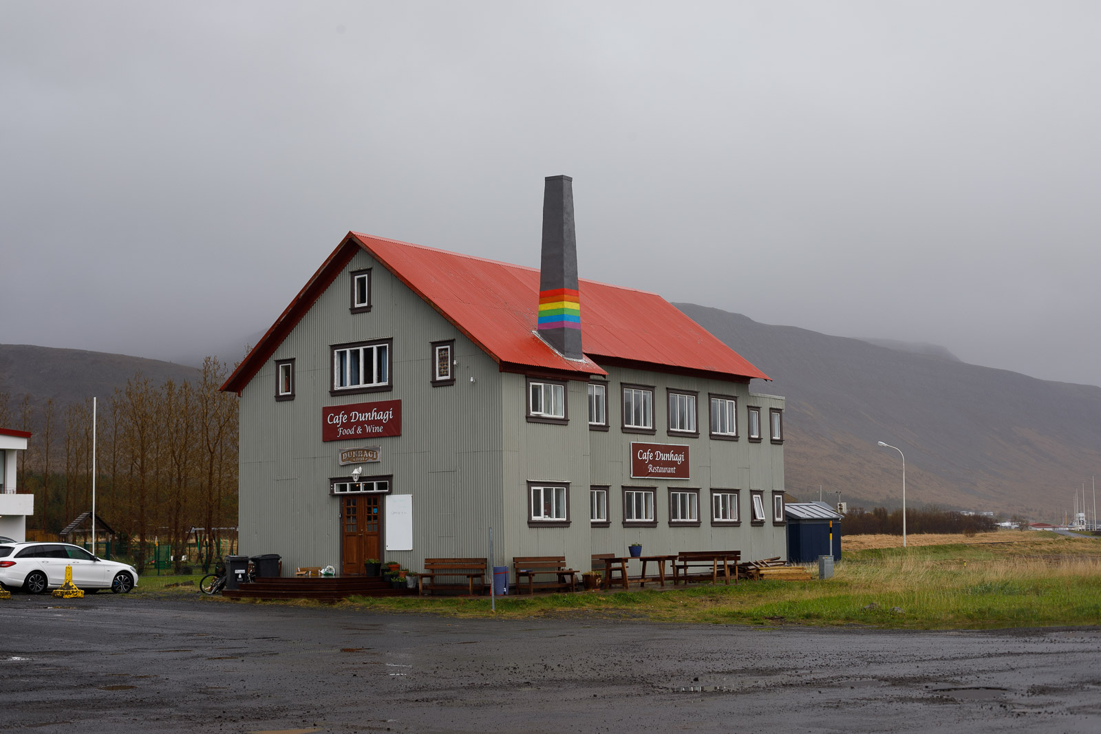 With its large rainbow-coloured chimney, Cafe Dunhagi stands out against the grey and foggy landscape of Tálknafjörður, a fishing village in the southern Westfjords nicknamed Tálknó by its 300 inhabitants. As one of only two restaurants in the area, it has become a popular spot for locals and visitors alike seeking a quick bite to eat.
