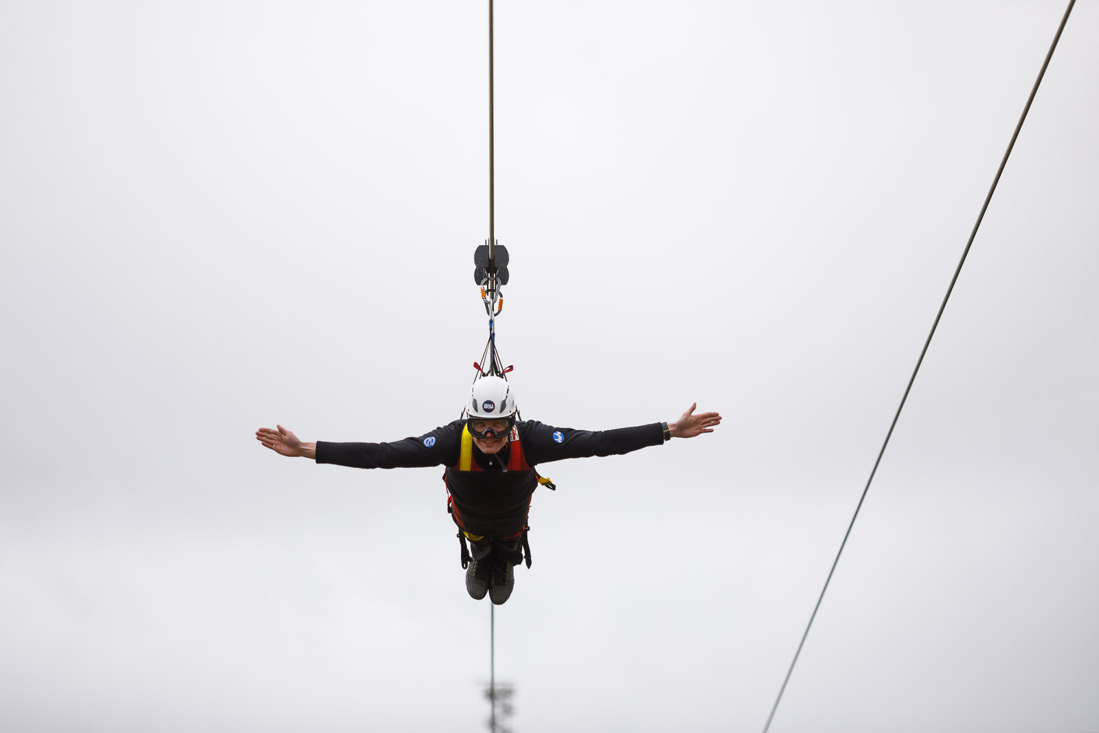 Before I suit up for my go on the zipline, Halli tells me about some of the tech behind it, like the safe launch system used to eliminate human error. It essentially prevents the gates at the top of the tower from opening before everything is set and ready at the landing dock. Then there are the regular inspections and routine measurements of cable tension, sensors in the helmets keeping track of flyers and a camera system. I’m already starting to feel better about this whole outing.