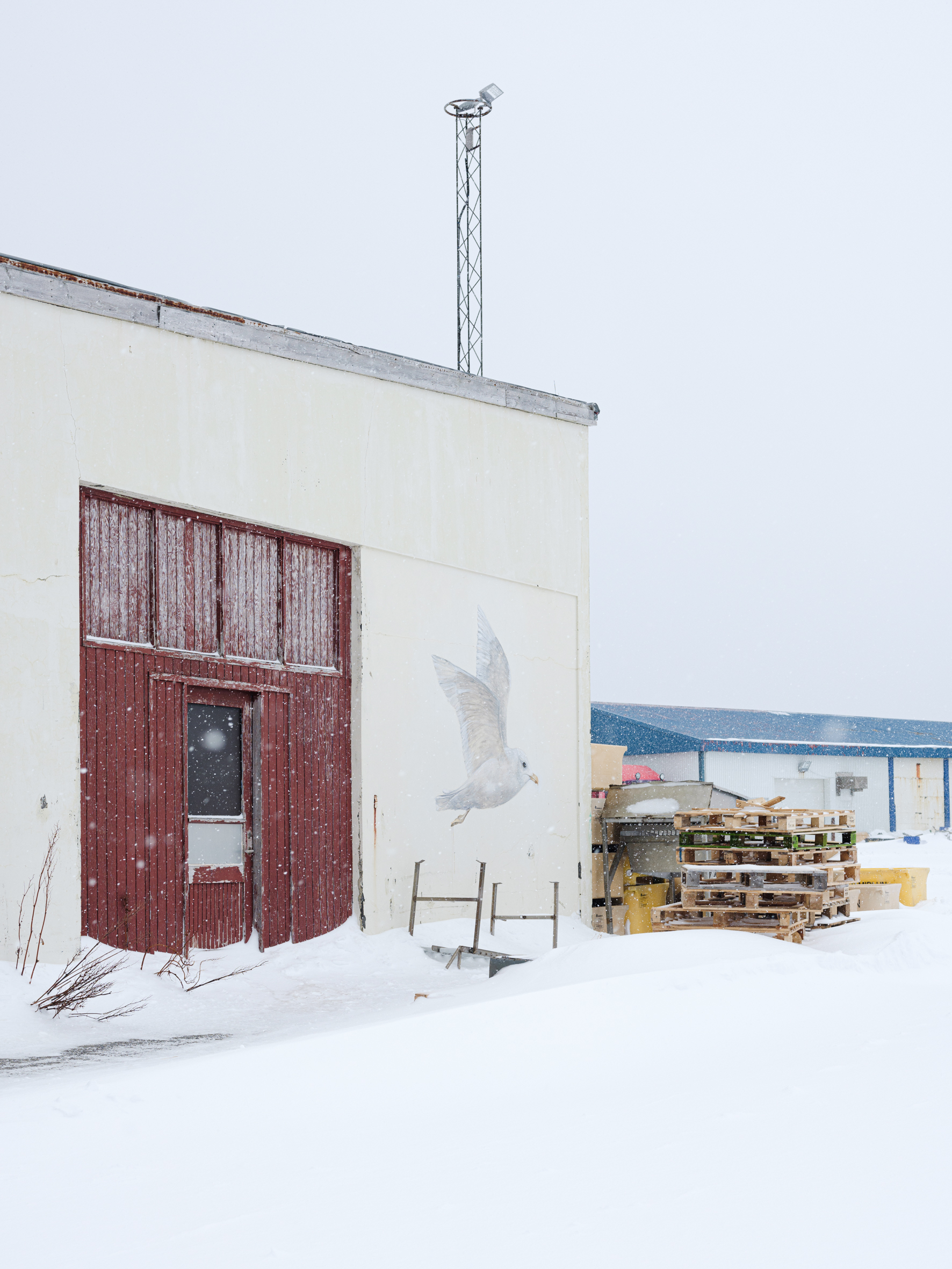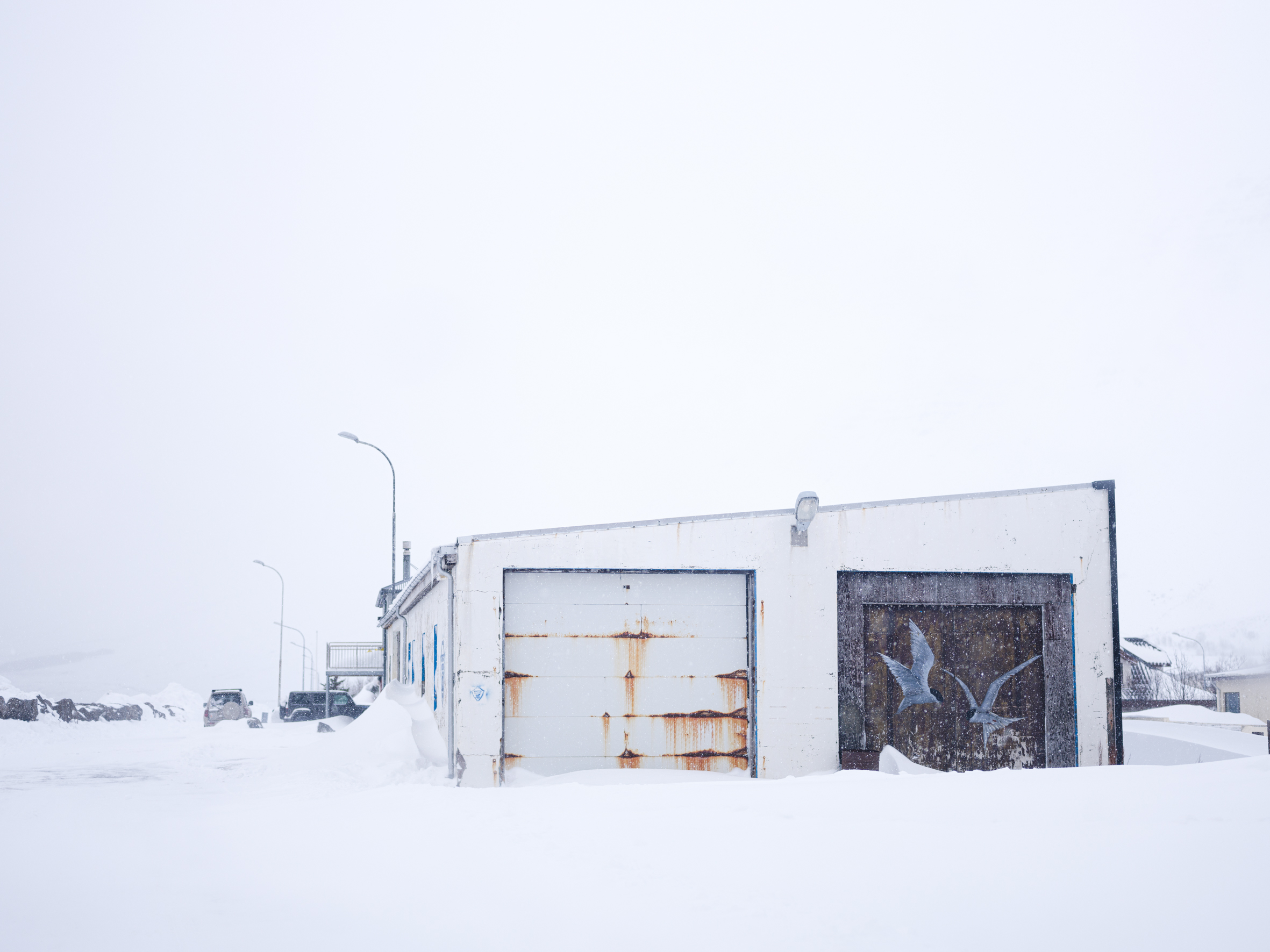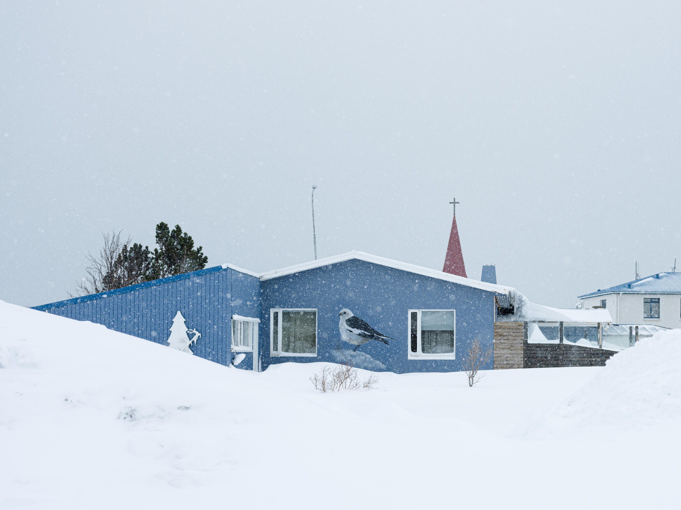 A black-tailed godwit looks back at me from a wall of a residential house, but the snowstorm obscures its legs, fading them into the whiteout. It’s up to your imagination to fill in the missing elements. Nearby, on a blue house, a snow bunting takes my breath away. This tiny creature breeds farther north than any other land-based bird, demonstrating incredible resilience and adaptability. A great cormorant has made its home on the wall of Flateyri pool, where time seems to have stood still for at least a few decades. The swings on the playground hang still under a heavy blanket of snow. How long until the next kids play here?