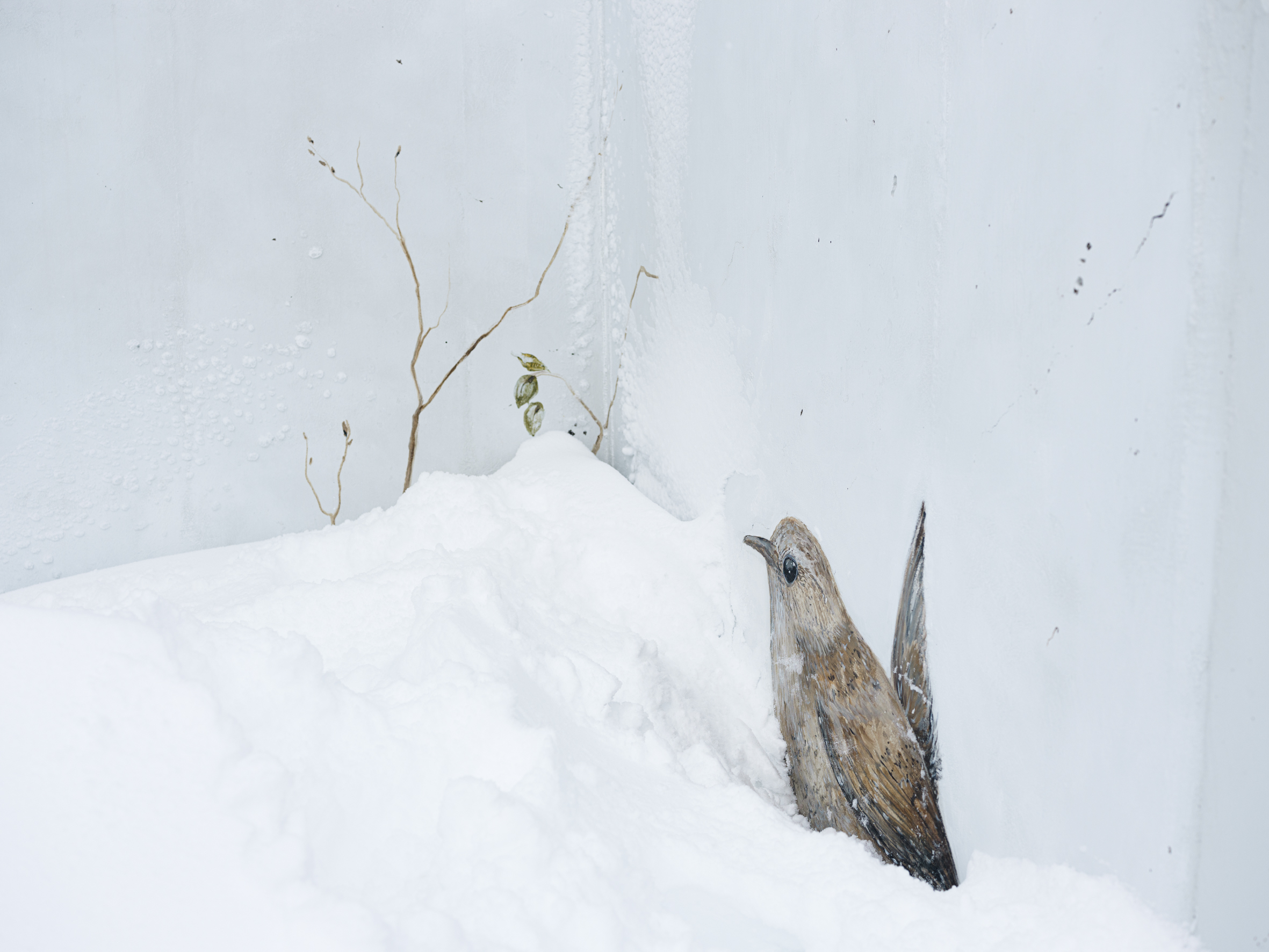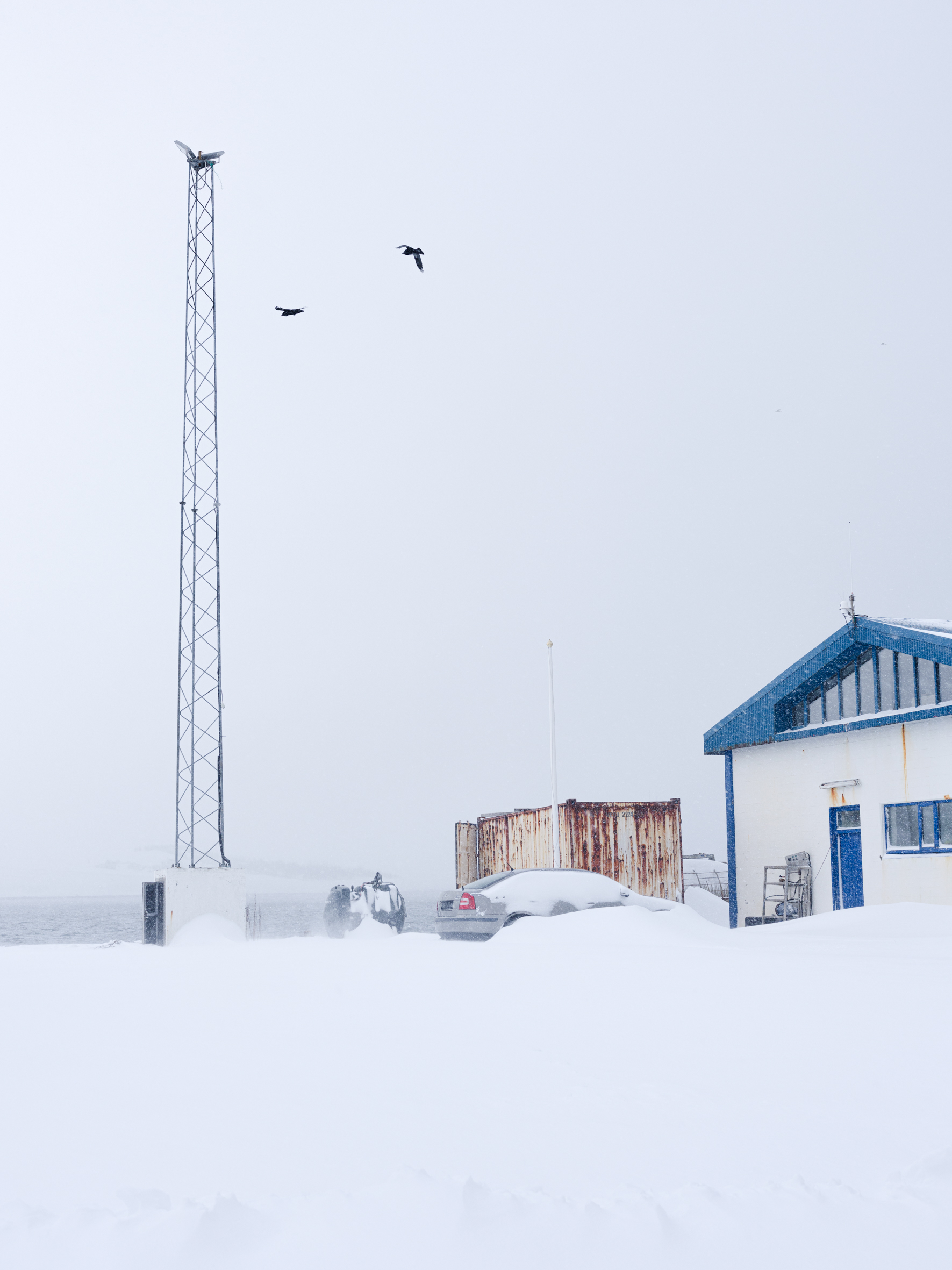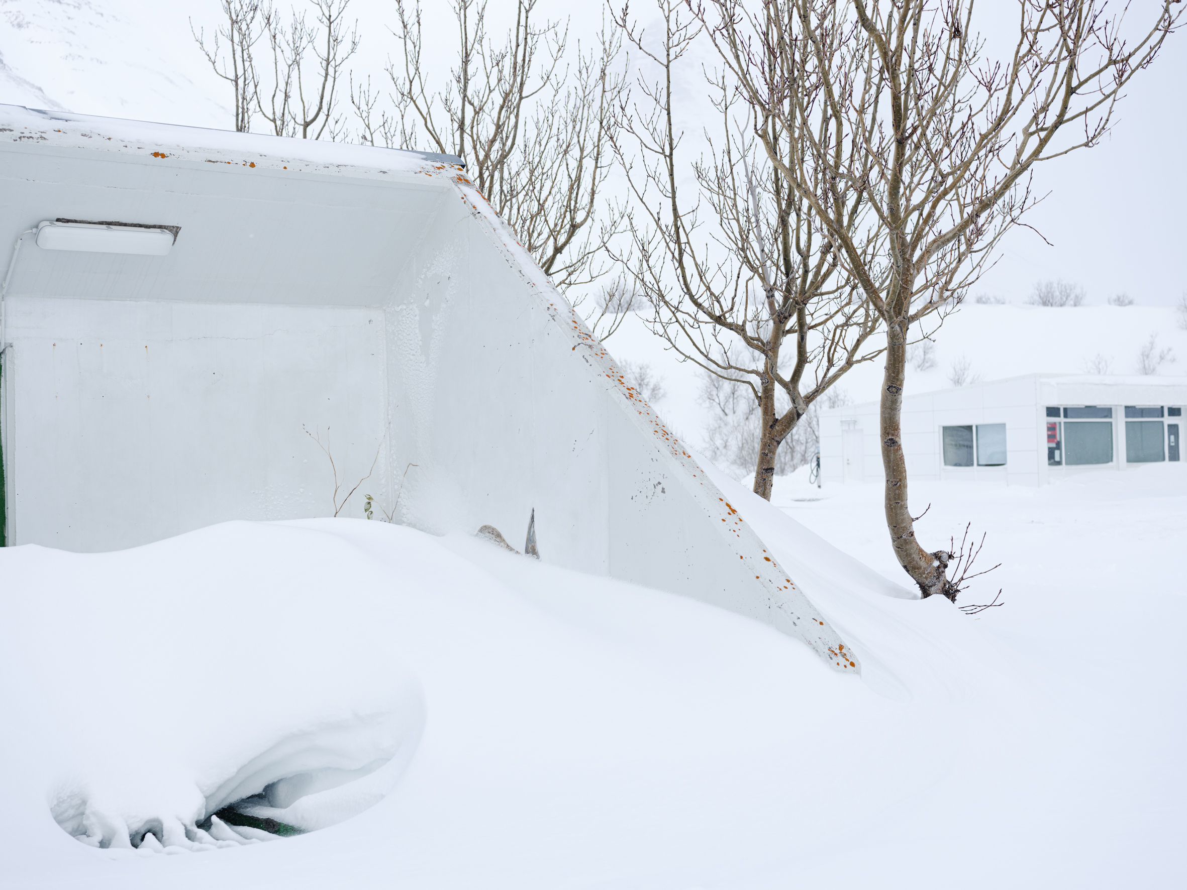 A black-tailed godwit looks back at me from a wall of a residential house, but the snowstorm obscures its legs, fading them into the whiteout. It’s up to your imagination to fill in the missing elements. Nearby, on a blue house, a snow bunting takes my breath away. This tiny creature breeds farther north than any other land-based bird, demonstrating incredible resilience and adaptability. A great cormorant has made its home on the wall of Flateyri pool, where time seems to have stood still for at least a few decades. The swings on the playground hang still under a heavy blanket of snow. How long until the next kids play here?