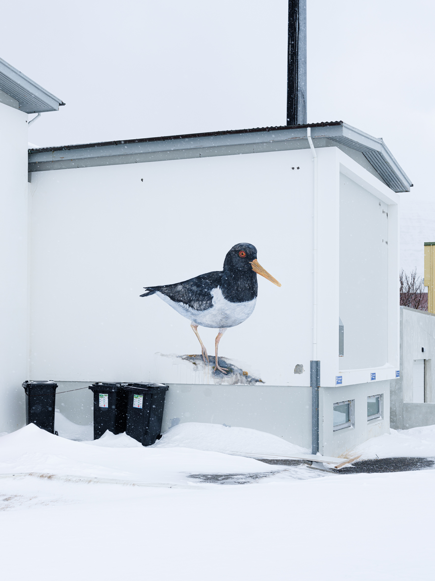 The first bird that catches my attention while still in the car is an oystercatcher — you cannot mistake it with anything else. Even amateur birdwatchers like me would recognise that blazing orange beak. The mural of the bird in question adorns a house on the edge of town along Flateyri’s main street. It overlooks the snowy area with its watchful eye.
