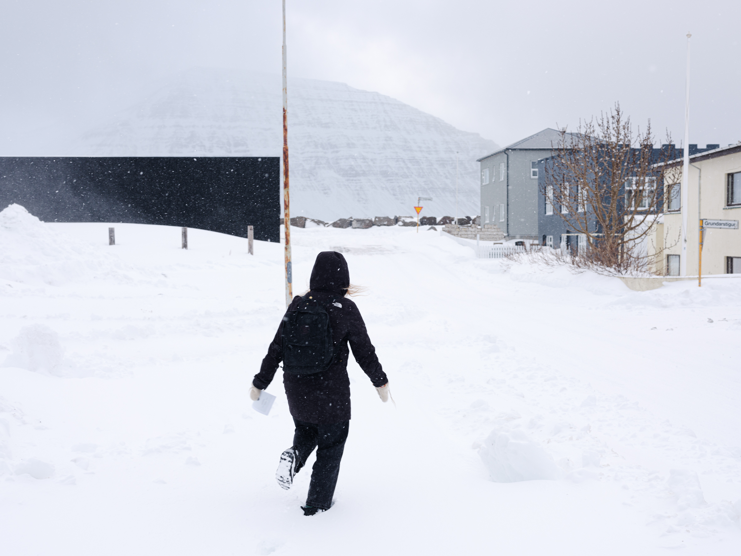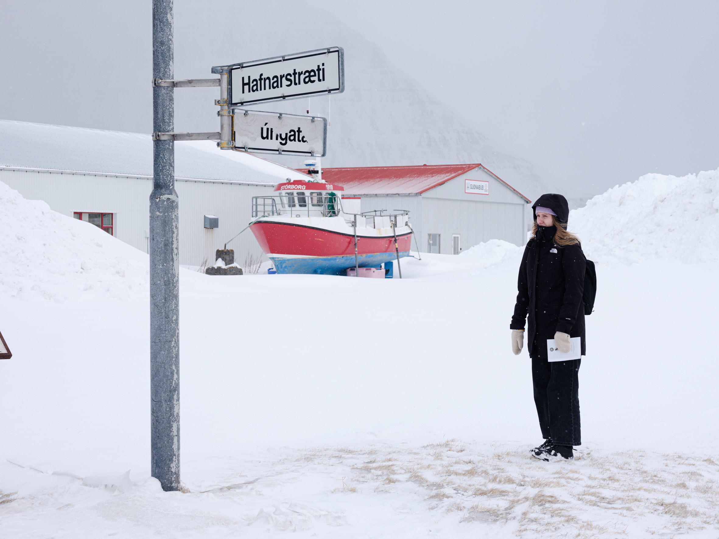 It’s Easter break and I see photos of friends around the world wearing dresses and enjoying picnics. But here in this tiny village in the Westfjords, this March day feels like being trapped in a snow machine. I’ve heard that, even in milder weather, Flateyri has a feeling of desolation, haunted by its harsh past and the lingering memory of the deadly avalanche. Now, that emptiness hangs heavy over the village. There’s not a single person on the street and, as our car slowly rolls through in the search of an open place to grab some food, I can’t decide whether there’s a calming or rather ominous feel to it.