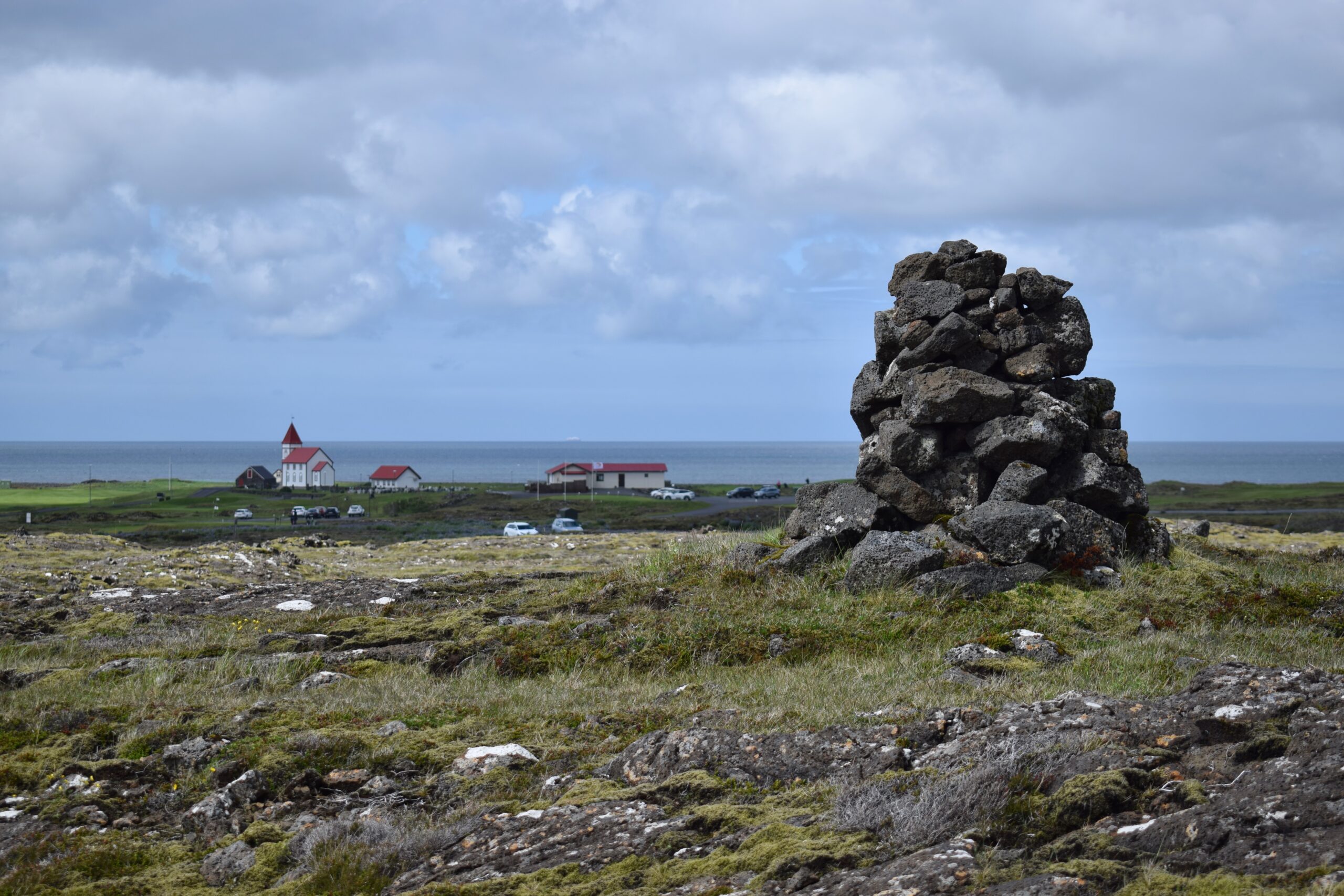 There’s one site of historical interest along the way, marked by a sign for “Staðarborg.” Starting at a parking spot, a humble sheep track meanders off over the rough ground marked — barely — by a few mismatched old poles, set at irregular intervals.