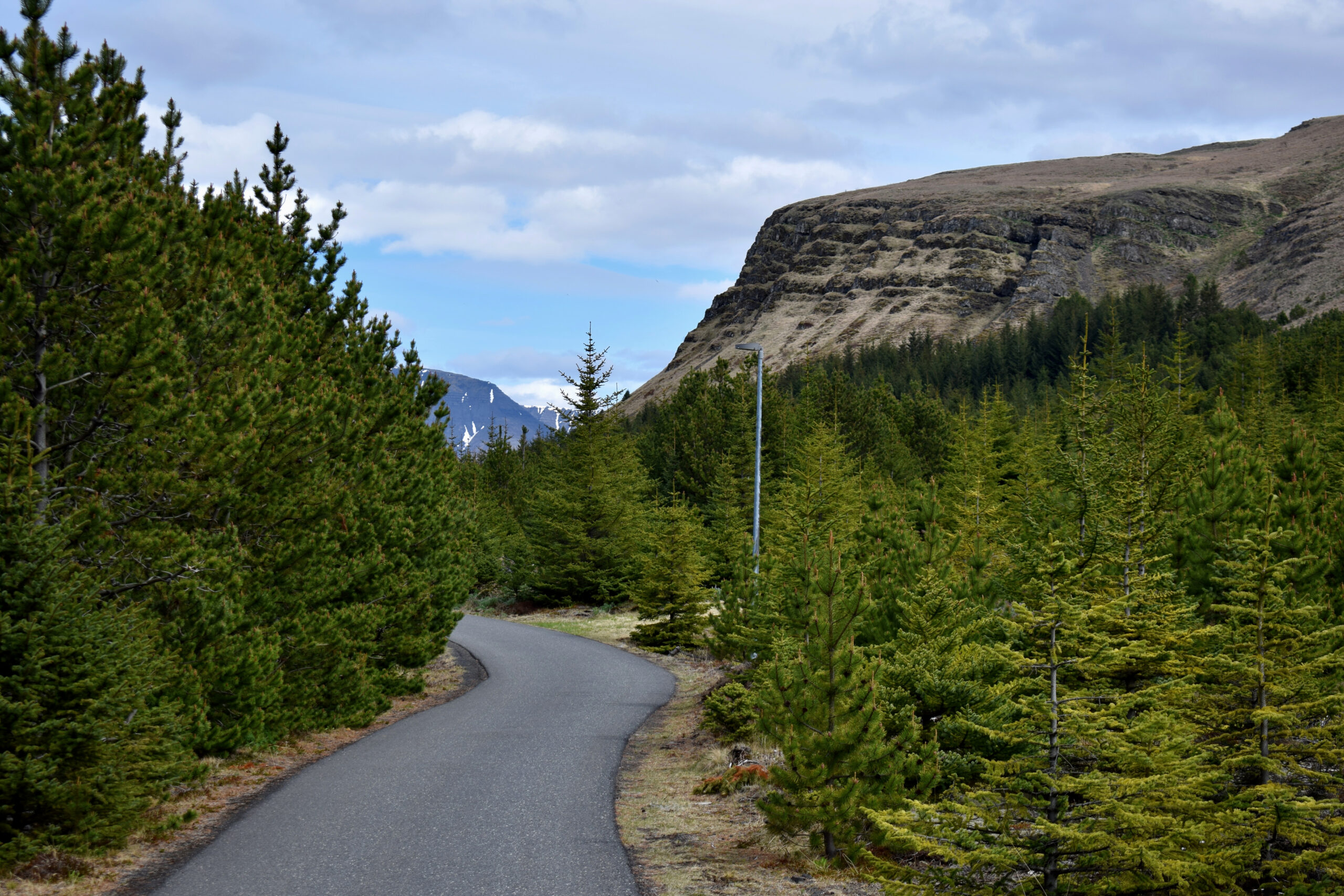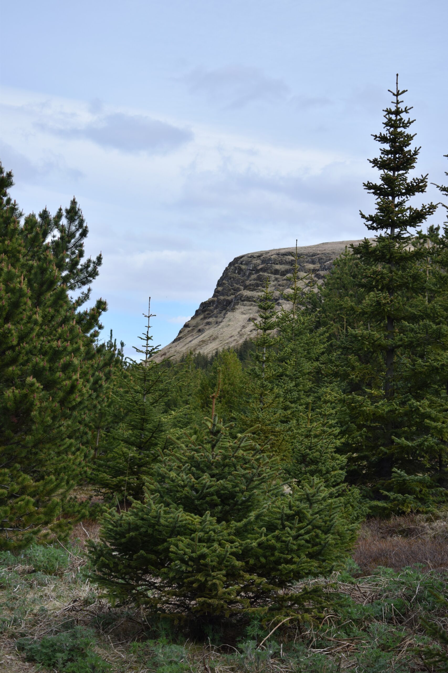 The forest path is well kept and I crunch up the steepening gravel trail, offering a cheery “daginn!” to a couple of locals who are walking their dogs before the rain that’s forecast later. The path splits into two, with a sign indicating steep (“brött”, in Icelandic) and easy (“létt”) routes up the mountain. I’m in no rush and choose the gentler route, following the cheerful green hiking posts that trail off into the woods.