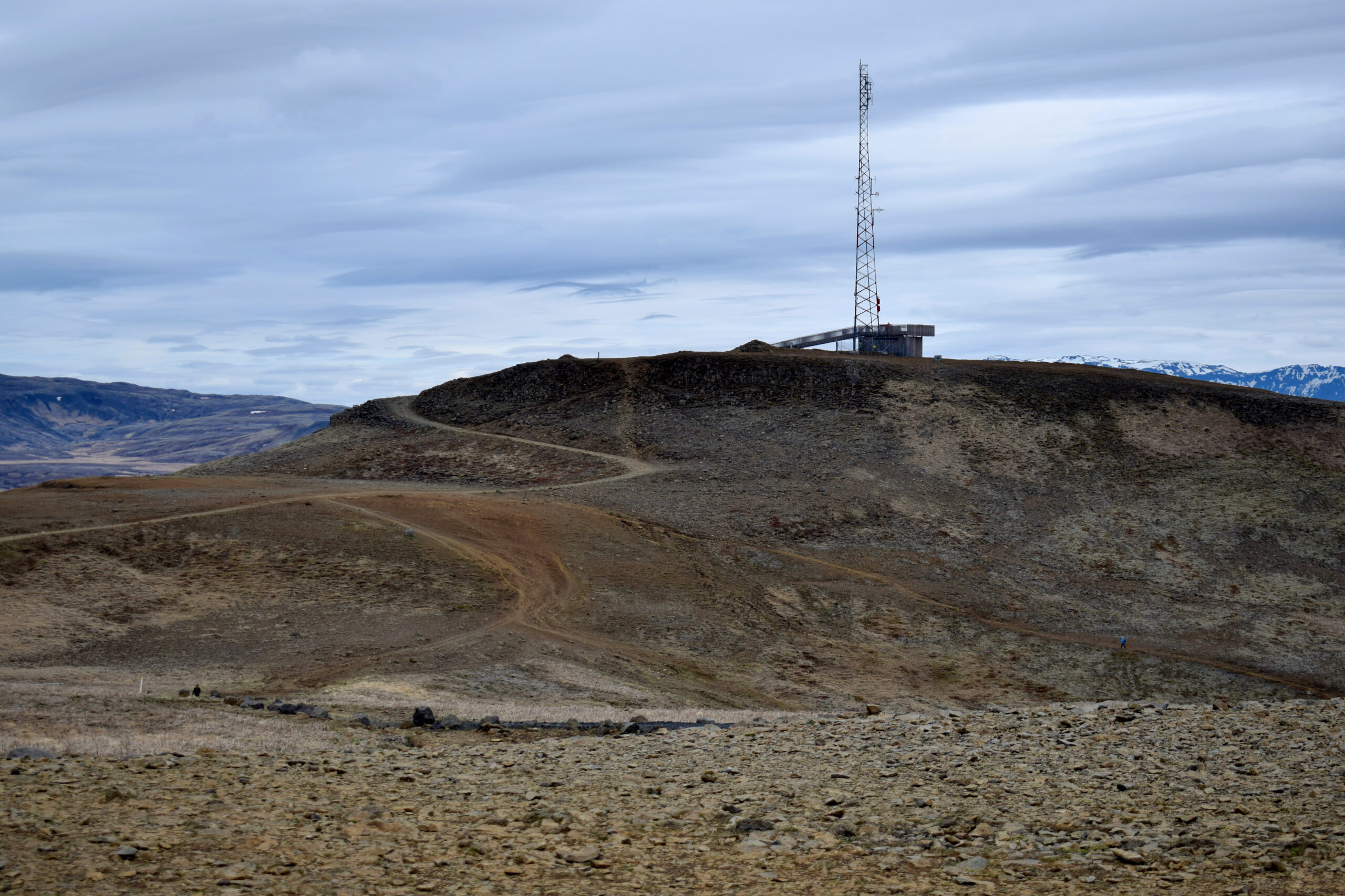 There’s a sole structure nearby — a lonely, weatherworn TV mast crowning a bare, reddish mound. A couple of other hikers are wandering around over there — two slow-moving dots, their bright outerwear standing out against the umber earth.