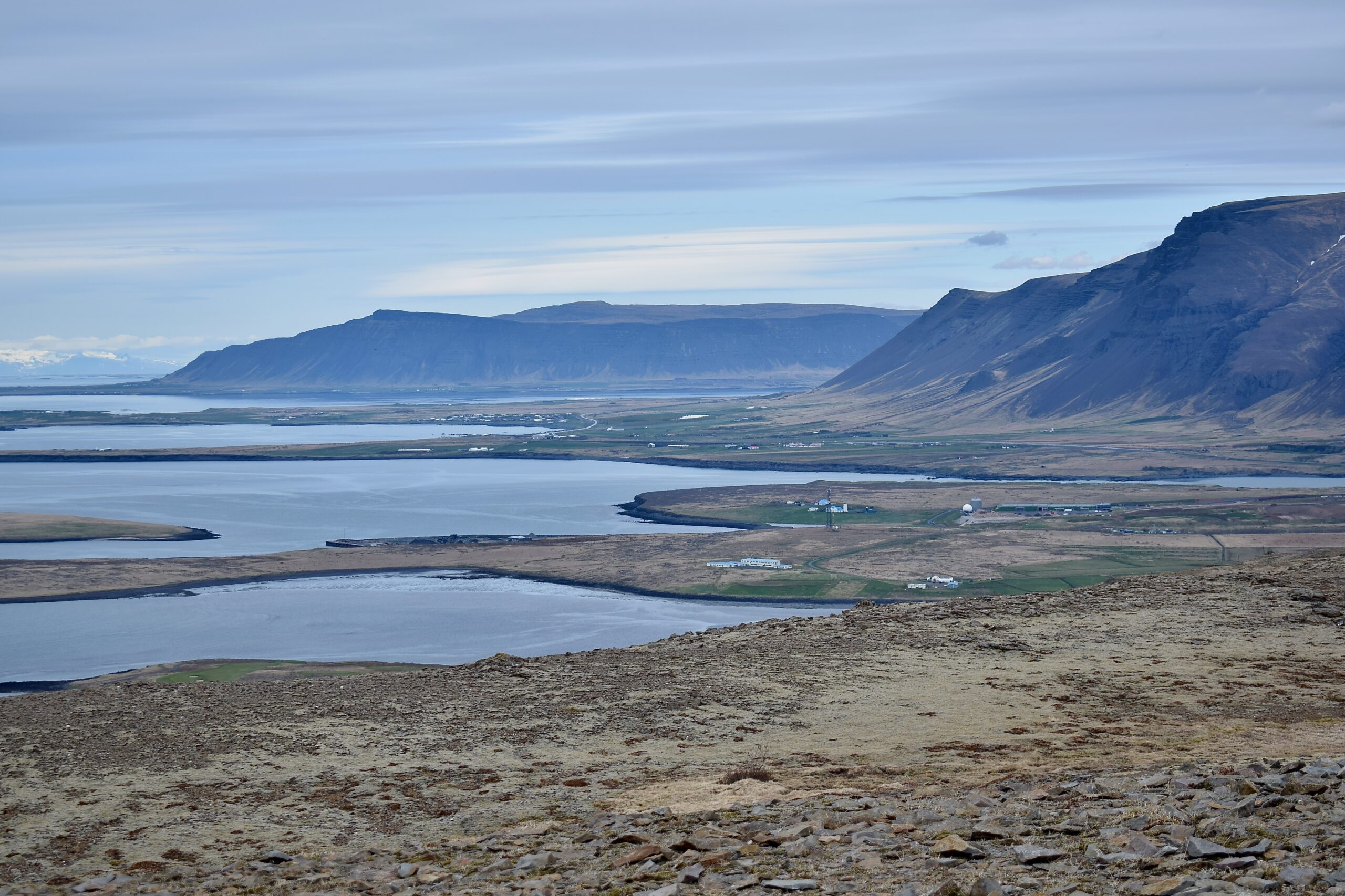 The peak of Úlfarsfell is a bleakly beautiful spot at this time of the year. The rolling landscape to the south is still a rusty, autumnal brown, the vegetation not yet recovered from the thick winter snow. The twin lakes of Hafravatn and Langavatn shine brightly, while gleaming silver rivers meander across the plains towards the snowy mountains in the distance.