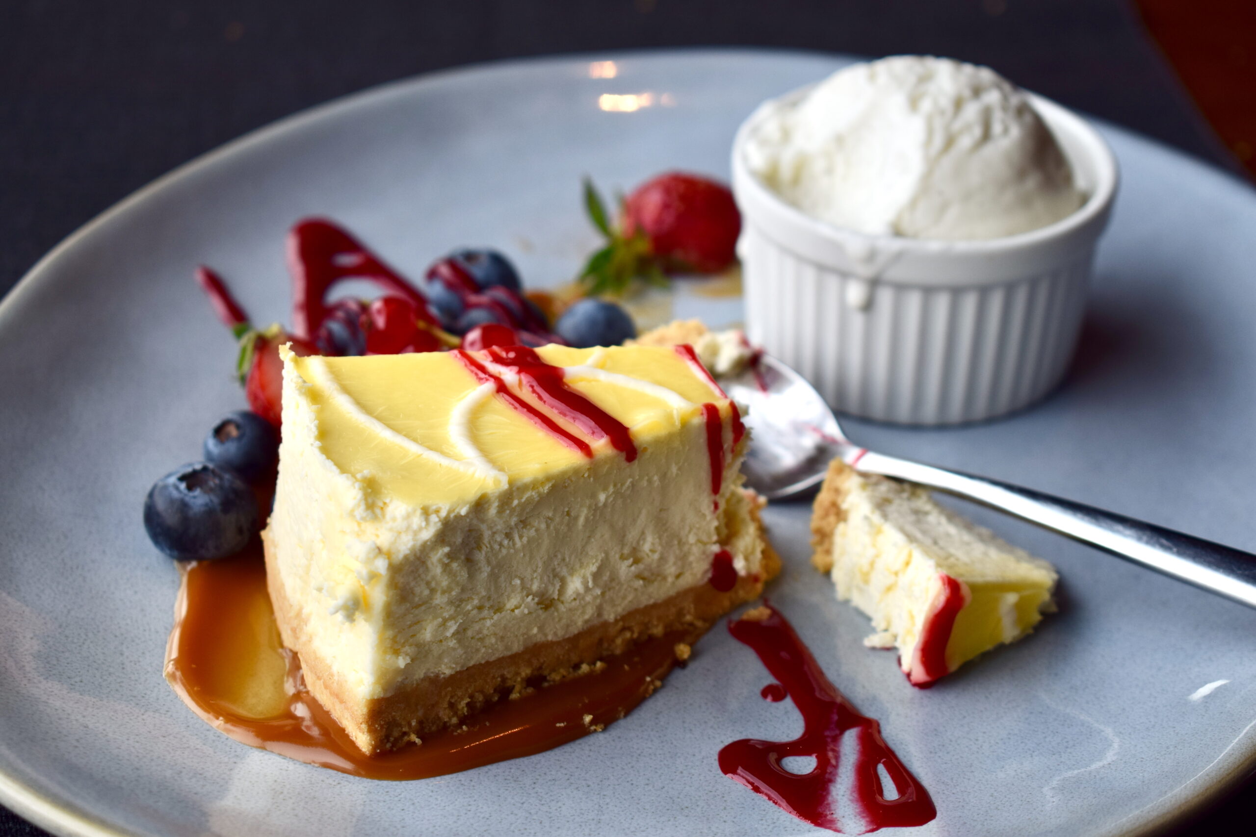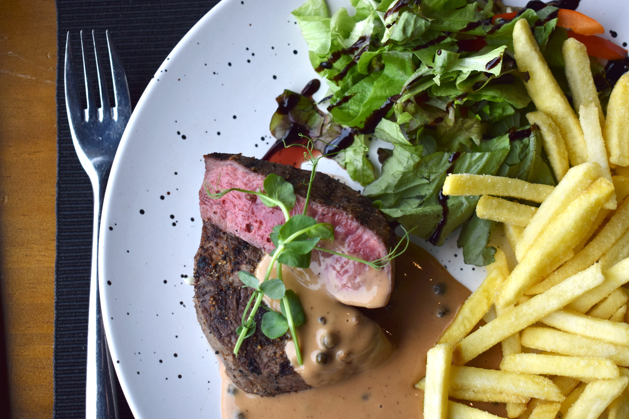 The soup is a taste explosion, with a creamy mushroom broth and chunks of heavily salted duck confit swimming up from the bottom. Each flavour seems turned up to 11, with a sense of maximalist abandon that becomes a theme for the meal. My companion’s beef carpaccio is drizzled with truffle oil and carpeted with parmesan; the enthusiastically seasoned steak arrives in a pool of savoury peppercorn gravy and heavily truffle-salted fries. We wash it all down with plenty of water and Portuguese red, and finish with a vegan lemon cheesecake served with zingy raspberry sauce and decadent caramel that could pass for the real thing.