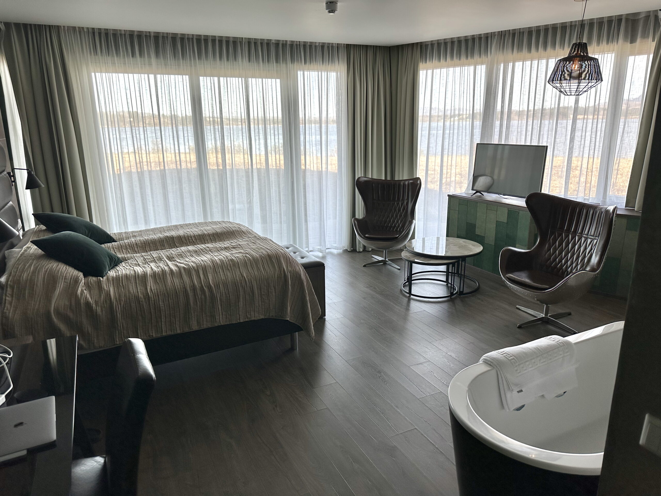 Our airy, well-appointed suite sits on a corner of the hotel, with panoramic views of the lake in two directions. It opens onto a private patio, and the shore of Elliðavatn is just a few steps away. We take walks throughout the day, watching the sky change colour as the day wears on. A giant raven patrols the shore over a trio of wading fishermen casting languorous lines for trout and char. As evening approaches, we close the sheer white curtains to enjoy the freestanding bath with some privacy; later, we’ll throw them open and log into Netflix to watch a movie against a backdrop of the fading sun.