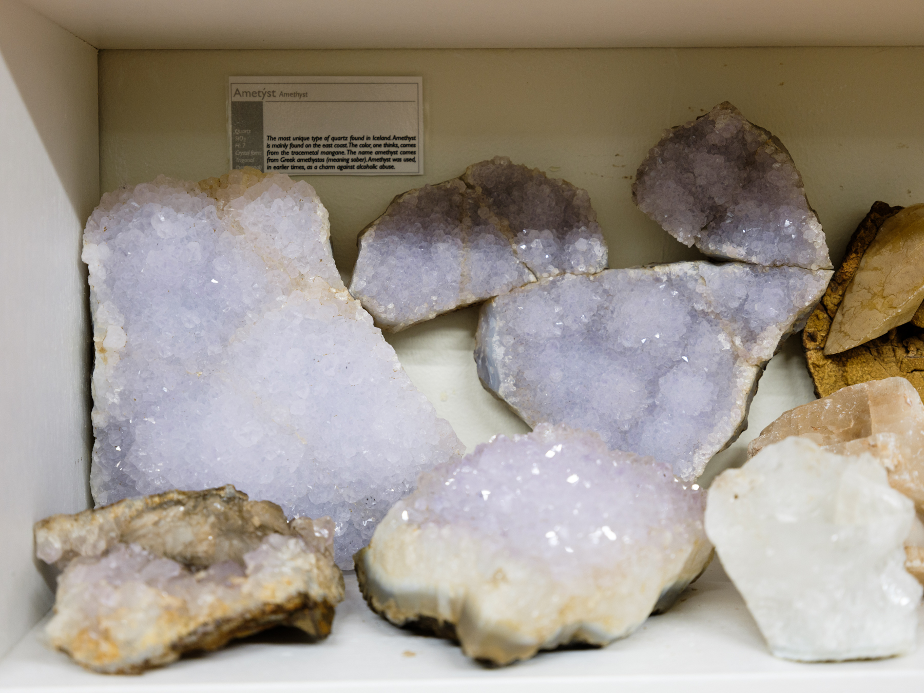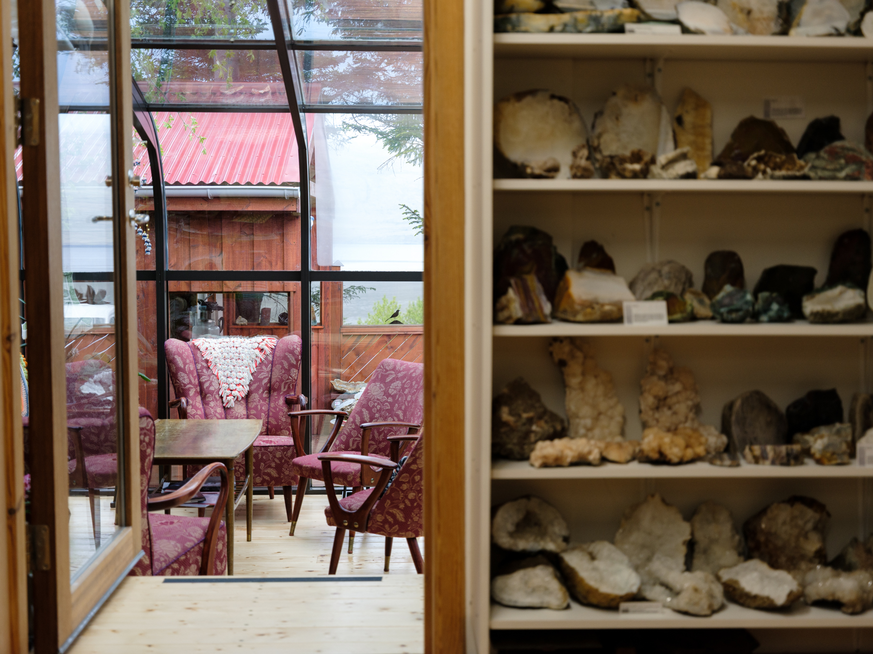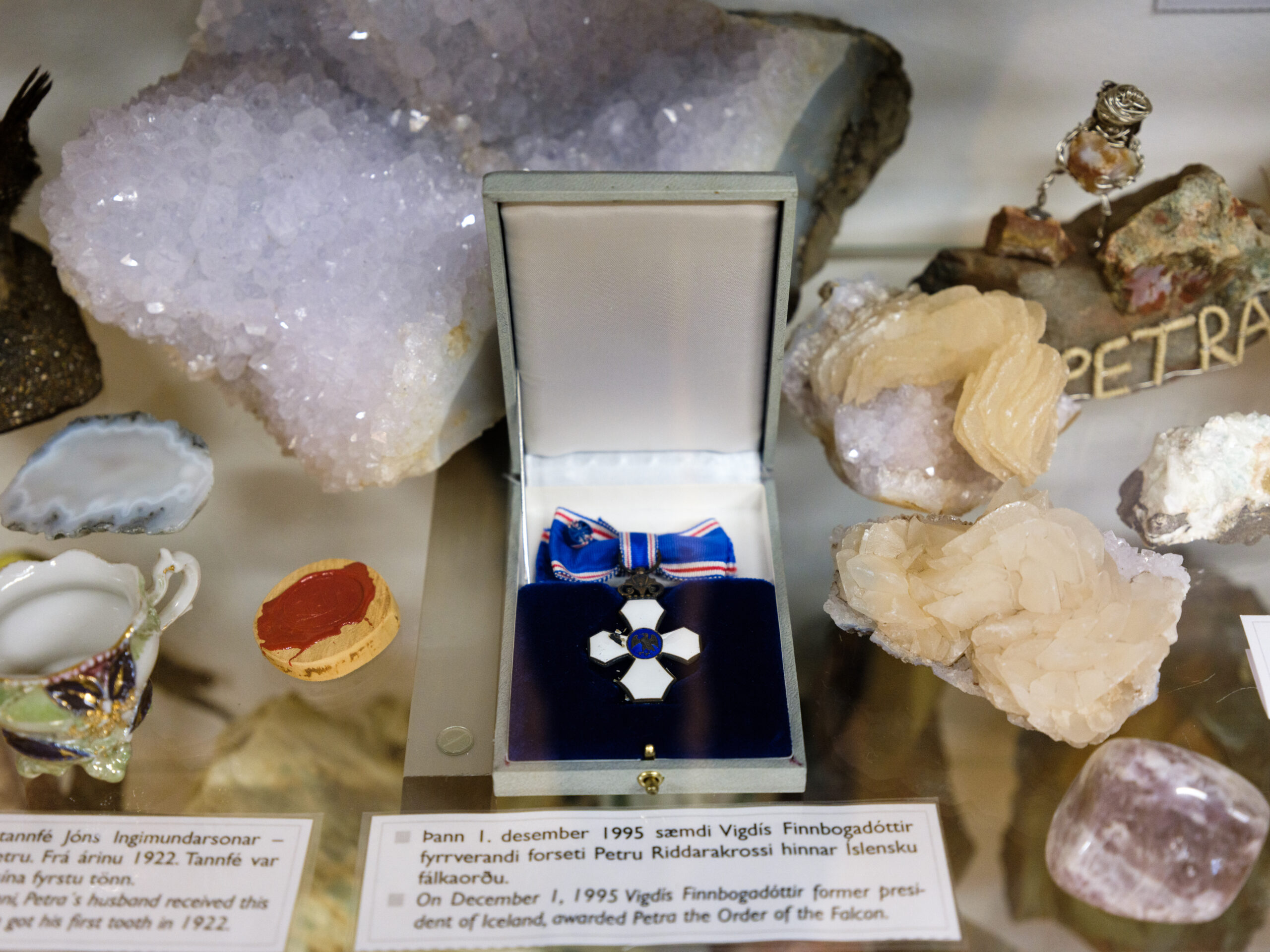 Inside the house, most of the space is now taken up by shelves lined with stones and minerals — mostly different types of quartz, in just about every colour imaginable. There’s lavender haze, turquoise blue, burnt orange, and a full spectrum of white and grey. Some of Petra’s original rooms have been preserved, offering glimpses into the home as it once was — filled with family photos, embroidered paintings, and other memorabilia, including Petra’s Order of the Falcon, awarded to her in 1995 by Vigdís Finnbogadóttir.