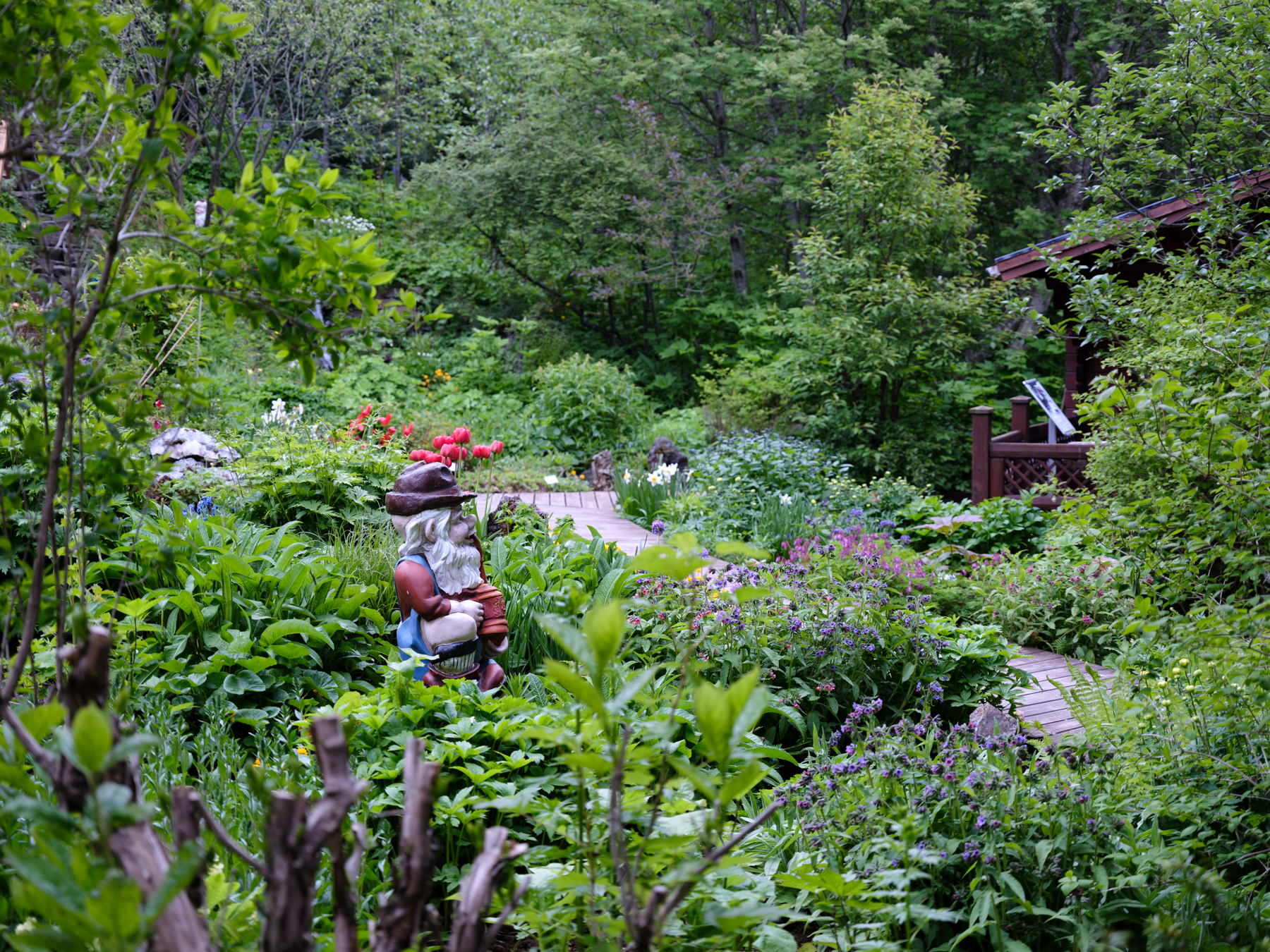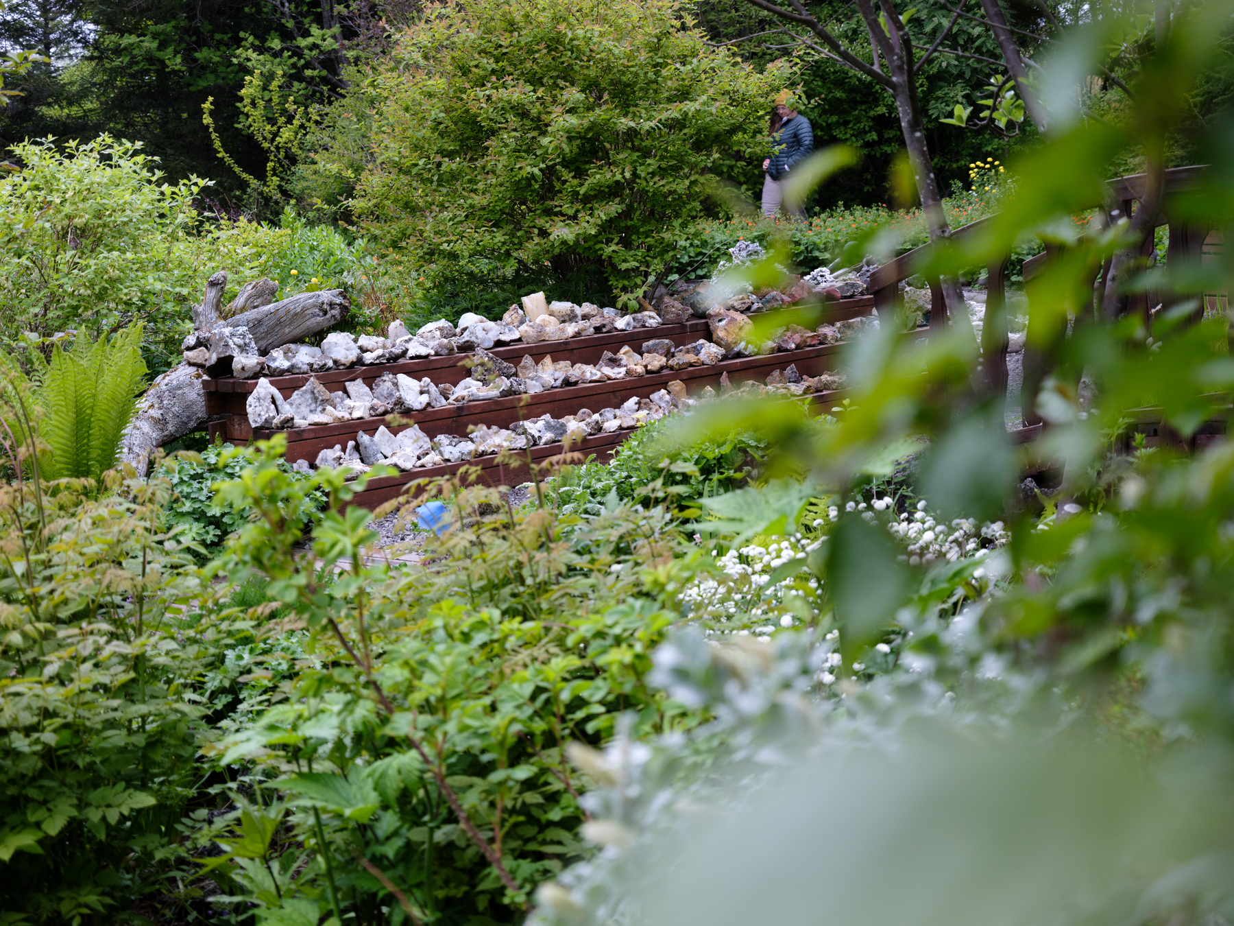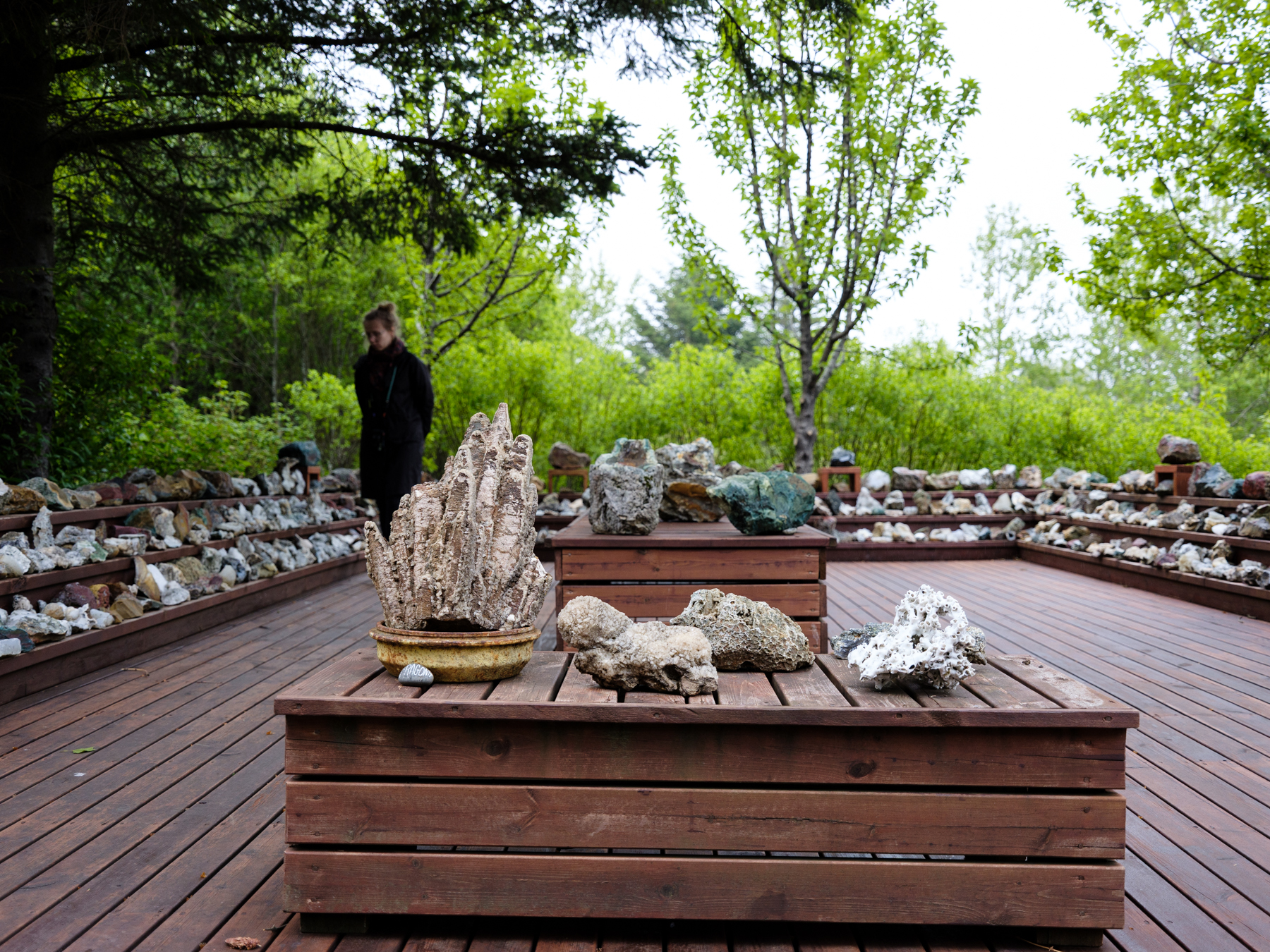 While the inside of the museum is more curated, or perhaps structured, I ended up spending most of my time in the garden. It’s a bit more chaotic — in a good way. Paths twist between wild vegetation, small handmade waterfalls, footbridges, and rows upon rows of stones. Garden gnomes peek out from behind oversized tulips and overgrown grass. In one corner stands Petra’s so-called favourite: a hefty chunk of chalcedony and quartz. At the centre, a life-size wooden statue of Petra herself keeps watch over it all. If it weren’t for the rocks — and, honestly, the slightly unsettling realism of that statue — this could easily be any elderly Icelander’s garden.