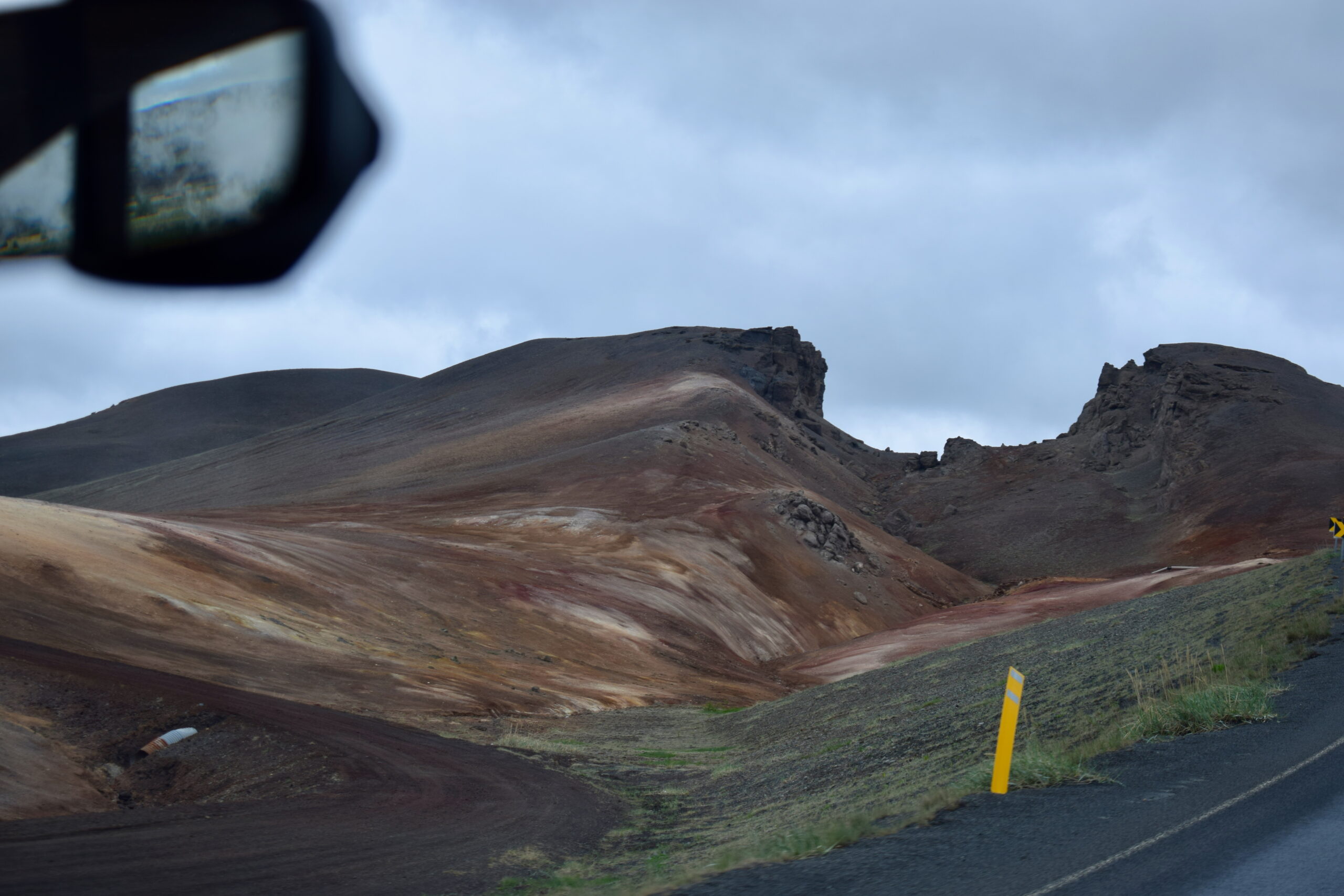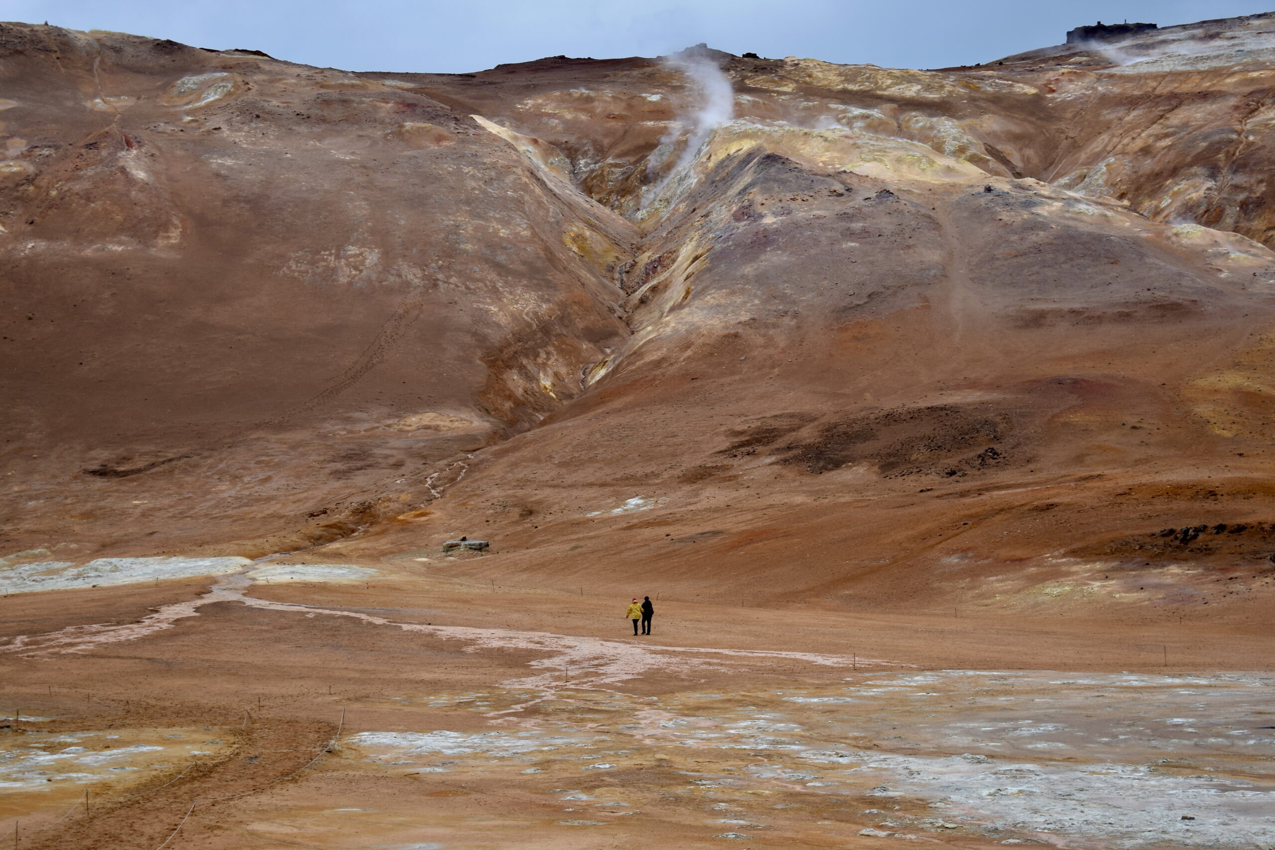 On the east side of the lake, the road coasts through an old and broken lava field before arriving in Reykjahlíð, the peaceful village that also acts as a hub for the area. It sits near the Hverir geothermal area, where the landscape changes again, muted greys and greens giving way to wide stretches of vivid umber and blood red soil. Busloads of people are trudging around Hverir, which has had some wooden walkways installed since the last time I came around, five years ago. It remains beautiful despite the crowds and the tourist-centric infrastructure, with sulphuric, mould-coloured fumaroles gushing hot steam into the damp air.