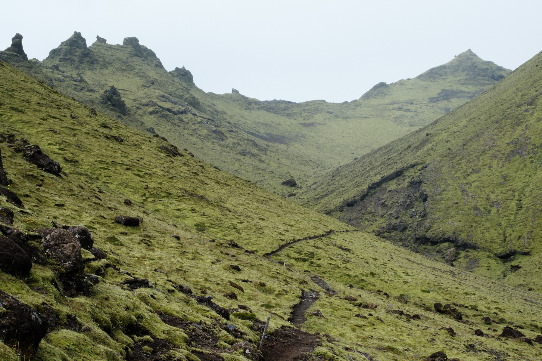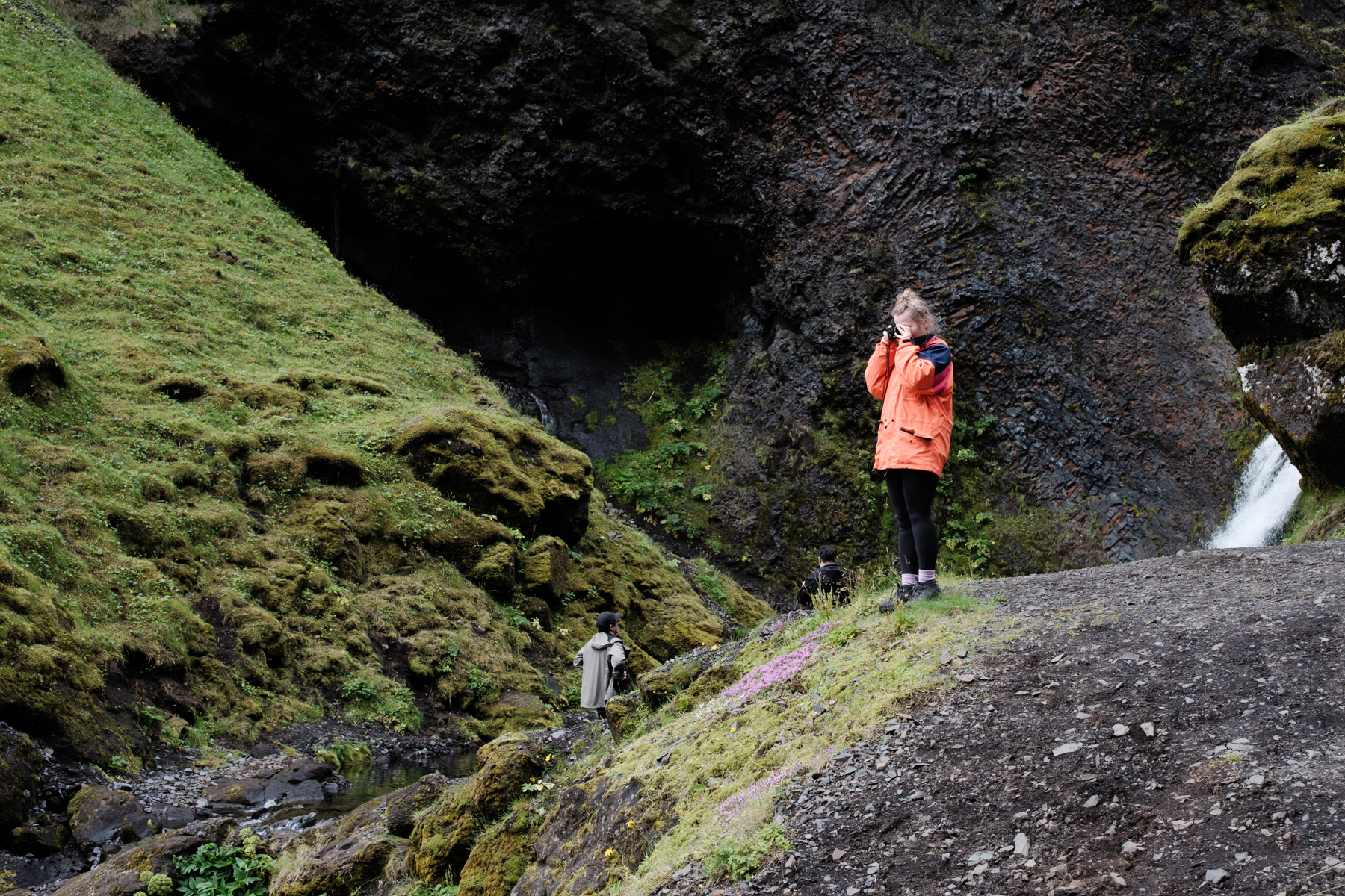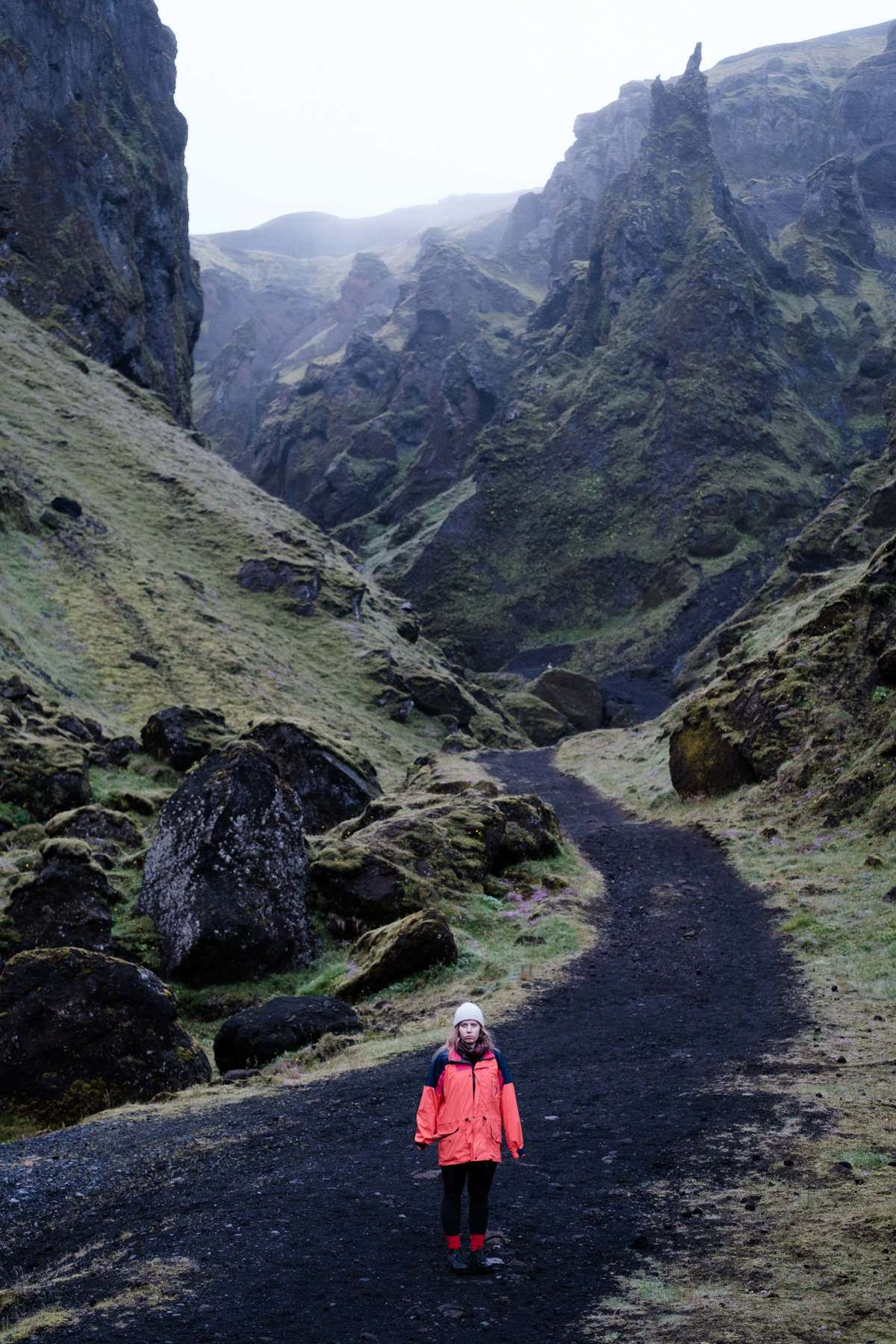 Þakgil is also a great starting point for several hikes in the area, all conveniently marked on a map right next to the campsite’s showers. First — and an absolute must — is the red trail to the waterfall, which is more of a walk than a hike. As you walk deeper into what I can only call a canyon within a canyon, the greenery thickens, and the landscape grows wilder; looking back at the photos to revive my memory of the trip, the scale feels almost unreal. Here and there, bursts of yellow daffodils or the purple of arctic thyme contrast with the endless green.