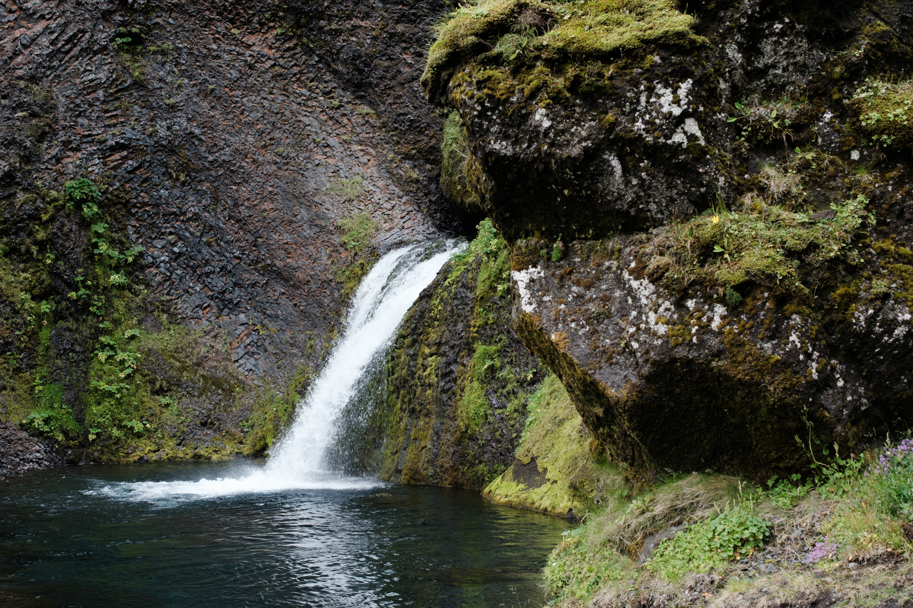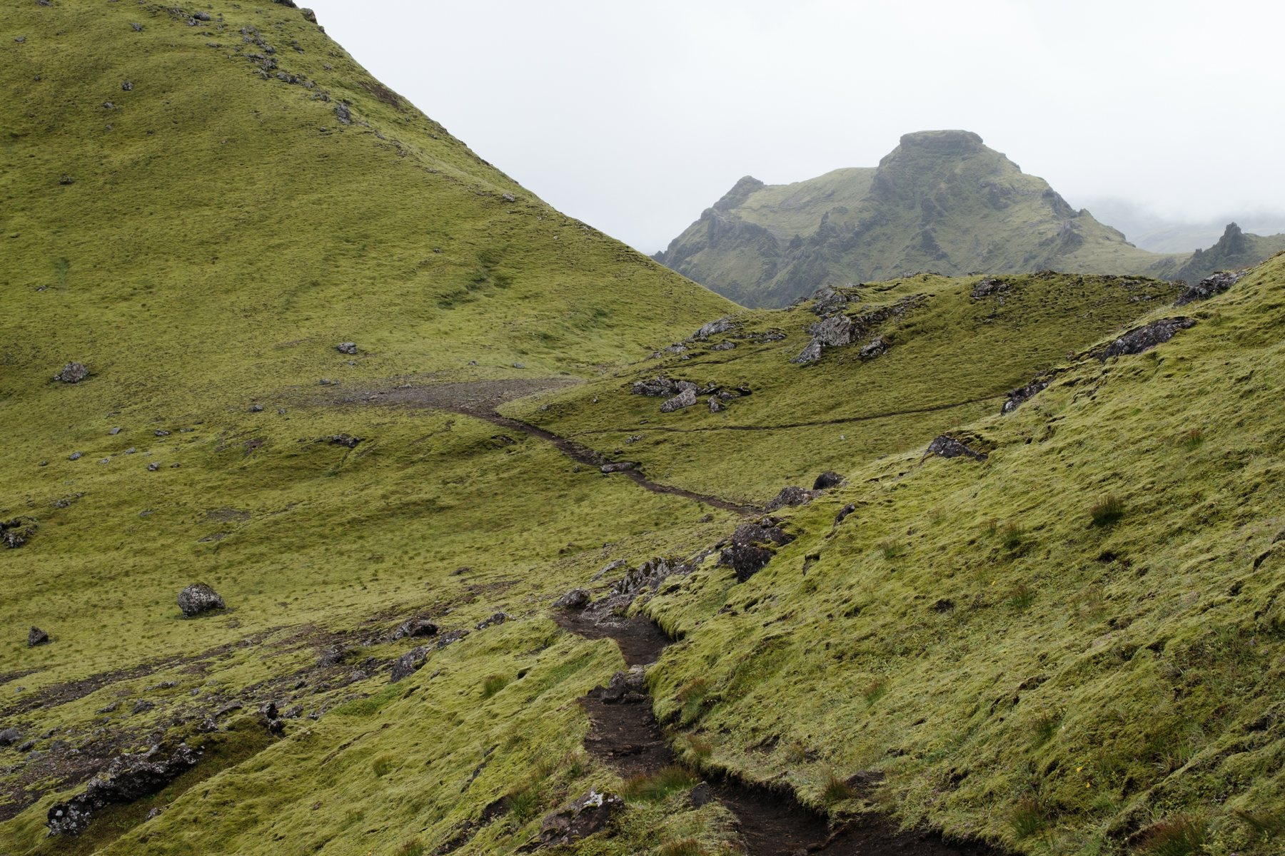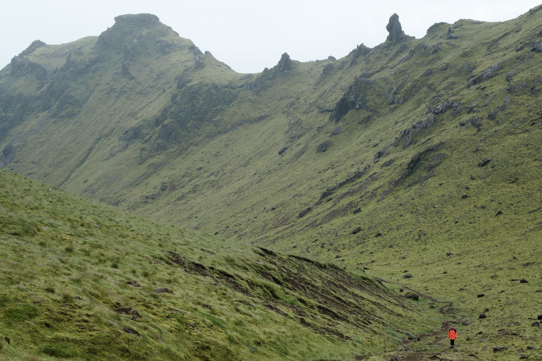 Þakgil is also a great starting point for several hikes in the area, all conveniently marked on a map right next to the campsite’s showers. First — and an absolute must — is the red trail to the waterfall, which is more of a walk than a hike. As you walk deeper into what I can only call a canyon within a canyon, the greenery thickens, and the landscape grows wilder; looking back at the photos to revive my memory of the trip, the scale feels almost unreal. Here and there, bursts of yellow daffodils or the purple of arctic thyme contrast with the endless green.