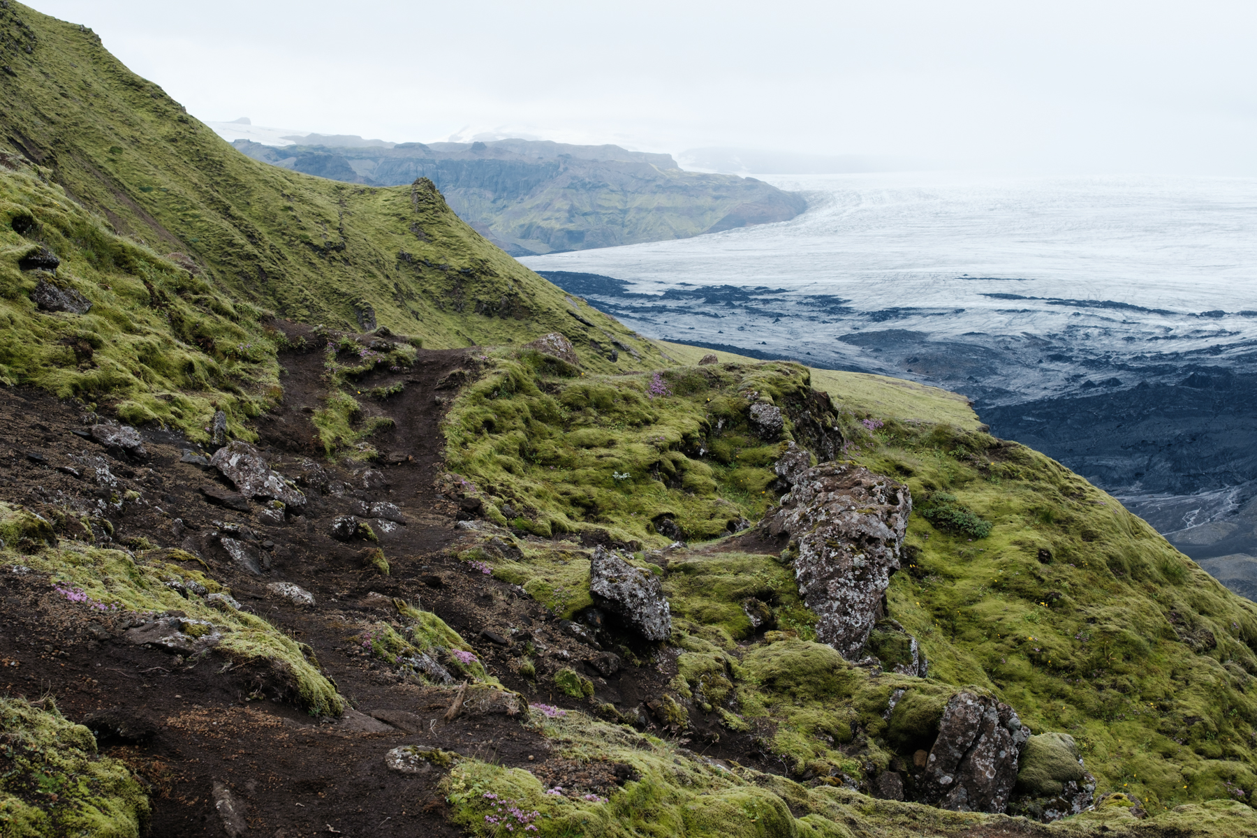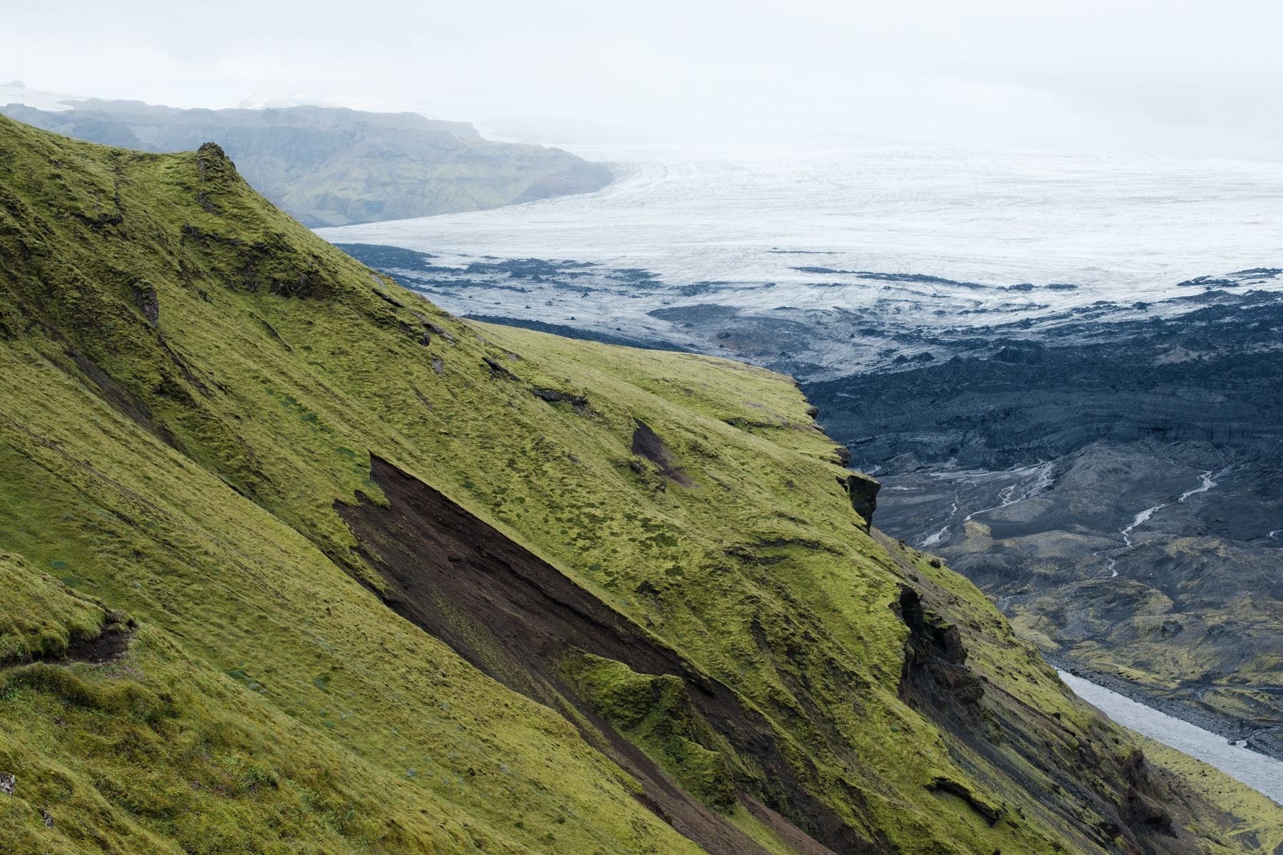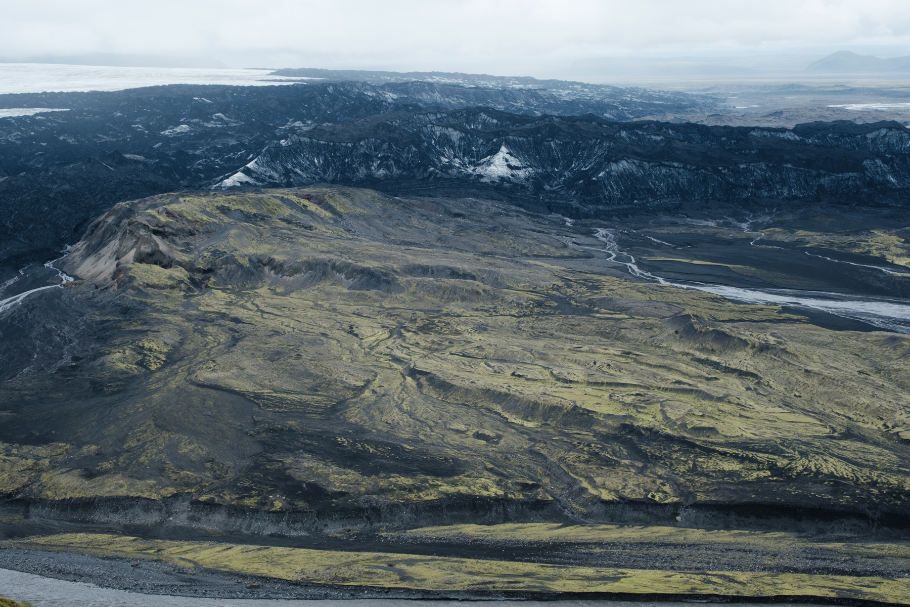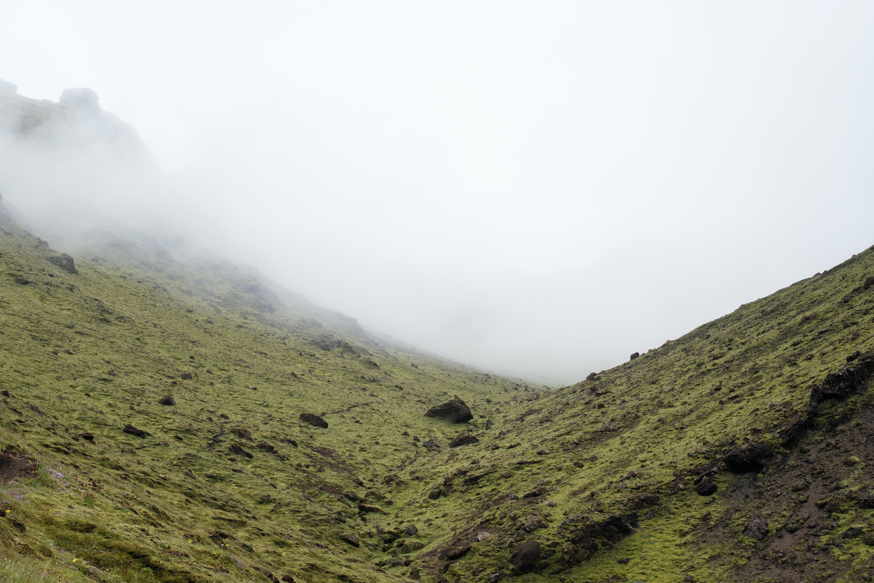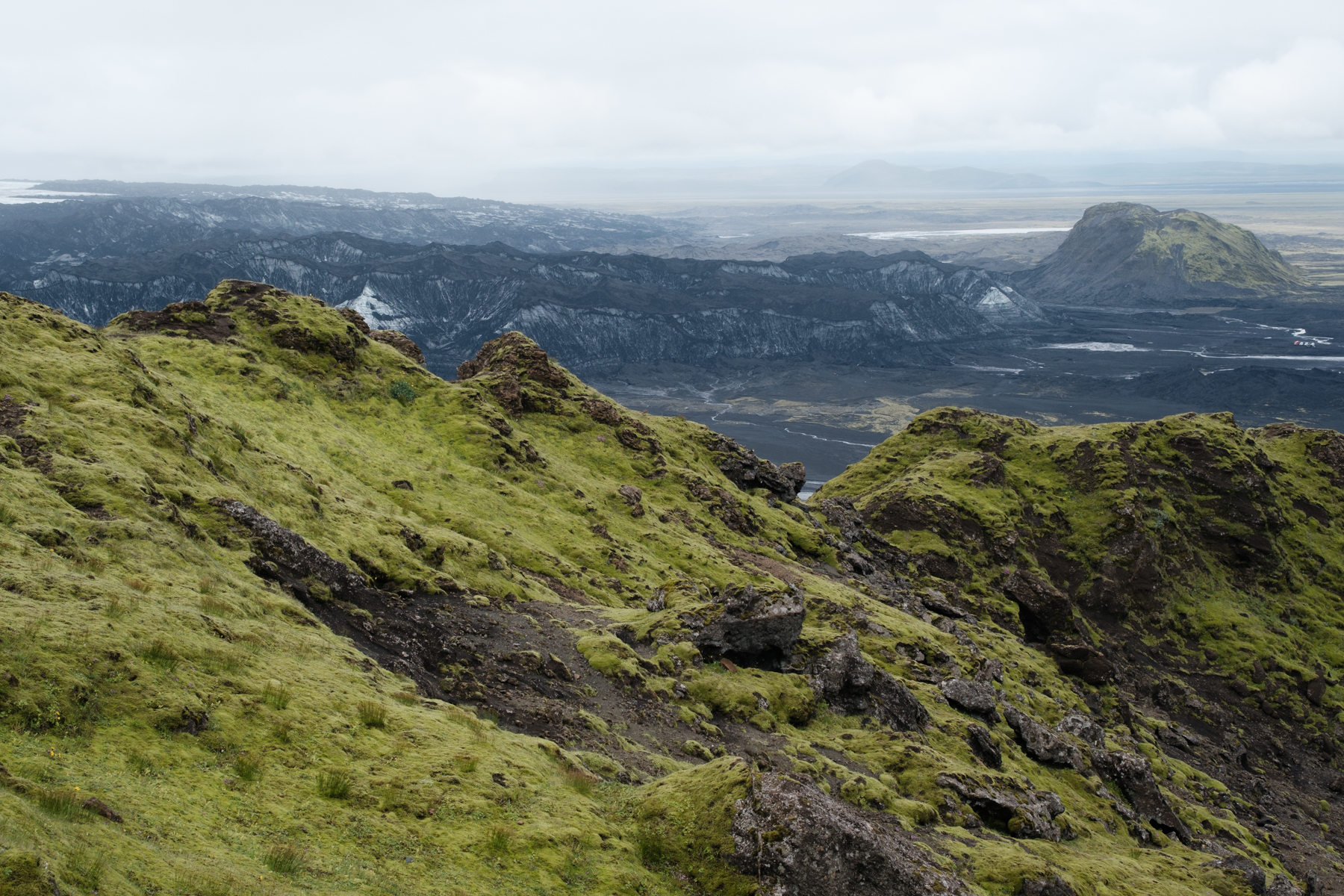 During our stay, we also did the Remundargil trail. Normally a 12-kilometre hike, there’s a shortcut: you can drive from Þakgil to the Remundargil canyon, then continue up to the viewpoint overlooking the Kötlujökull glacier before turning back the same way — which is exactly what we did. As we hiked, mist settled on the textured mountains, giving everything an almost otherworldly vibe. At the top, the view was stunning — and a little alarming. You don’t need exact statistics on glacier melting to know the situation is dire; in a decade or two, standing at this very spot, you might not see the glacier at all. Best to soak it in while we still can.