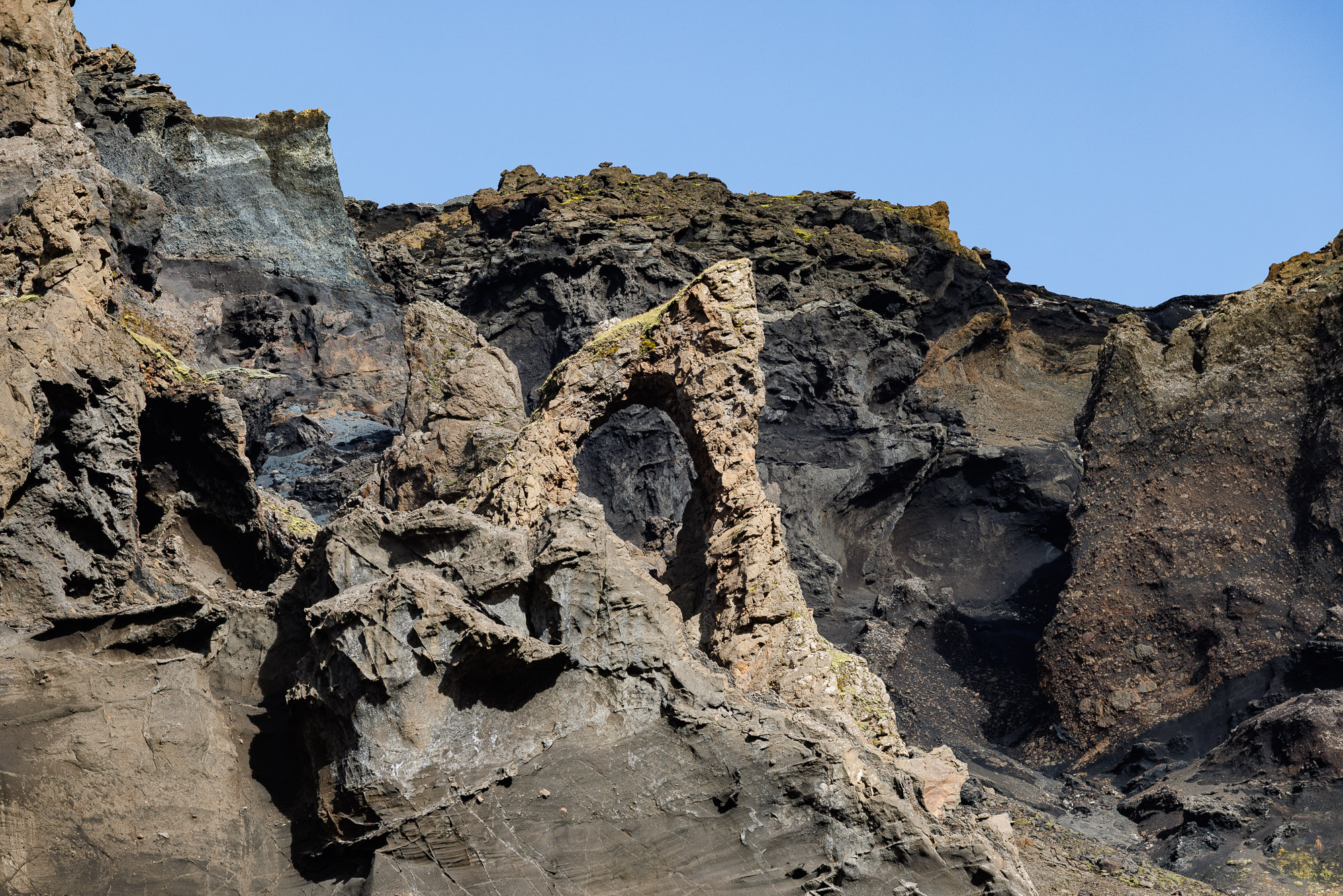 In about an hour, maybe an hour and a half, we reach the glacier. The landscape shifts slightly as we approach — the rock formations become otherworldly, crooked and curved, less mossy, and more deserted. The ground changes too: moss gives way to black quicksand. A few times, as I lift my leg to cross a stream, the ground collapses beneath my feet. One huge rock looks like a human-sized sculpture; another formation has a hole in the middle. I tease Art for a challenge: “Could you fly your drone through this hole and onto the glacier? Would make for an epic opening shot.” Art, who’s been carrying more equipment than all of us, gives a tired look and says, “I’m sure I’d just crash it.”