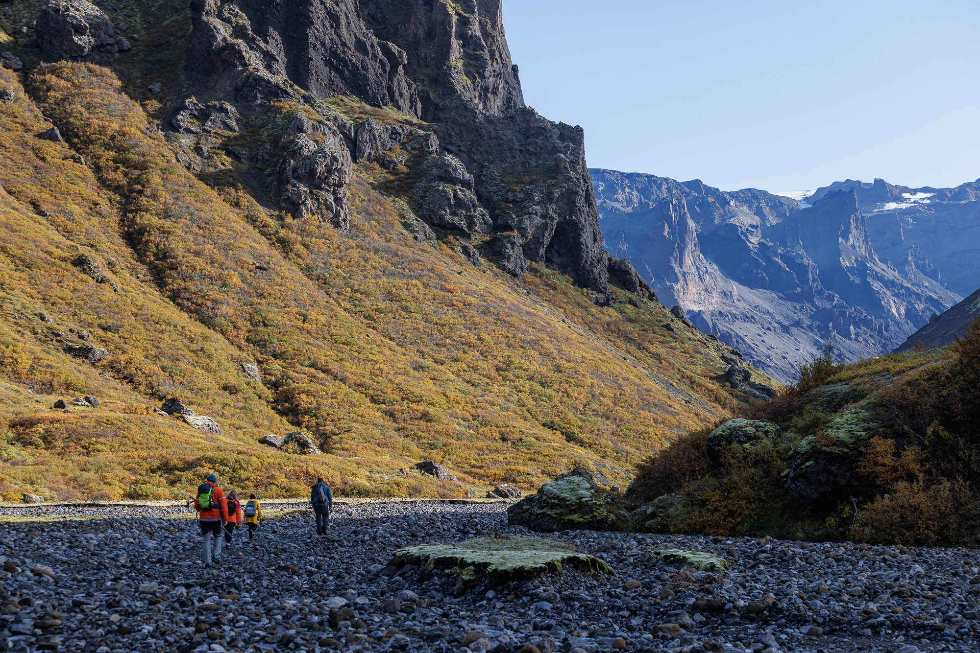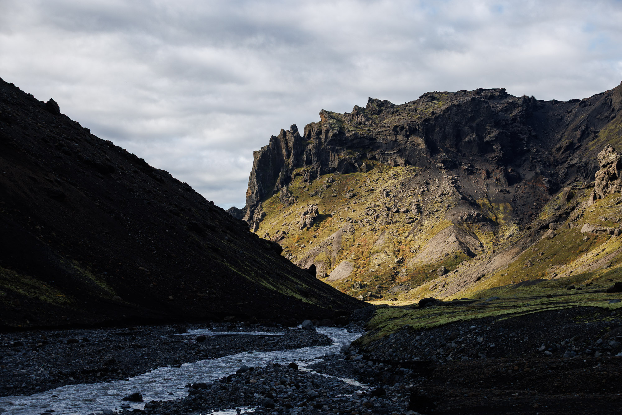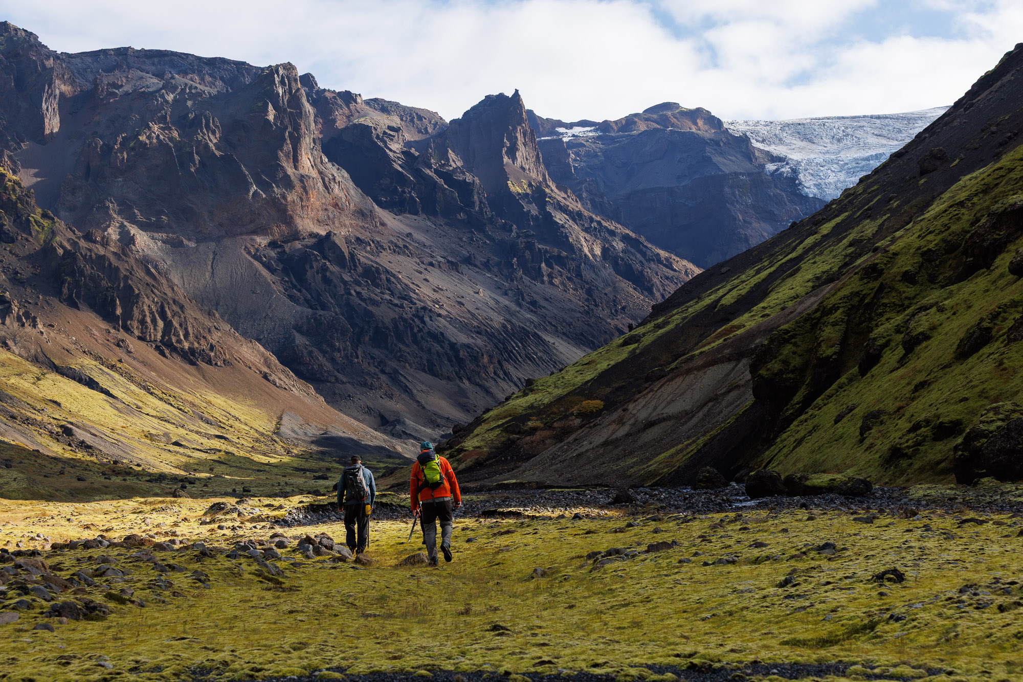 The rest of the hike is along a flat valley, with views that take my breath away. Everything looks like it came straight out of a Jehovah’s Witness pamphlet — if you’ve never seen one, imagine the world dialled up a few shades. The moss is greener, the sky bluer, the cliffs more sculpted. Krossárjökull looms in the background.