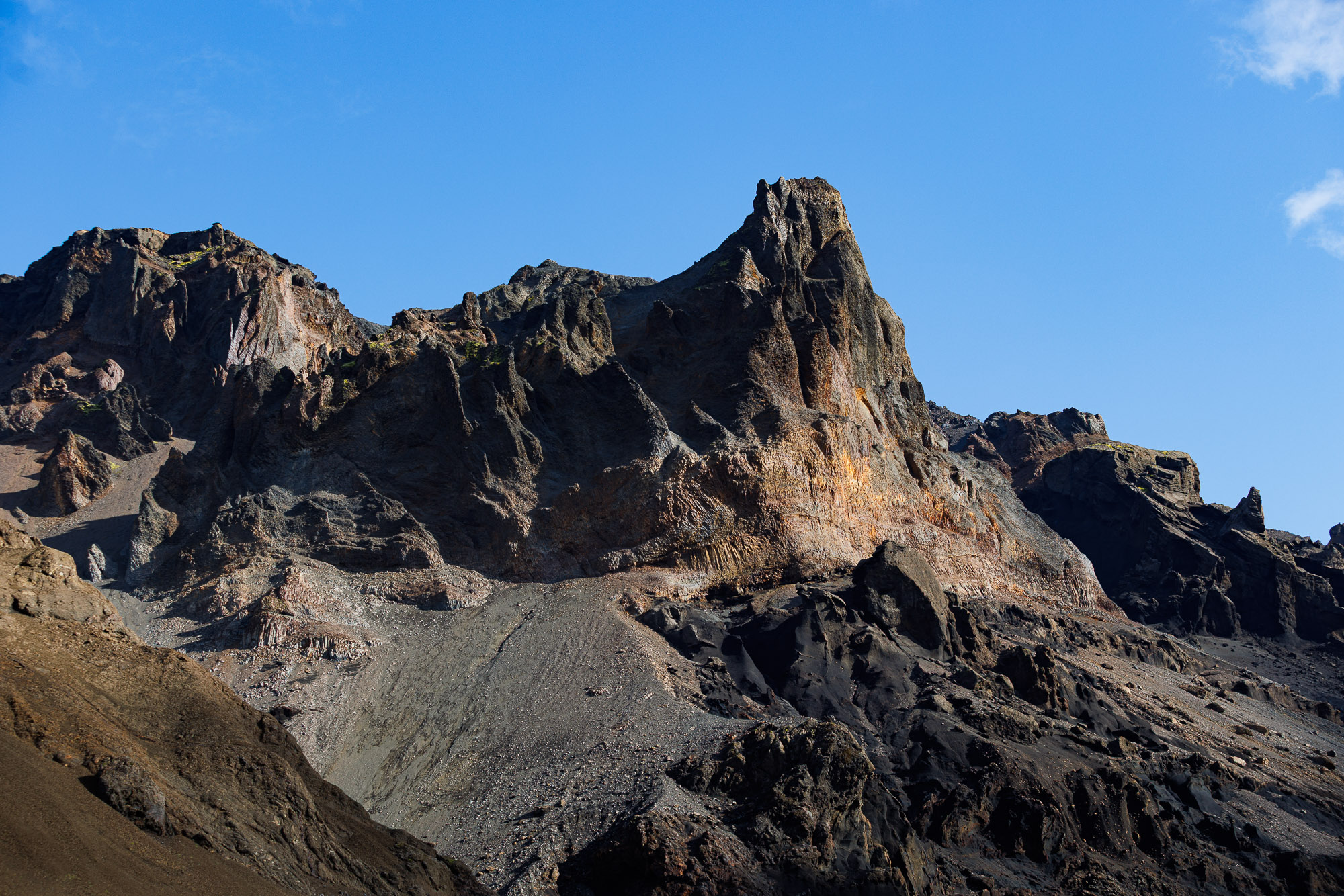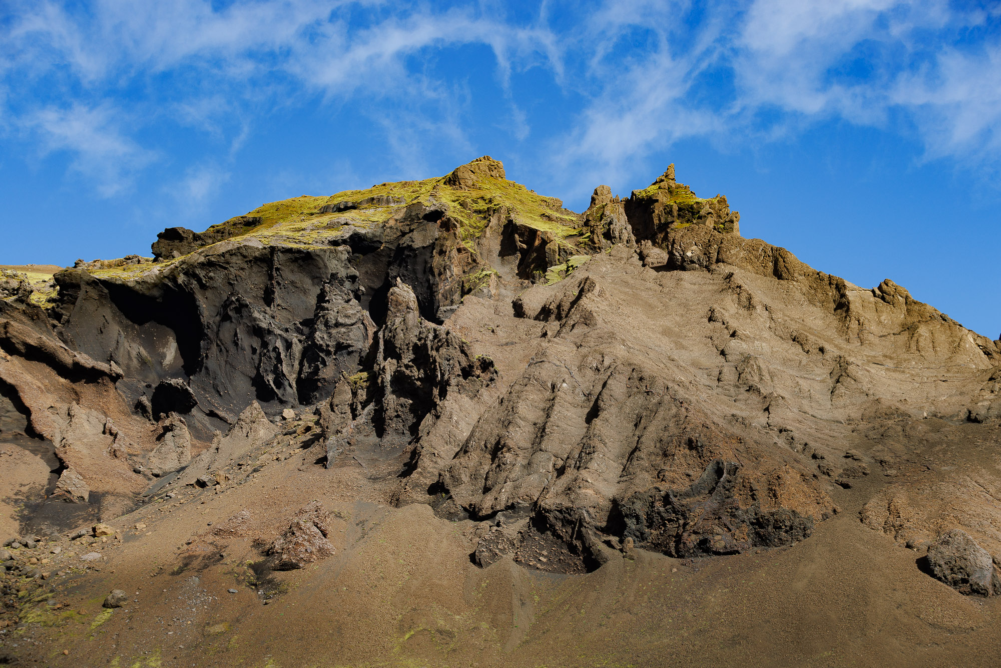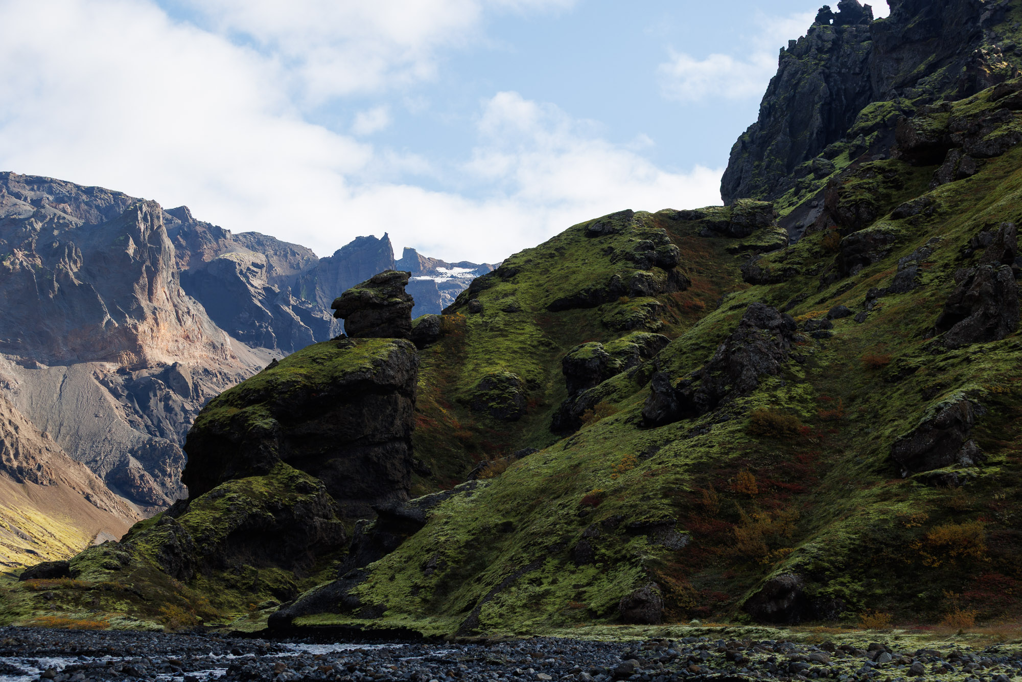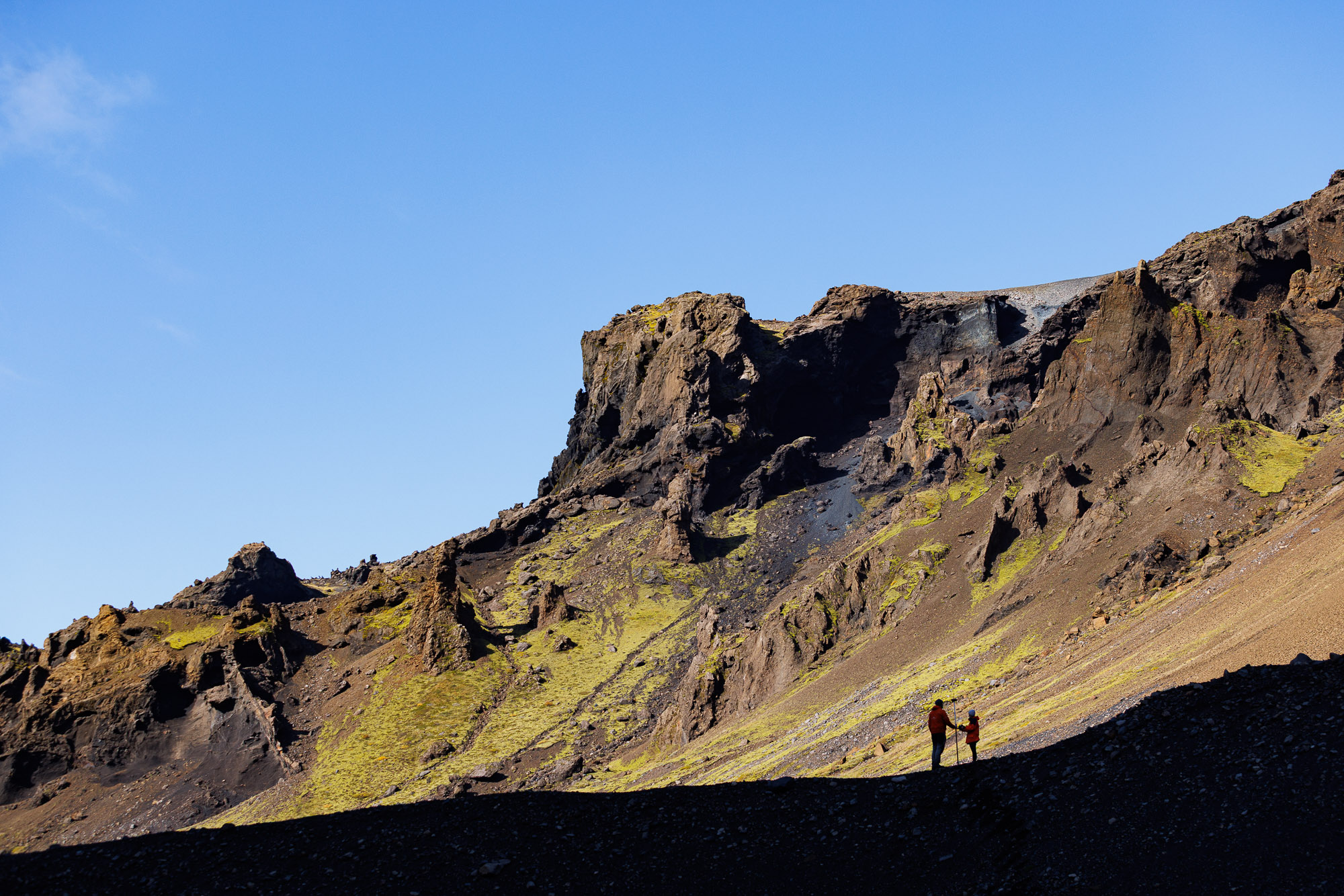 The rest of the hike is along a flat valley, with views that take my breath away. Everything looks like it came straight out of a Jehovah’s Witness pamphlet — if you’ve never seen one, imagine the world dialled up a few shades. The moss is greener, the sky bluer, the cliffs more sculpted. Krossárjökull looms in the background.