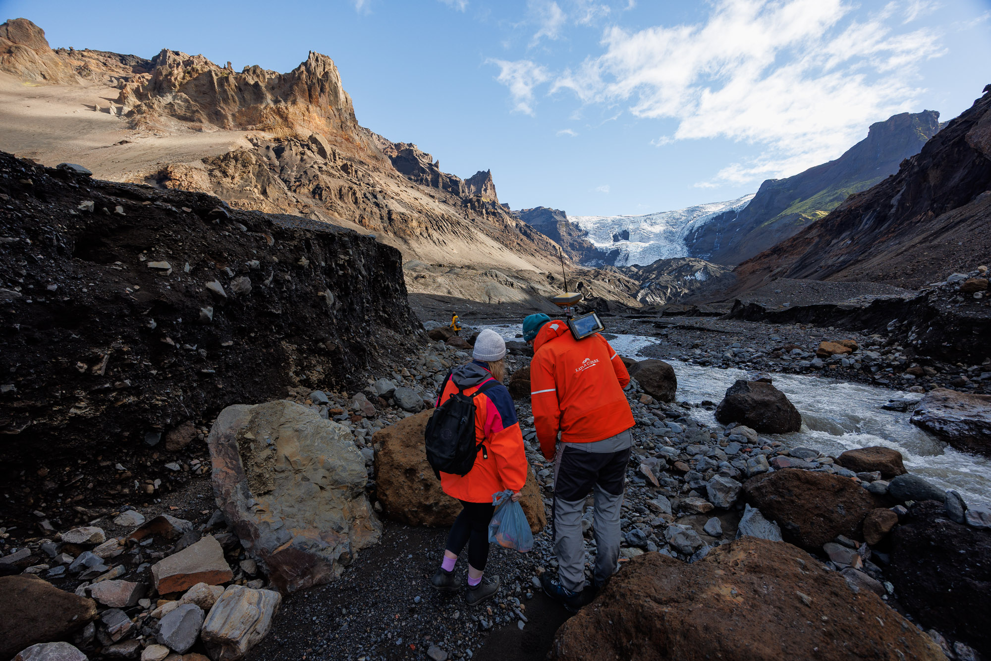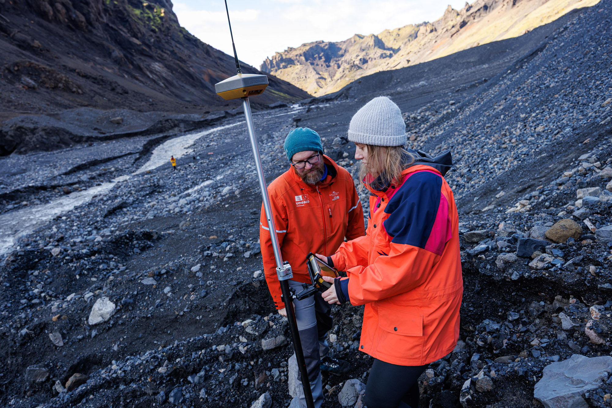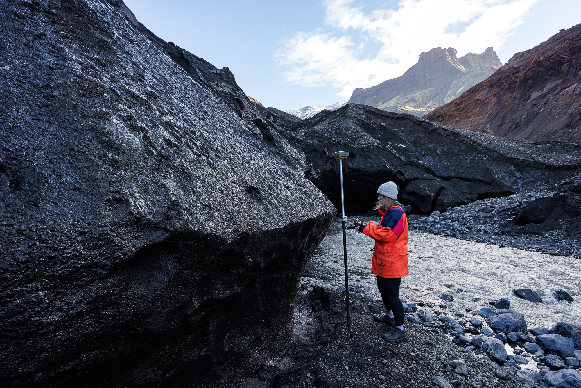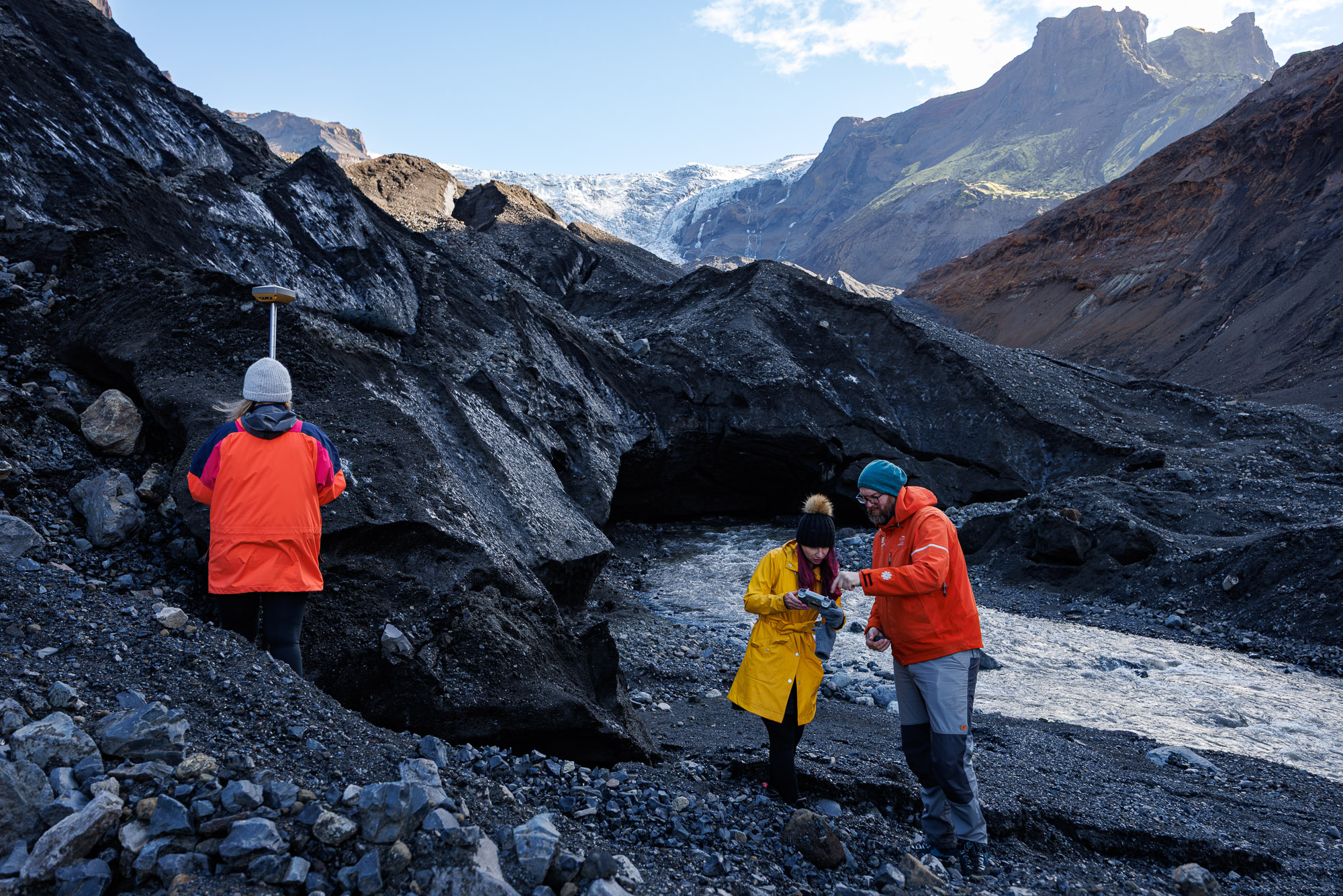 First, we need to take some drone shots of the area. He tells Art, Ann, and me to stand at specific distances from one another to form a rectangle. Jóhannes maps GPS coordinates at all four corners, the last one being his own, and then Ann proceeds to take drone photos of the designated area. She captures 90-degree-angle shots from 100, 200, and 300 metres high. “All of that is impactful information, and we’re able to kind of stitch things together and get a full profile and understanding of what’s happening across Krossárjökull today,” Ann explains.