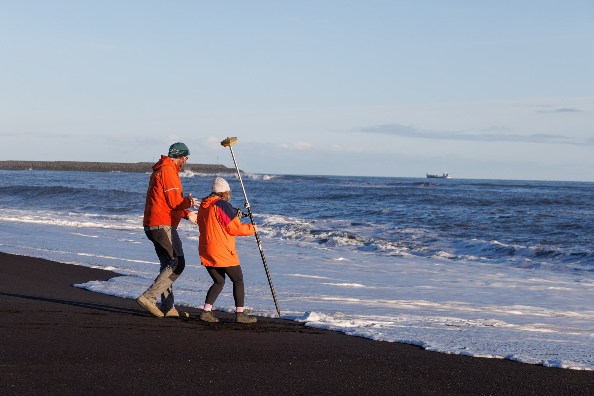 I start near a wooden shipwreck — I’m told it’s a Danish supply vessel that stranded here about 100 years ago — and make a GPS mark every three steps or so. I continue this way until I come dangerously close to the waves. “I can do one more so you don’t get wet,” says Jóhannes, running into the water to take a final mark before the next wave hits the shore.