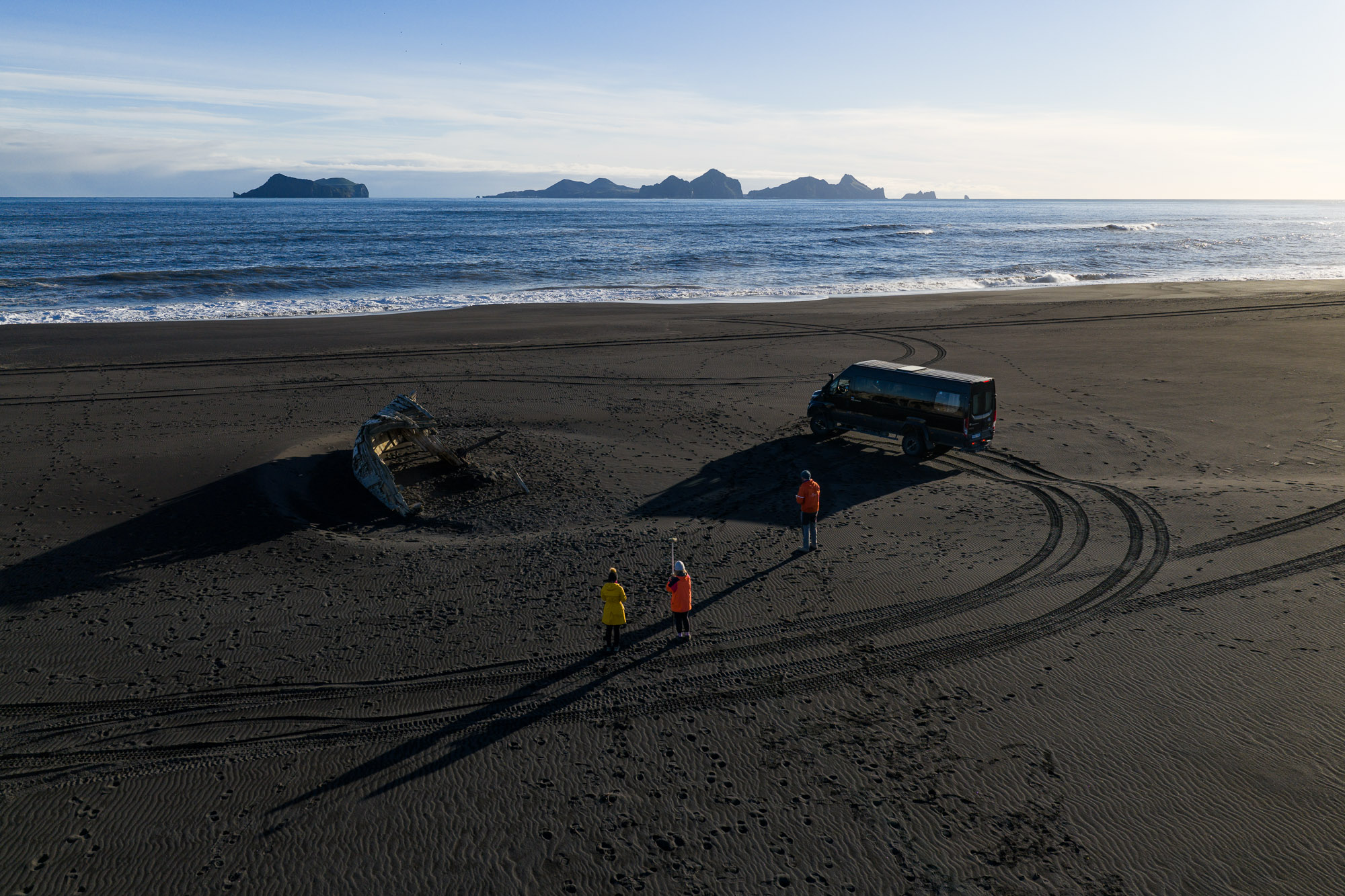 On the way to the coast, the weight of the eventful day hangs in the air — everyone moves a little slower and mostly keeps silent. But once we arrive at Landeyjasandur, we get a burst of energy. It’s a glorious day to be at the beach.