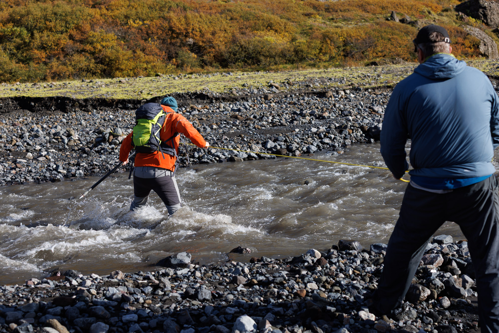 But I also don’t want to be the person slowing down the group, so I grab the rope Davíð is holding on the other side and, gripping it, take my first step. I try to keep balance and make sure my foot is secure before taking another step. The river gets deeper, and, in the middle, it’s well past my knees. A few more steps, and I’m safe on the land. Jóhannes gives me a high five.