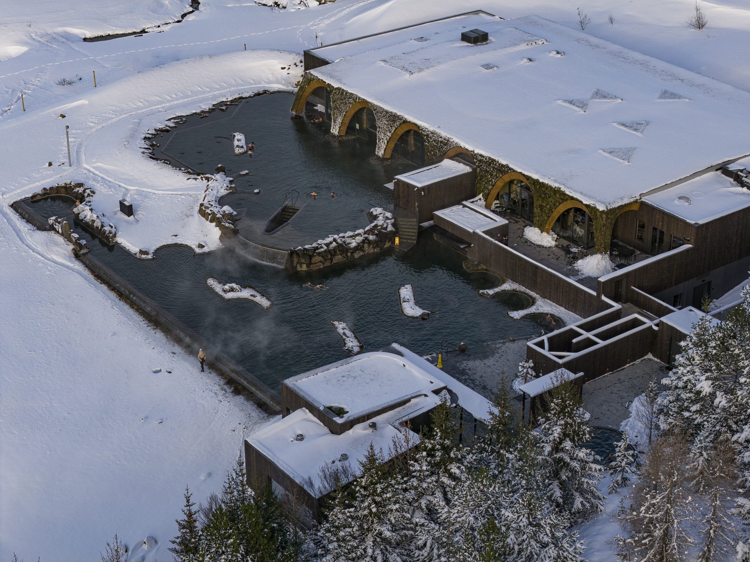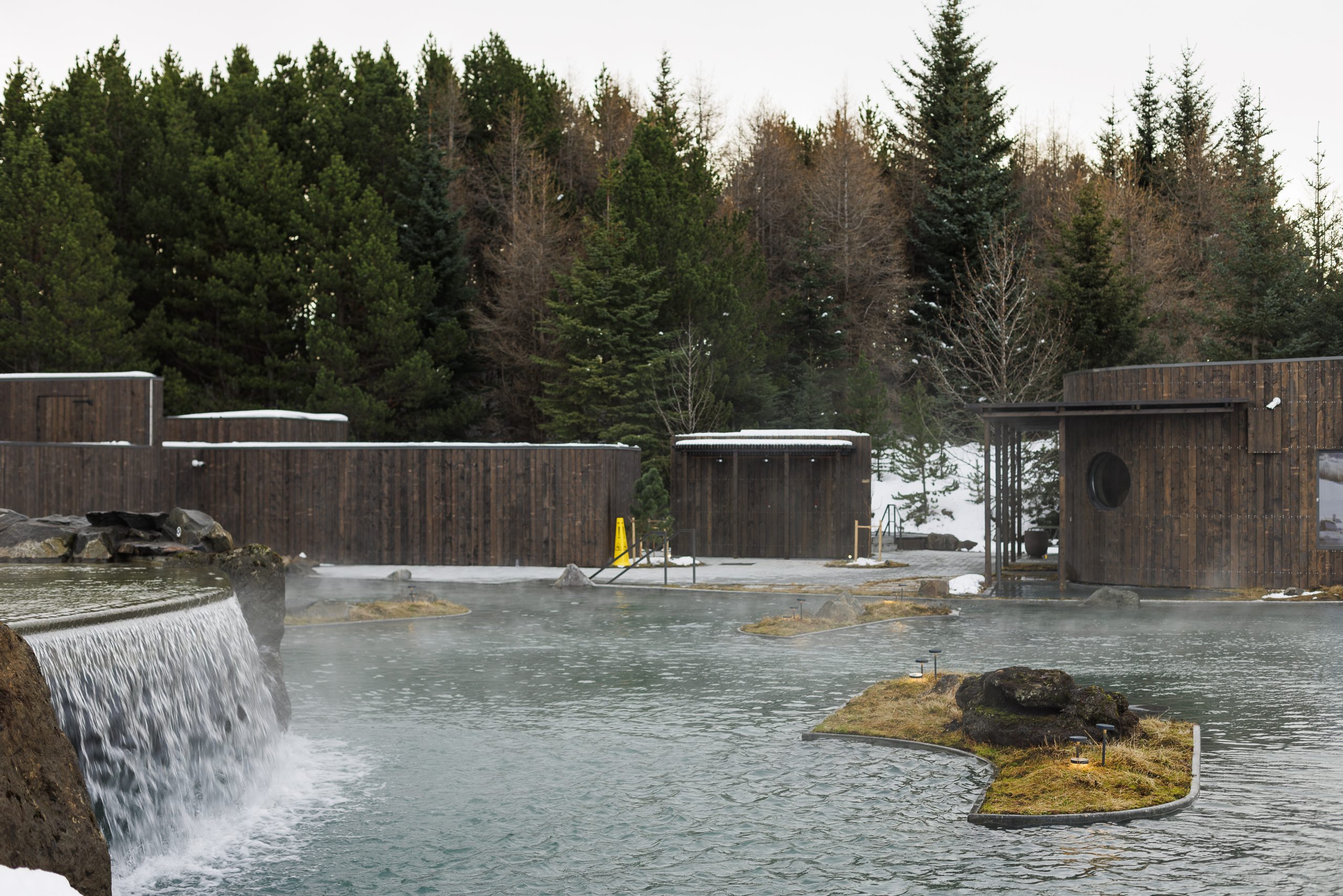 First, you enter an infinity pool that overlooks the Hvítá River valley and a massive suspension bridge. I’m told that at night, when the bridge lights up, or if you’re lucky enough to spot northern lights, which in 15 days since the lagoon opened has happened several times — the view is spectacular. In the best tradition of Icelandic lagoons, there’s, of course, a swim-up bar. But the most interesting feature of Laugarás Lagoon is yet to come: this is only the upper level. There’s a lower level too, making it basically a two-story lagoon. To reach it, you can either take the stairs or venture under a cascading waterfall. “This is a bit like a river path,” says Bryndís. “You come out at the top of the river, and you sort of, slowly move further and further down.”