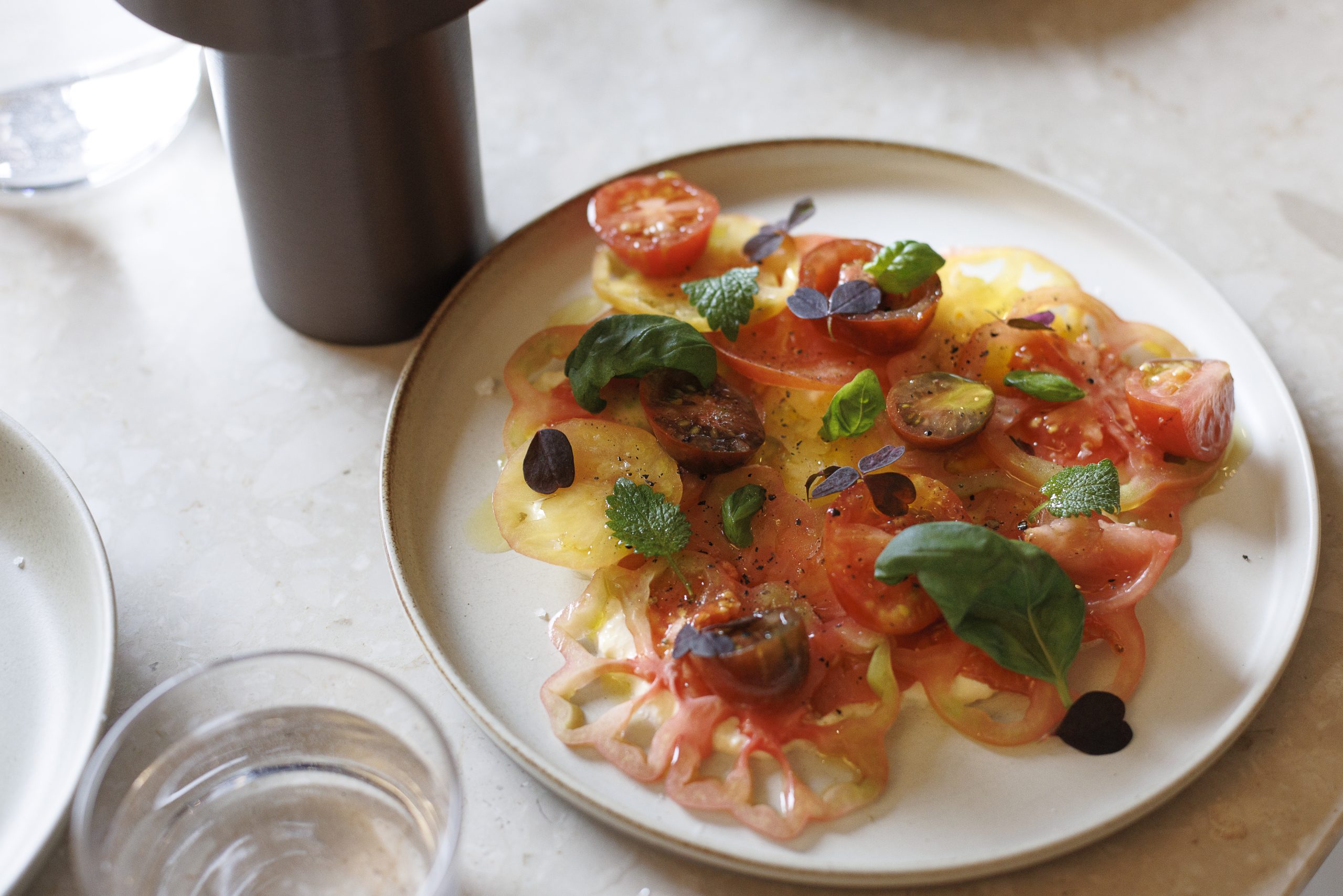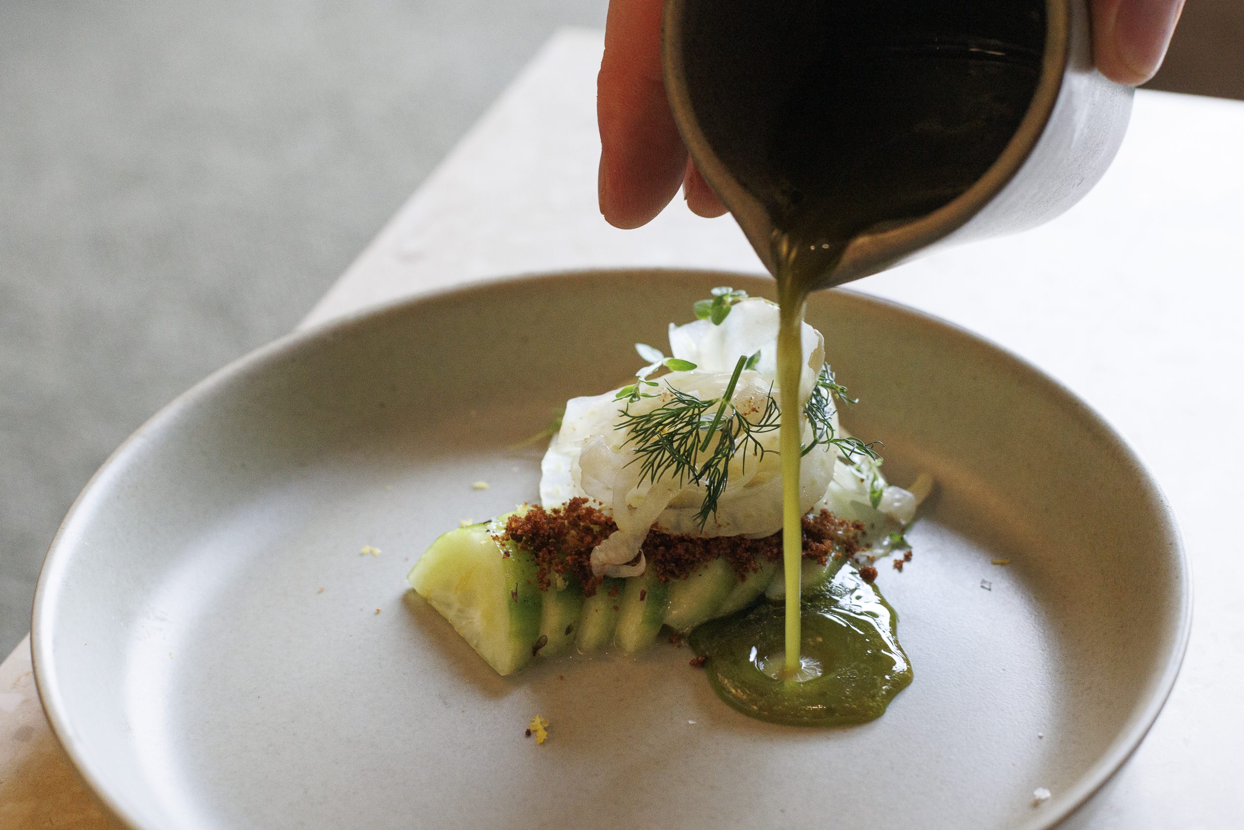 We start with a salted cucumber with fennel, rye crumble, herb vinaigrette, and whey — a by-product of skyr; reduced by half, it has the same acidity as a lemon. “A lot of it is just going down our drains, and the sea is always getting more and more sour every year, so to put it back into the food cycle is actually really good,” Gísli explains. Simultaneously, a “humble tomato carpaccio” layered on fresh cheese arrives, and instantly becomes my favourite dish of the day. It’s hard to believe something so simple, basically effortless, can pack so much flavour. The trick here is slightly fermenting the tomatoes.