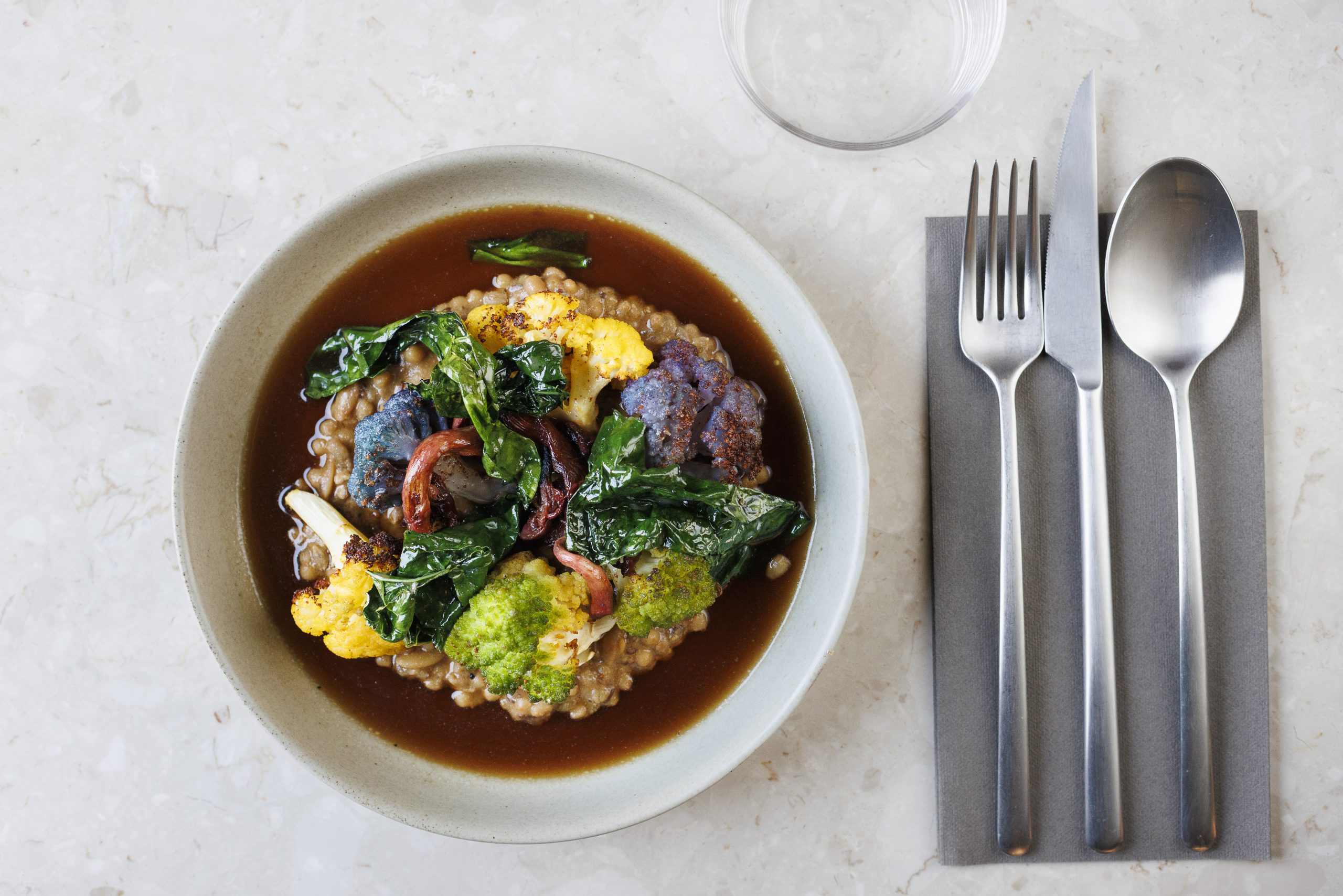 For the main, I get a few different types of cauliflower served over barley porridge made with mushroom and seaweed broth, topped with grilled oyster mushrooms. It’s weird, unusual — but it more than works. Fresh and deeply umami.